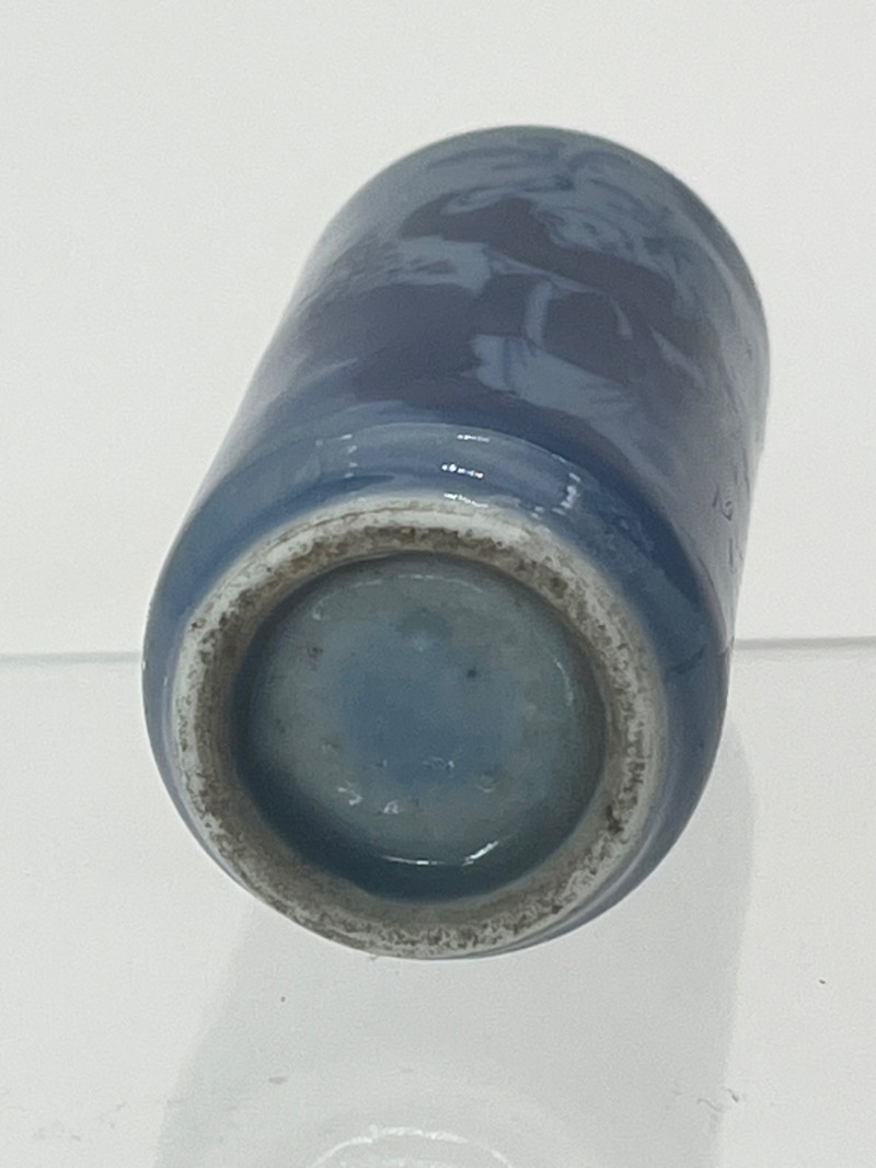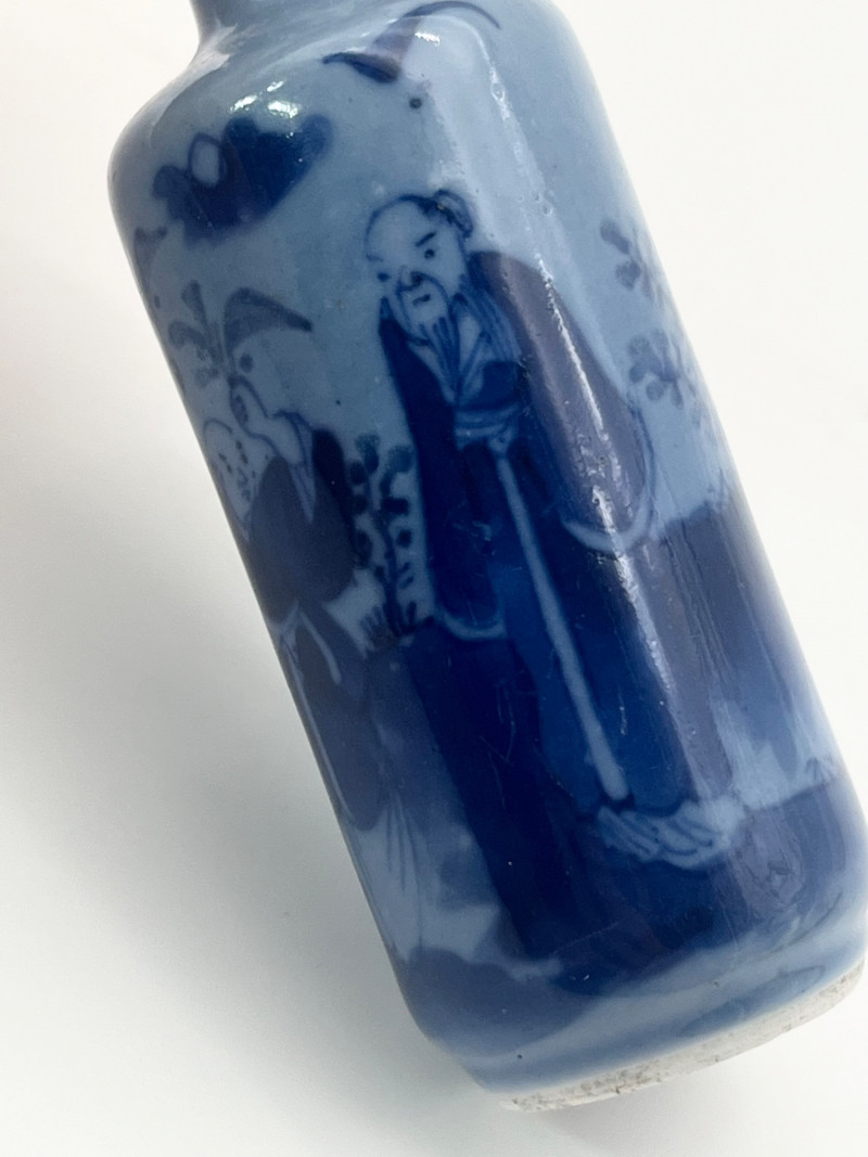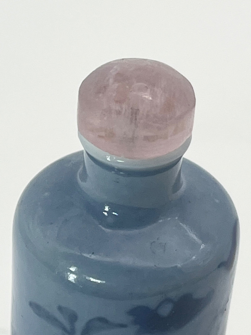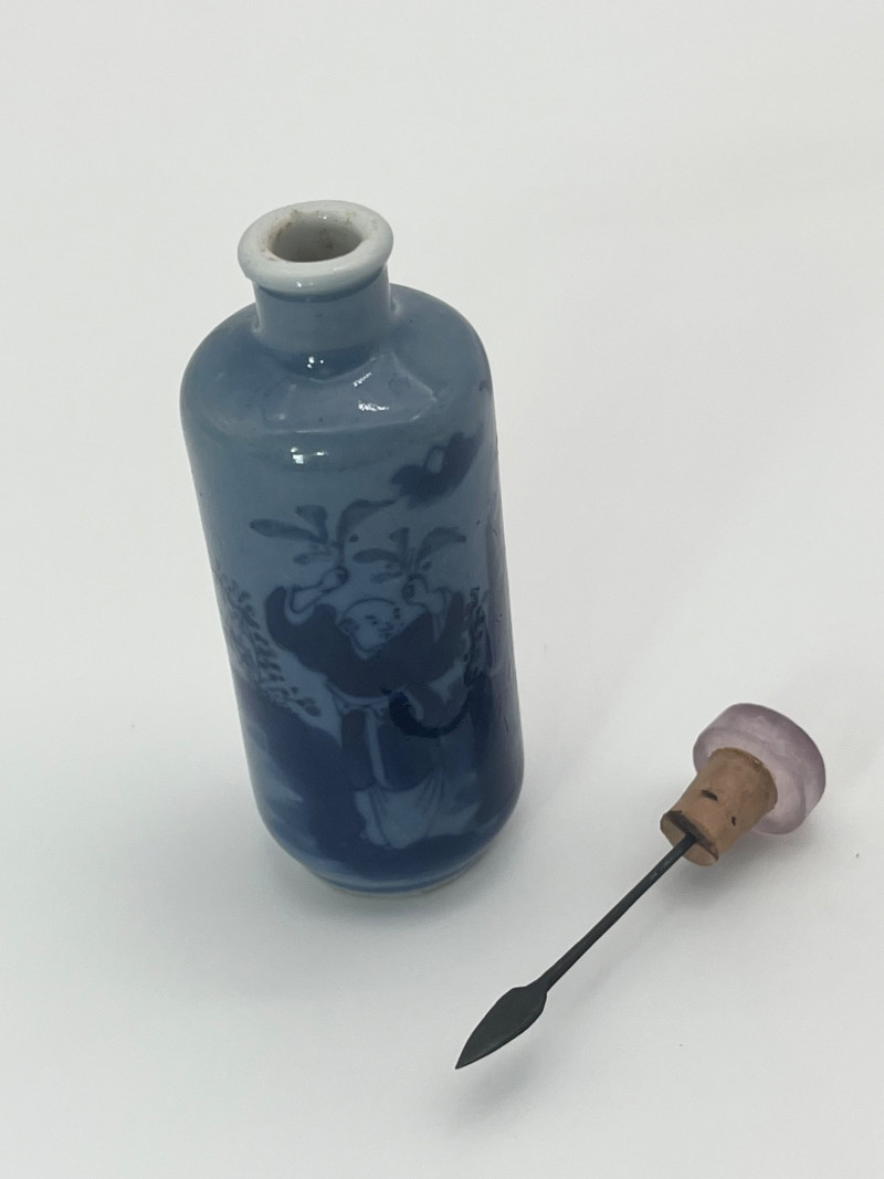 Antique Blue Underglaze Ceramic Snuff Bottle with Amethyst Stopper This bottle has a blue glaze over white ceramic and is in good condition. The wear on the bottom and artistic style indicates that this piece dates to the mid to late 19th century, late Qing dynasty. The amethyst lid, cork stopper, and bamboo stopper (dyed black) are all in good condition and look to be the original as they are of matching circumference. In Chinese culture, like with many cultures, purple amethysts are associated with wealth and good fortune and more specifically, positive energy and mental health. Age and provenance of this bottle is unknown. 3 1/4" tall, 1 1/8" wide.