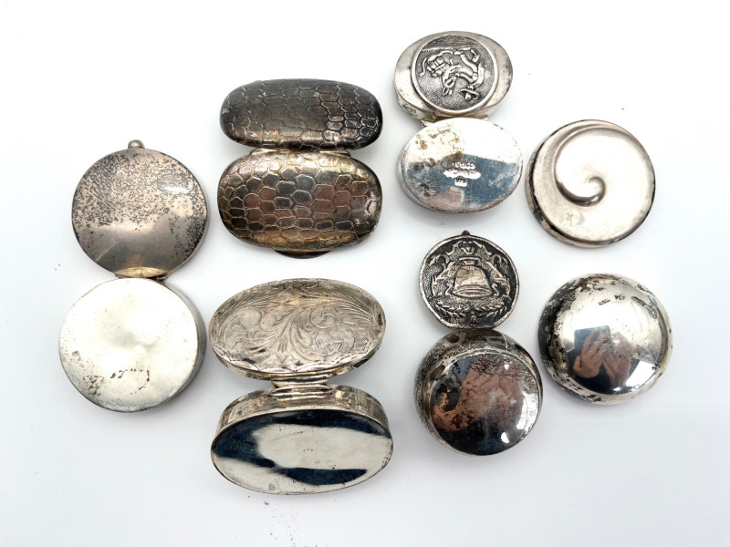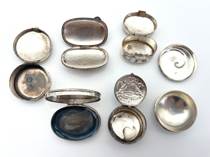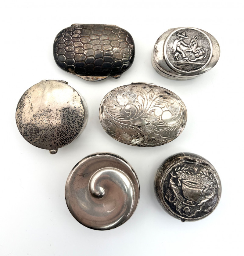 Sterling Silver Pill or Snuff Boxes Set of 6 This collection of pill boxes are all 100% sterling silver and there are 6 different types and styles. All 6 have the 925 purity stamp somewhere on the piece and I try to show each stamp in photos. The total weight of these is 131 grams.