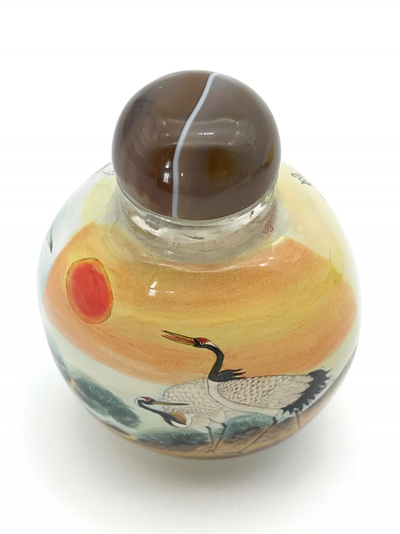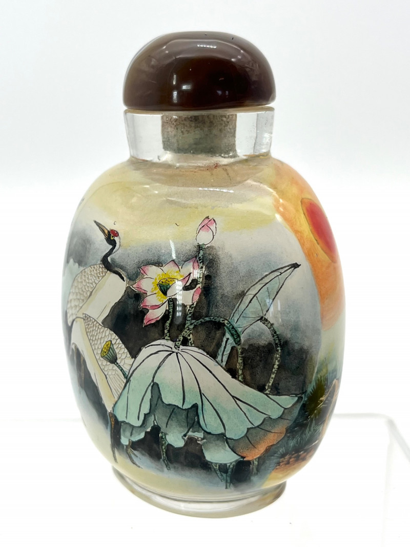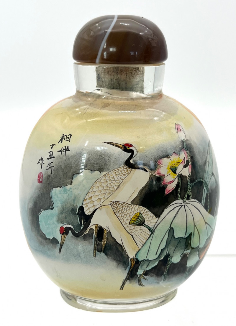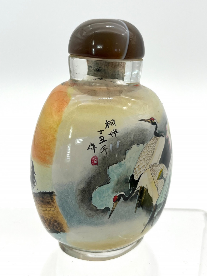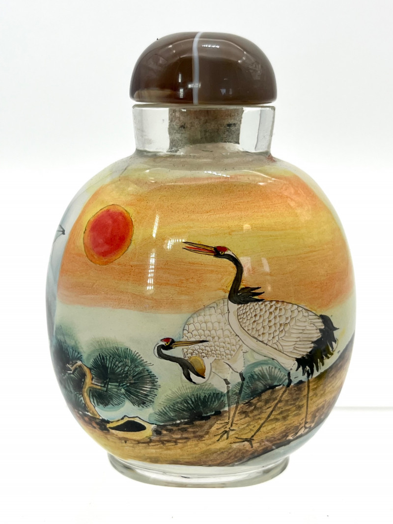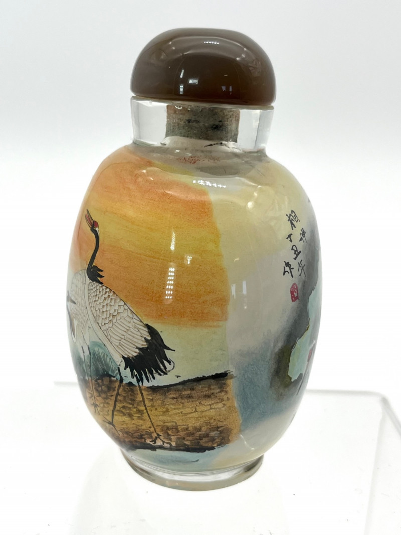Reverse Painted Snuff Bottle with Cranes by Day and Night Reverse painted snuff bottles are made by using specially designed, thin and curved brushes to paint on the interior surface of a clear bottle. The artist paints in reverse, starting with the last detail to ensure proper placement. This painstaking process requires exceptional artistic skill, calligraphy, and a specialized, fine tipped tool that can be manipulated though the bottle's small opening to achieve intricate designs and like lifelike depictions on the bottle's interior wall. This bottle is not only intricately painted but it shows part of a story with two cranes. On the front it shows them together in the daytime, on the other they are together at night, one looking out for the other. The lid is a beautiful brown and white polished stone. This one does not have a spoon. With the lid, it is 3 1/4" tall, 2 1/4" wide.