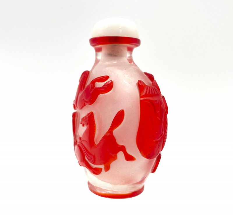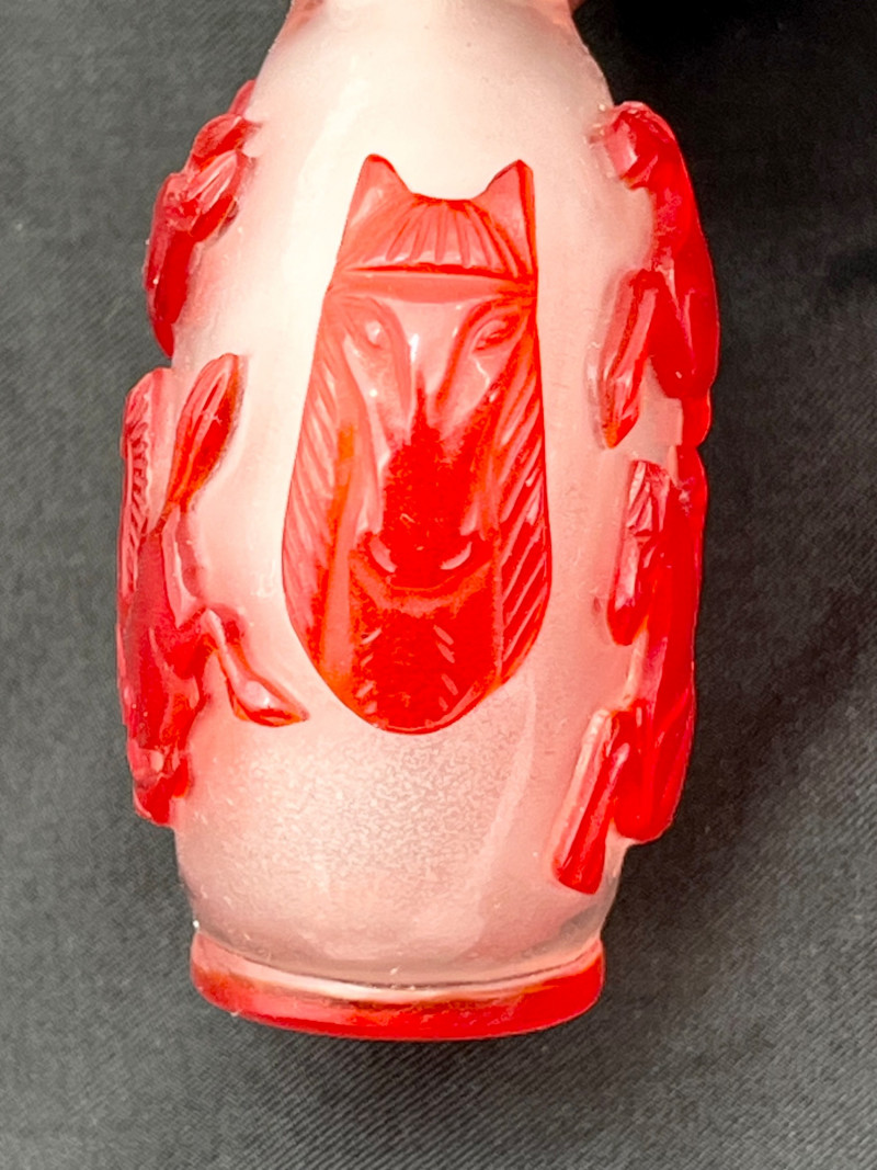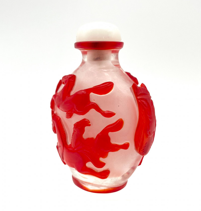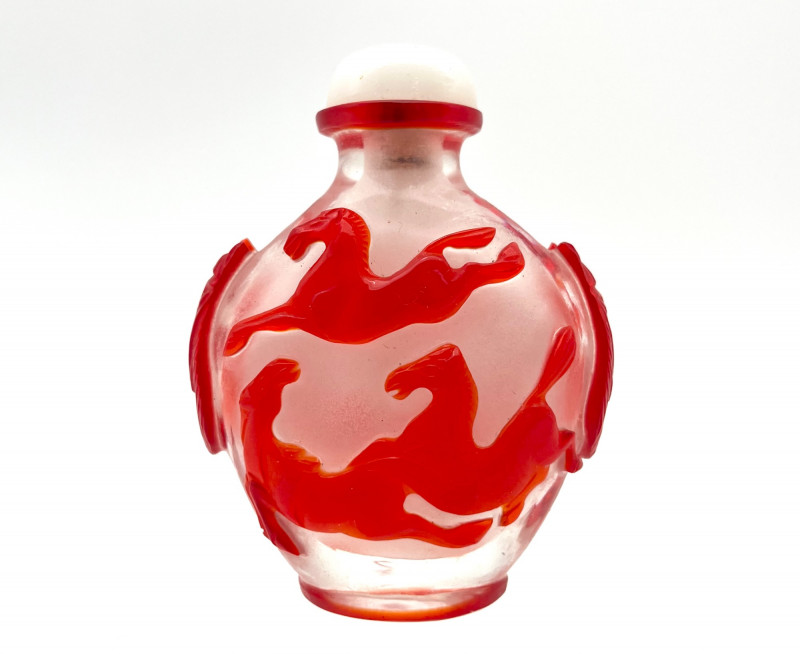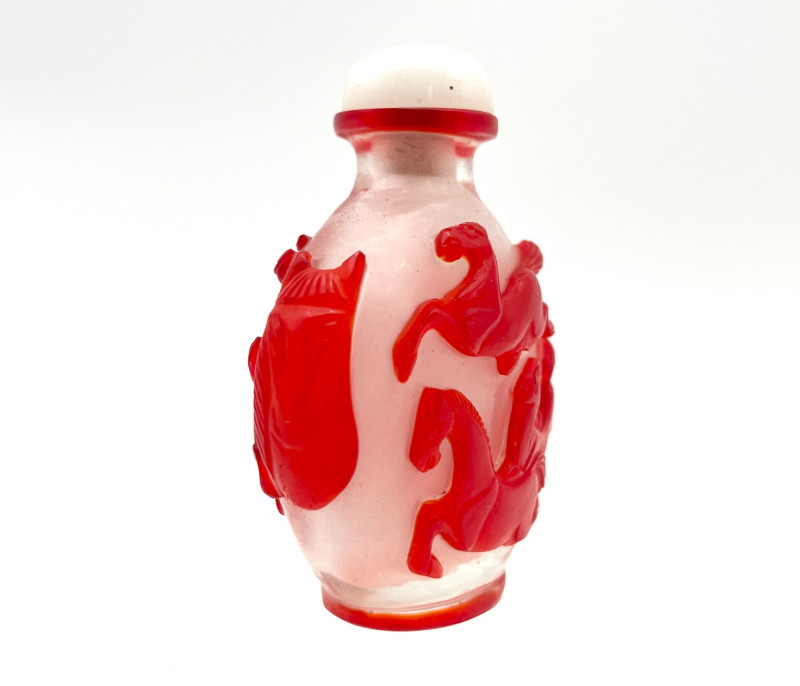 Red and White Peking Glass Snuff Bottle Peking Glass is made by a cameo glass technique where a glass blower creates a core shape and then repeatedly dips it into molten, colored glass to build up layers. Artisans then use jade carving tools to meticulously carve away the outer layers of glass to reveal intricate, high-contrast designs in the underlying colors. The process creates dense, layered glass with a glossy finish, used for items like snuff bottles, vases, and figurines. For tiny snuff bottles, the center is usually also carved out, another painstaking part of the process. This bottle has a bright white base with a brilliant red making up the outer layers. The designs on all sides are horses and the bottle has a red band at the top rim and bottom giving it an overall well finished look. Even though this was created as a functional item, this is truly a piece of art! The bottle with it's glass lid stands 3" tall. The lid, stopper and carved bone spoon are all in good condition.