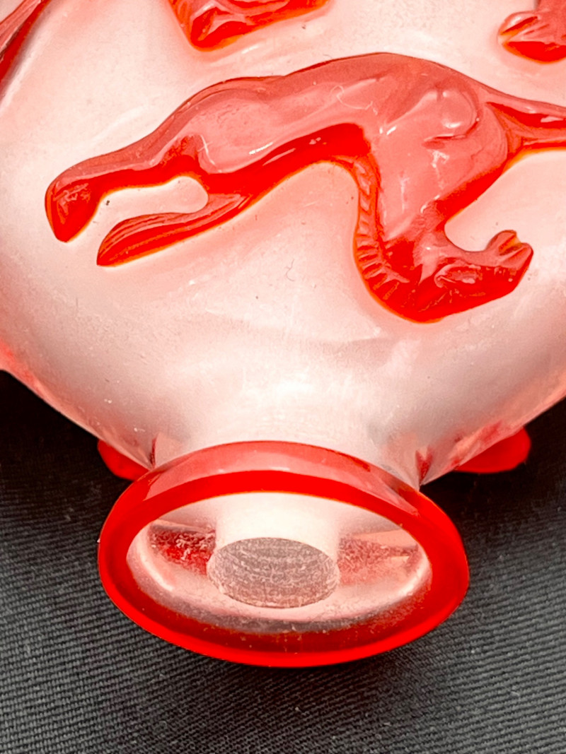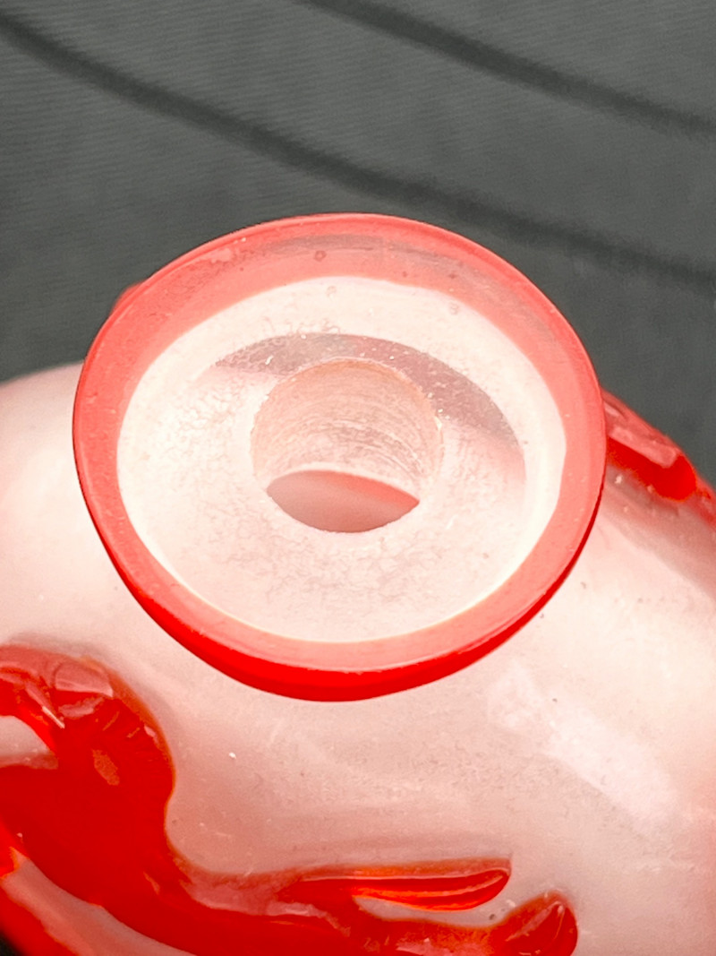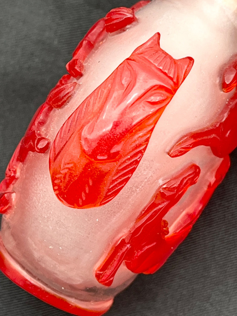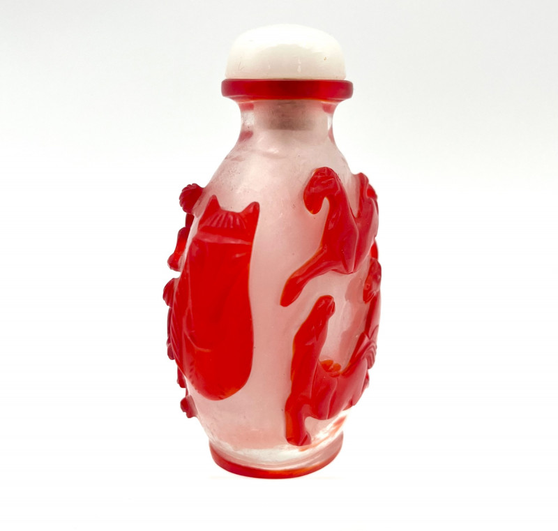 Red and White Peking Glass Snuff Bottle Peking Glass is made by a cameo glass technique where a glass blower creates a core shape and then repeatedly dips it into molten, colored glass to build up layers. Artisans then use jade carving tools to meticulously carve away the outer layers of glass to reveal intricate, high-contrast designs in the underlying colors. The process creates dense, layered glass with a glossy finish, used for items like snuff bottles, vases, and figurines. For tiny snuff bottles, the center is usually also carved out, another painstaking part of the process. This bottle has a bright white base with a brilliant red making up the outer layers. The designs on all sides are horses and the bottle has a red band at the top rim and bottom giving it an overall well finished look. Even though this was created as a functional item, this is truly a piece of art! The bottle with it's glass lid stands 3" tall. The lid, stopper and carved bone spoon are all in good condition.