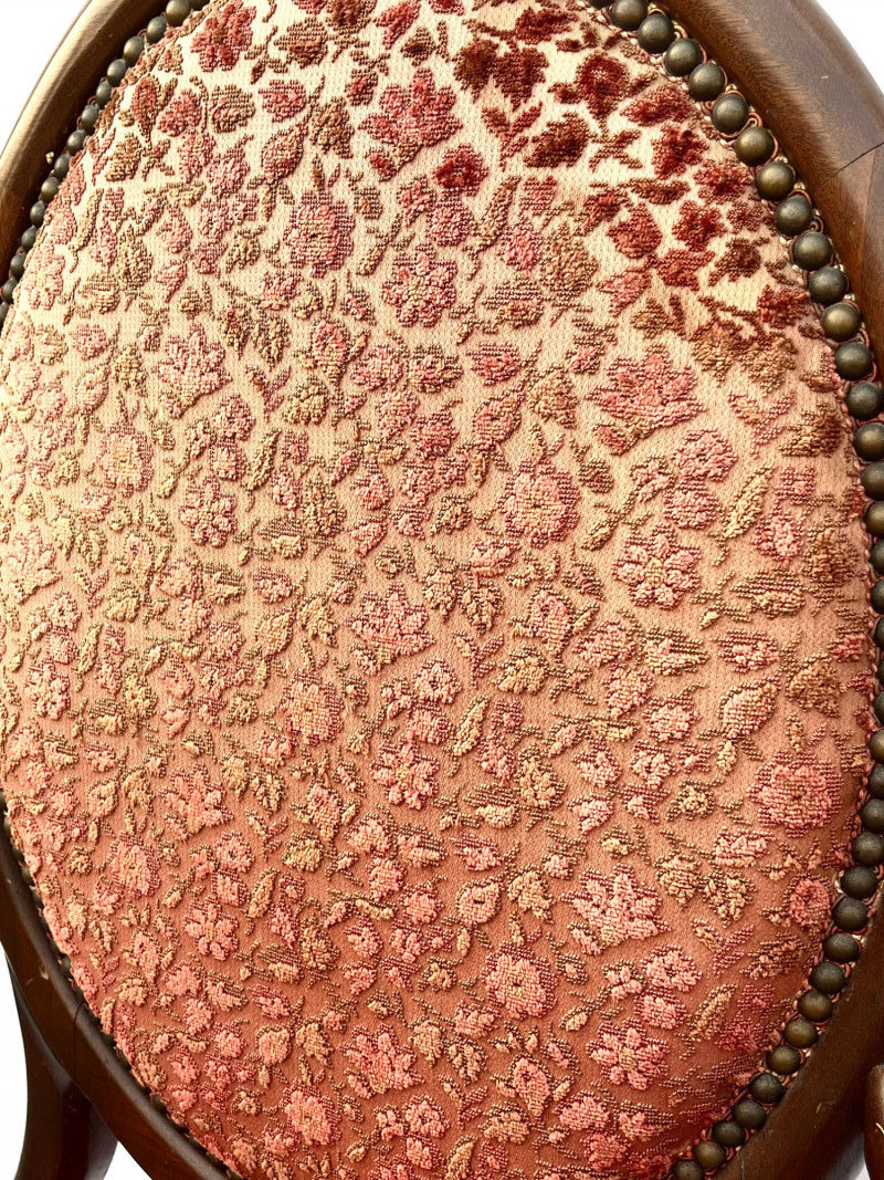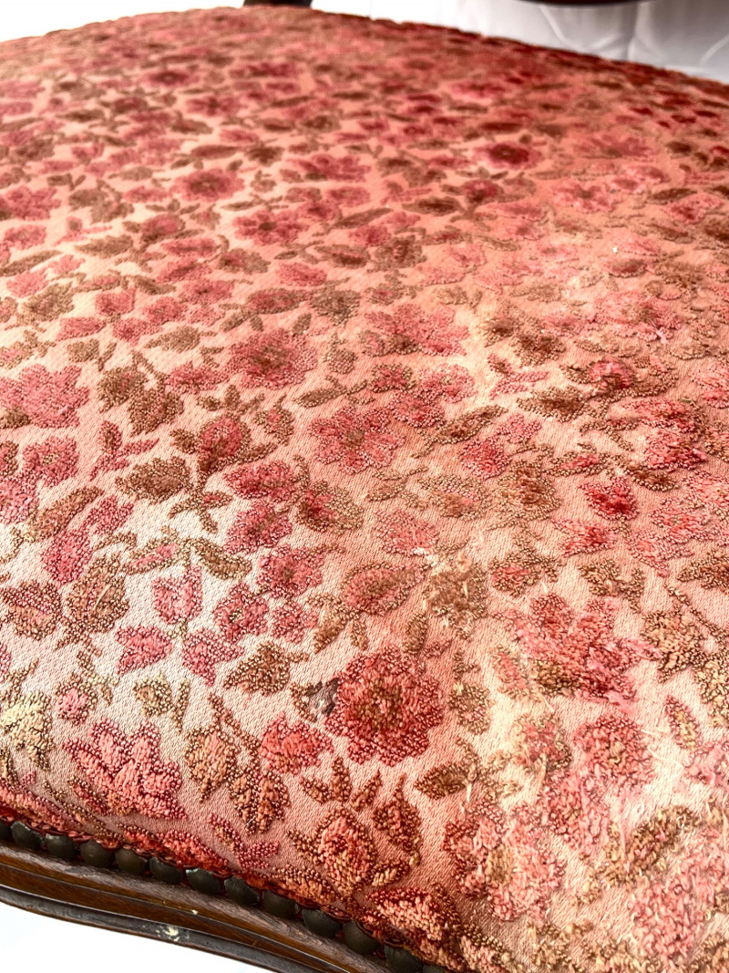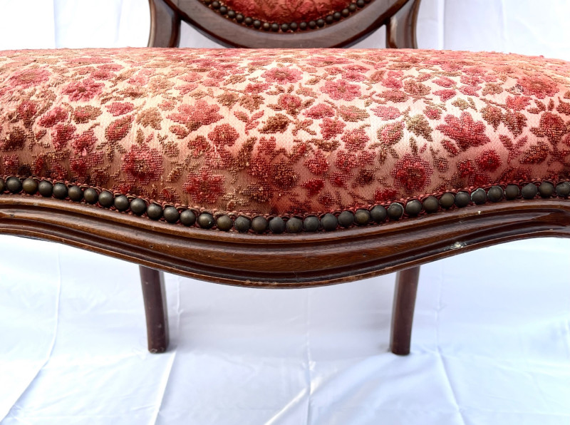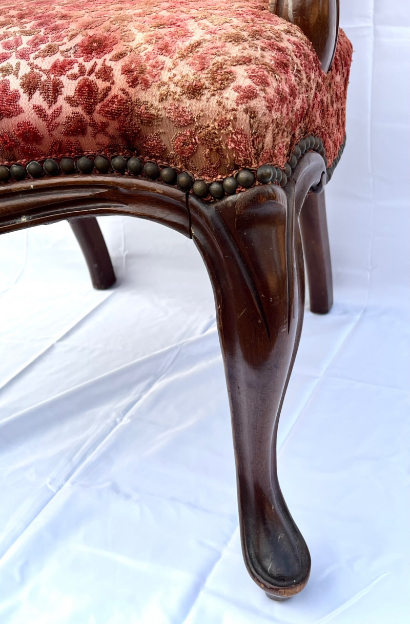 Antique Victorian Era Nailhead and Red Upholstered Chair This piece is in great condition for its age with just a few scratches and scuffs on the wood. The upholstery shows minimal wear and no fading.