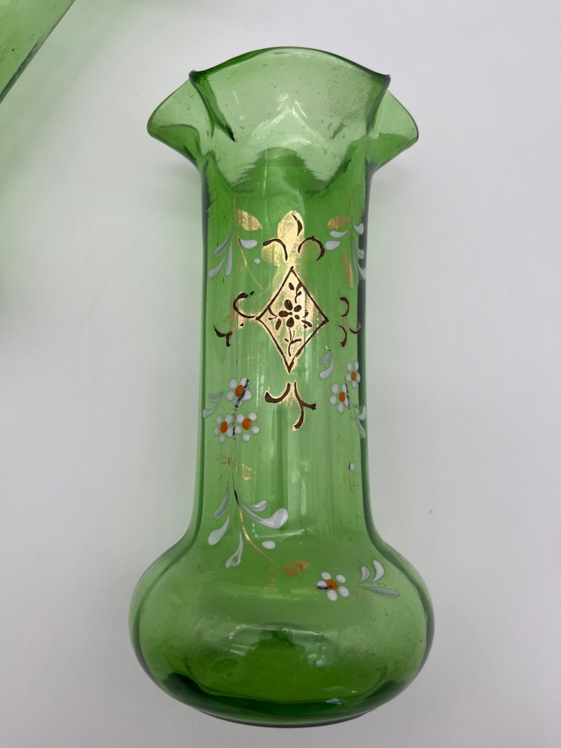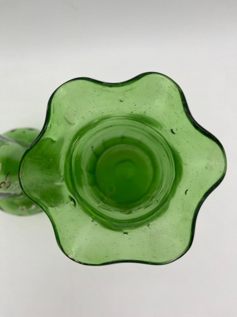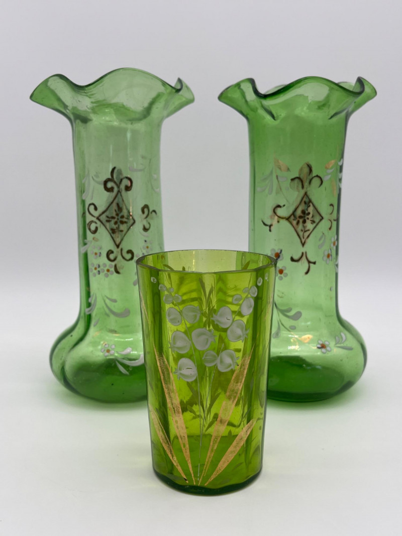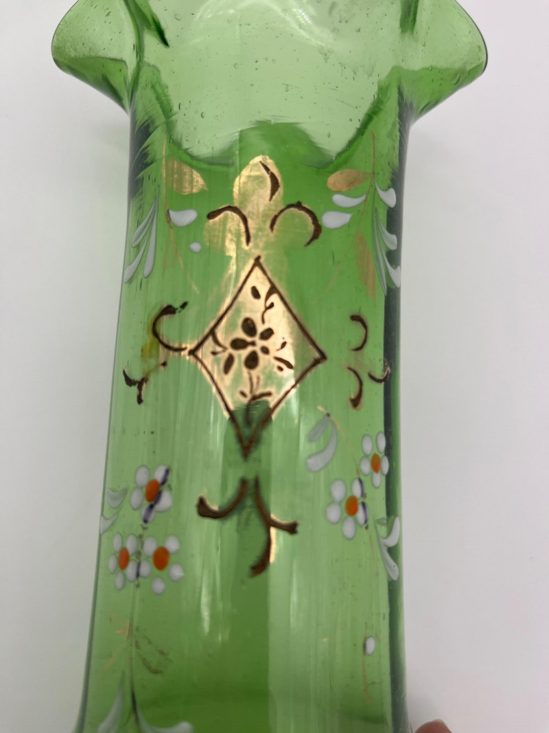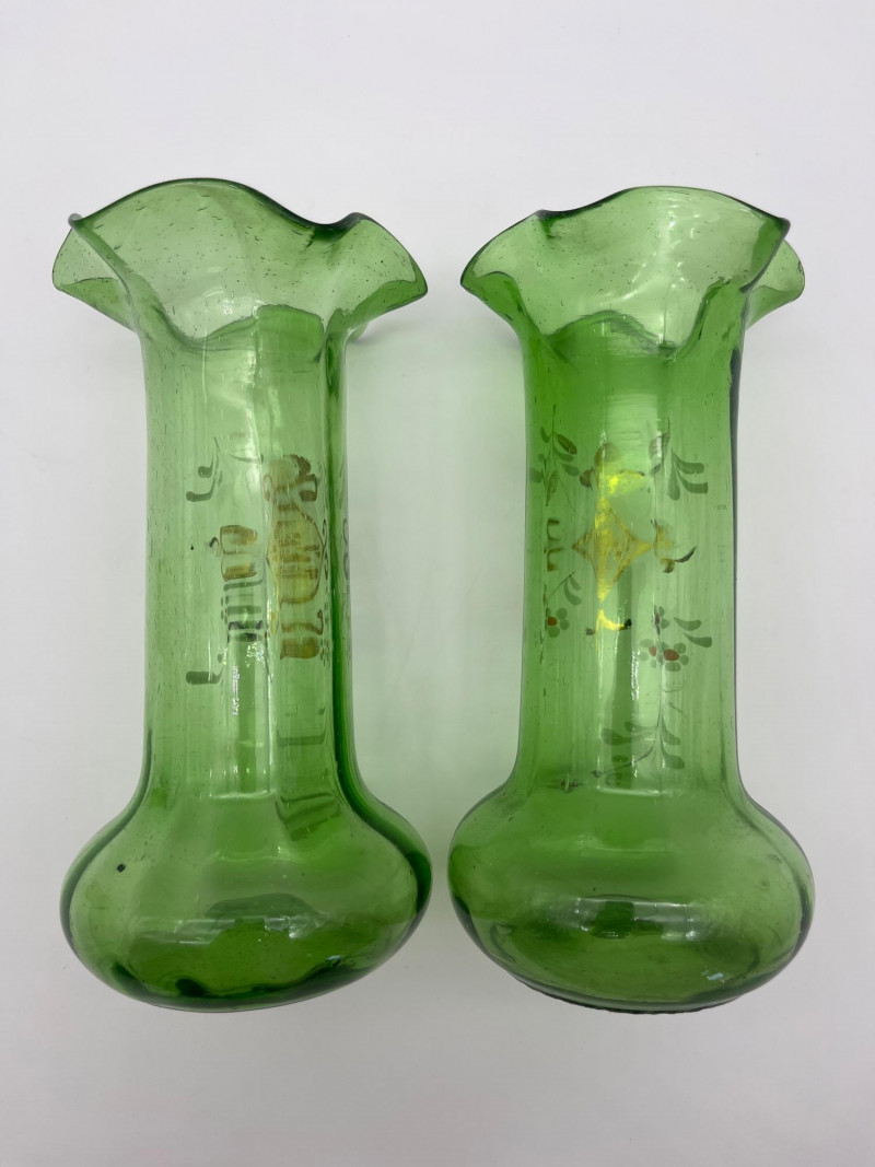 Antique Bohemian Green Ruffle Topped Vases and Drinking Glass Although these do not fluoresce as brightly as some uranium glass, this glass does get its green color from uranium. Did you know that glass makers have been tinting glass with uranium for almost 200 years?! These two vases are in the style made popular in the late 19th to early 20th century Bohemia, painted with floral designs accentuating their hand blown forms. The drinking glass is also a handmade piece but it does not fluoresce in black light like the vases do. All three pieces are in nice condition with no cracks or chips. Vases are 8" tall glass is 4" tall.