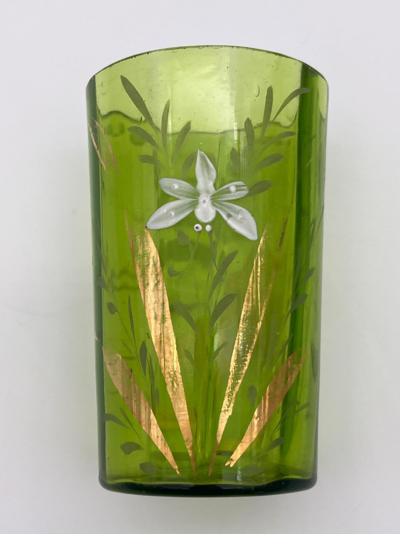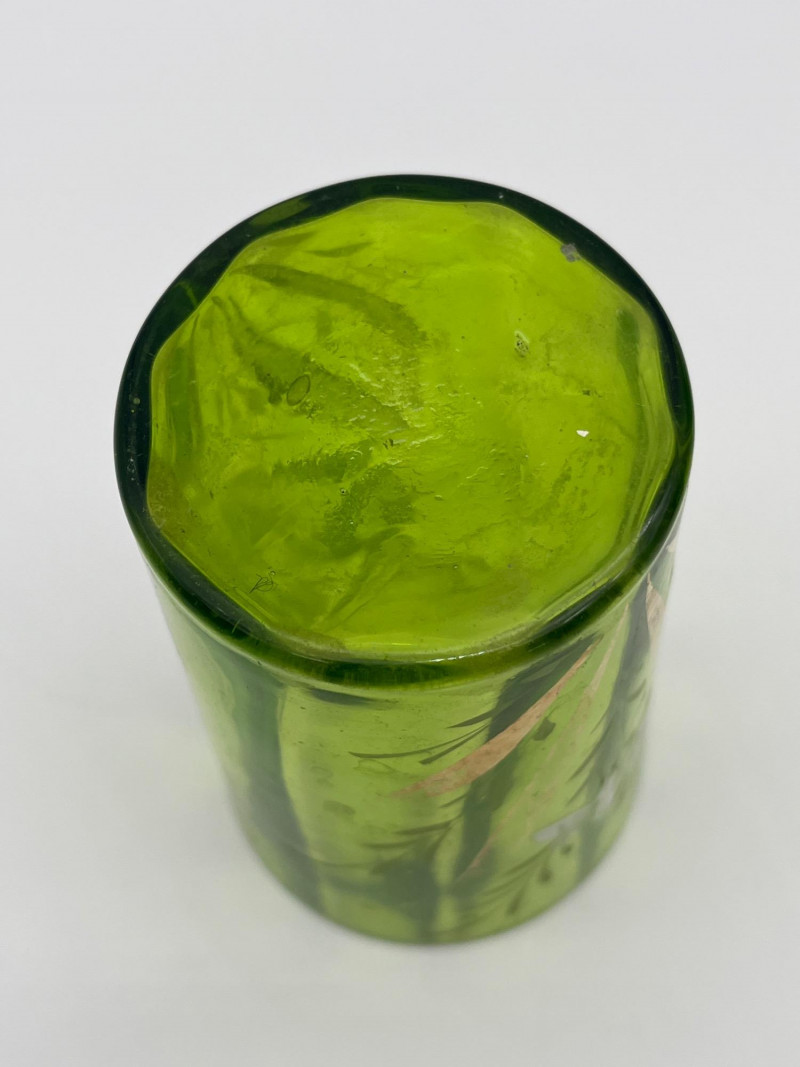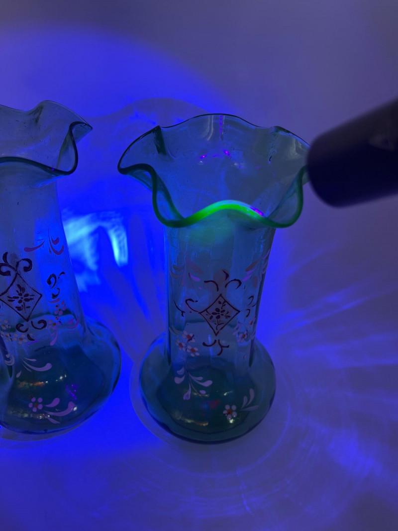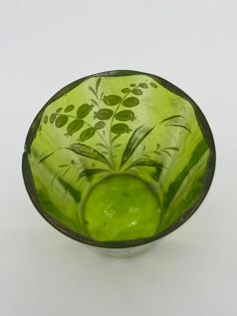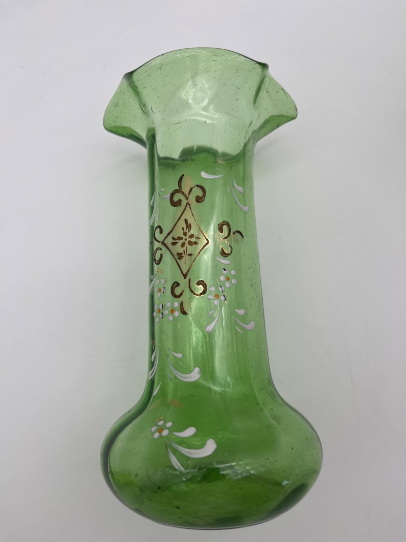 Antique Bohemian Green Ruffle Topped Vases and Drinking Glass Although these do not fluoresce as brightly as some uranium glass, this glass does get its green color from uranium. Did you know that glass makers have been tinting glass with uranium for almost 200 years?! These two vases are in the style made popular in the late 19th to early 20th century Bohemia, painted with floral designs accentuating their hand blown forms. The drinking glass is also a handmade piece but it does not fluoresce in black light like the vases do. All three pieces are in nice condition with no cracks or chips. Vases are 8" tall glass is 4" tall.
