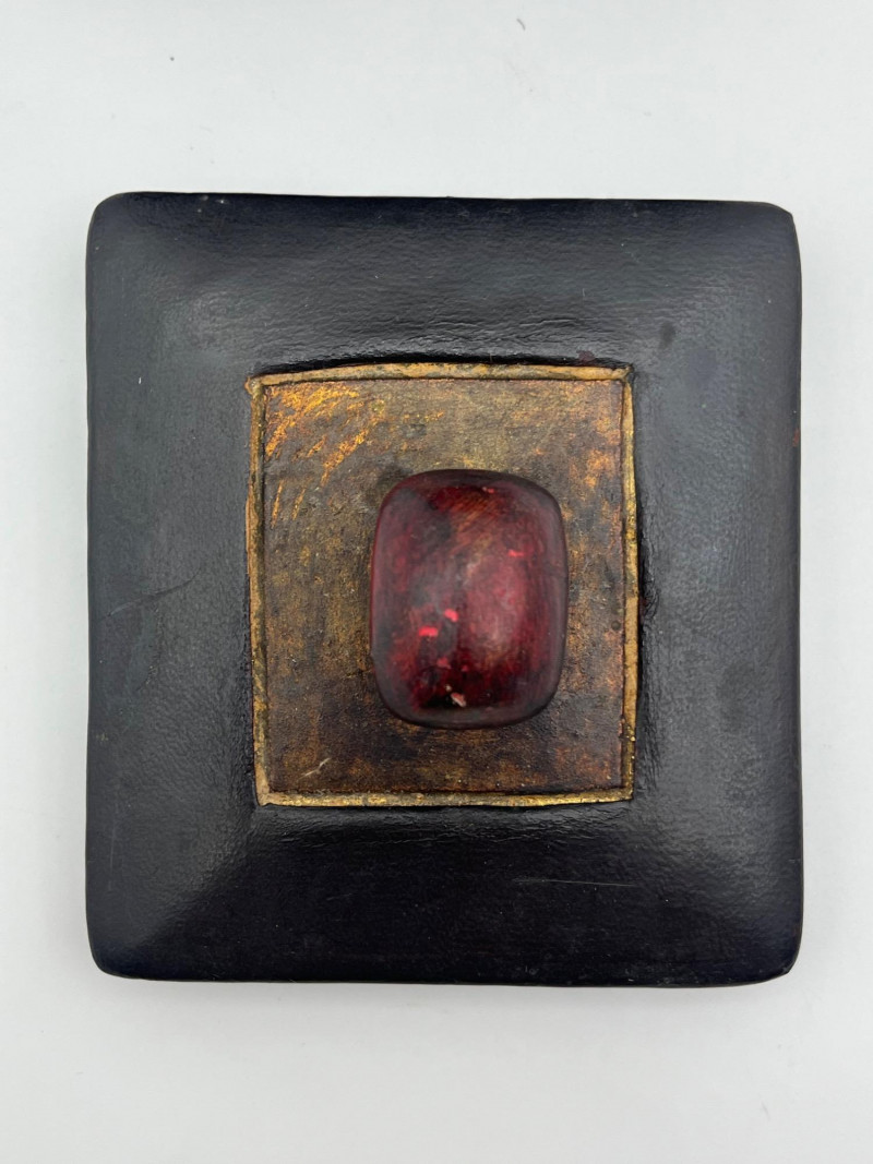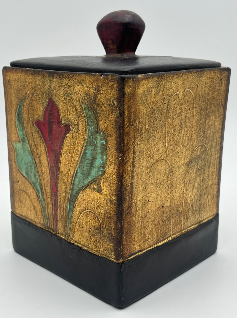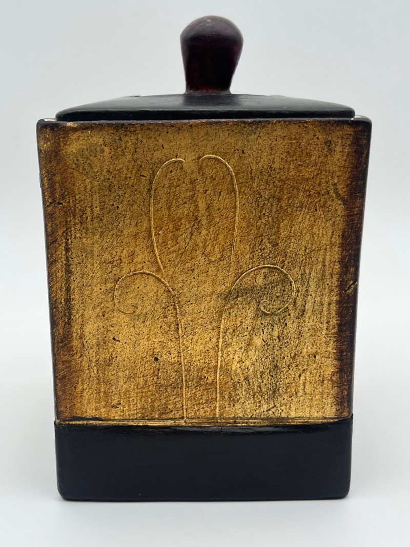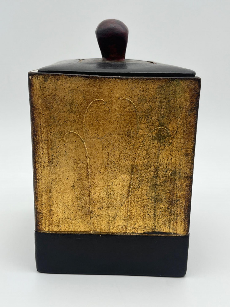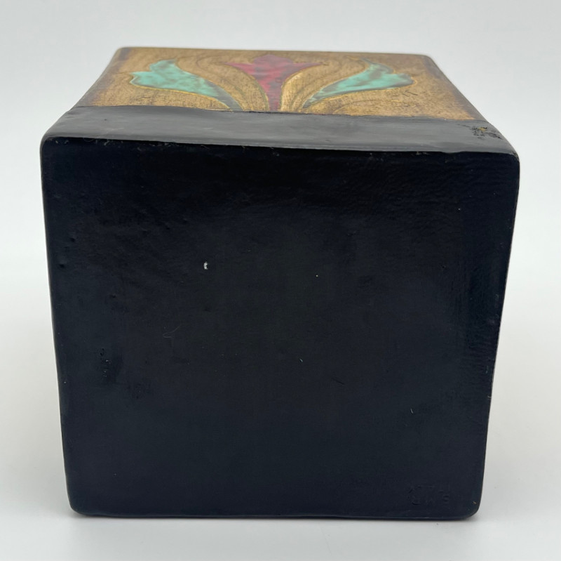 Hand Crafted Ceramic and Leather Cigar Humidor The inside is ceramic while the lid it ceramic lined with leather to allow the lid to seal in the contents. The bottom surface is also lined with leather to avoid scratching furniture. Inside measurements: 4 3/4” tall, 3 5/8” x 3 3/8”. Outside measurements: 6 1/2” tall with the handle