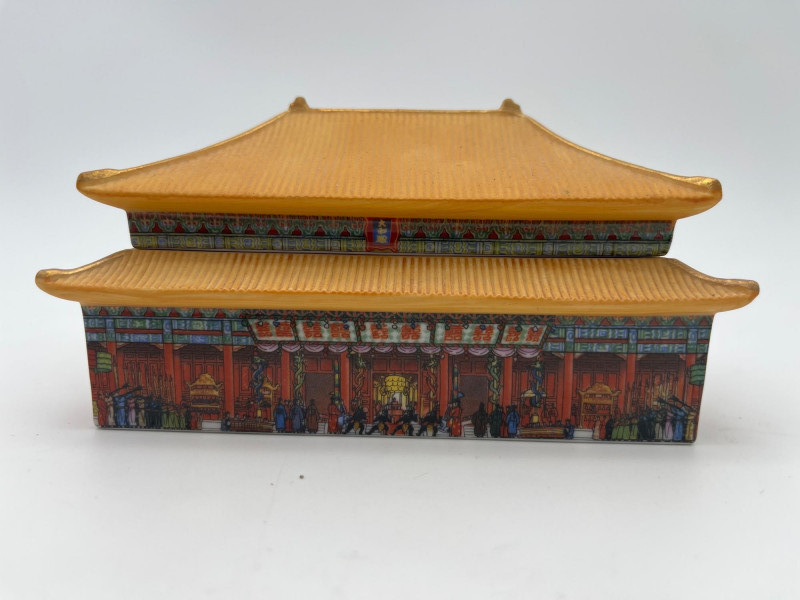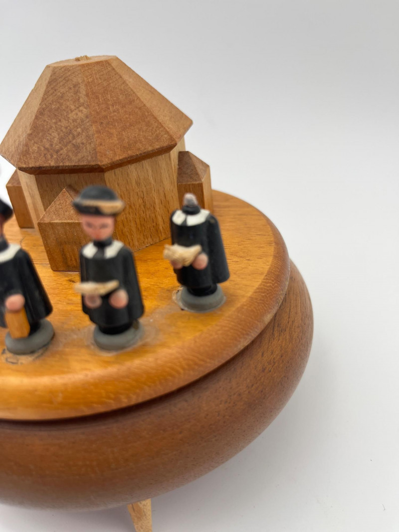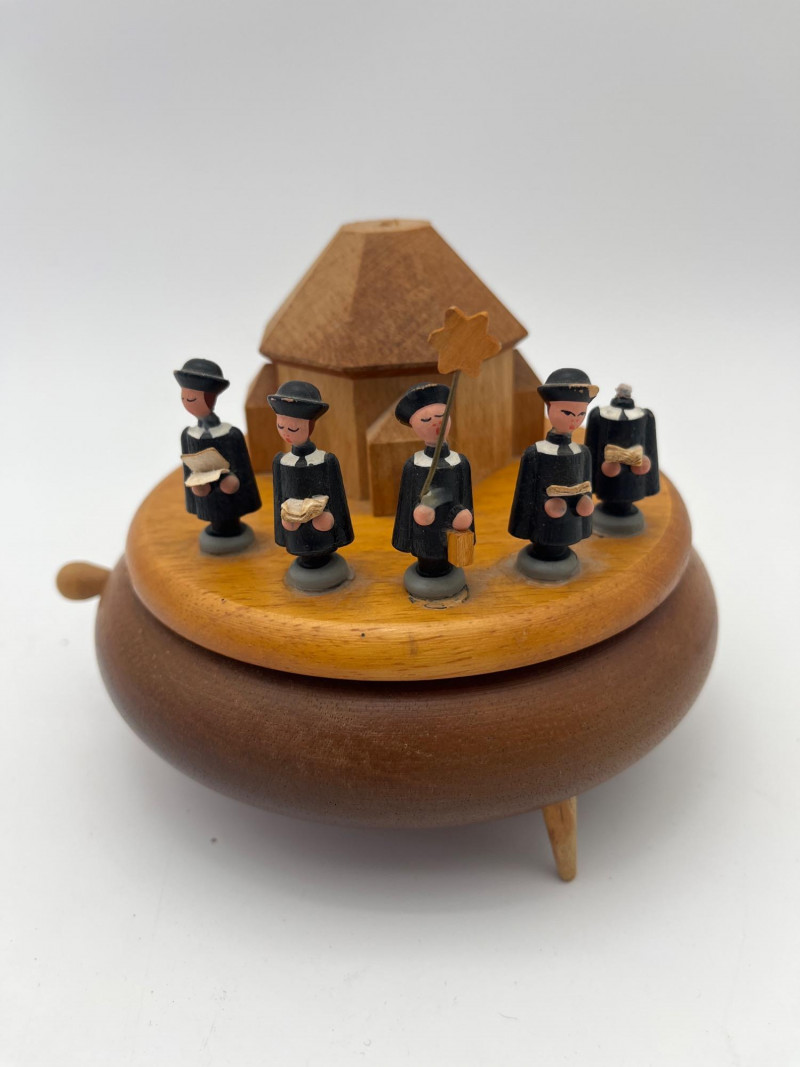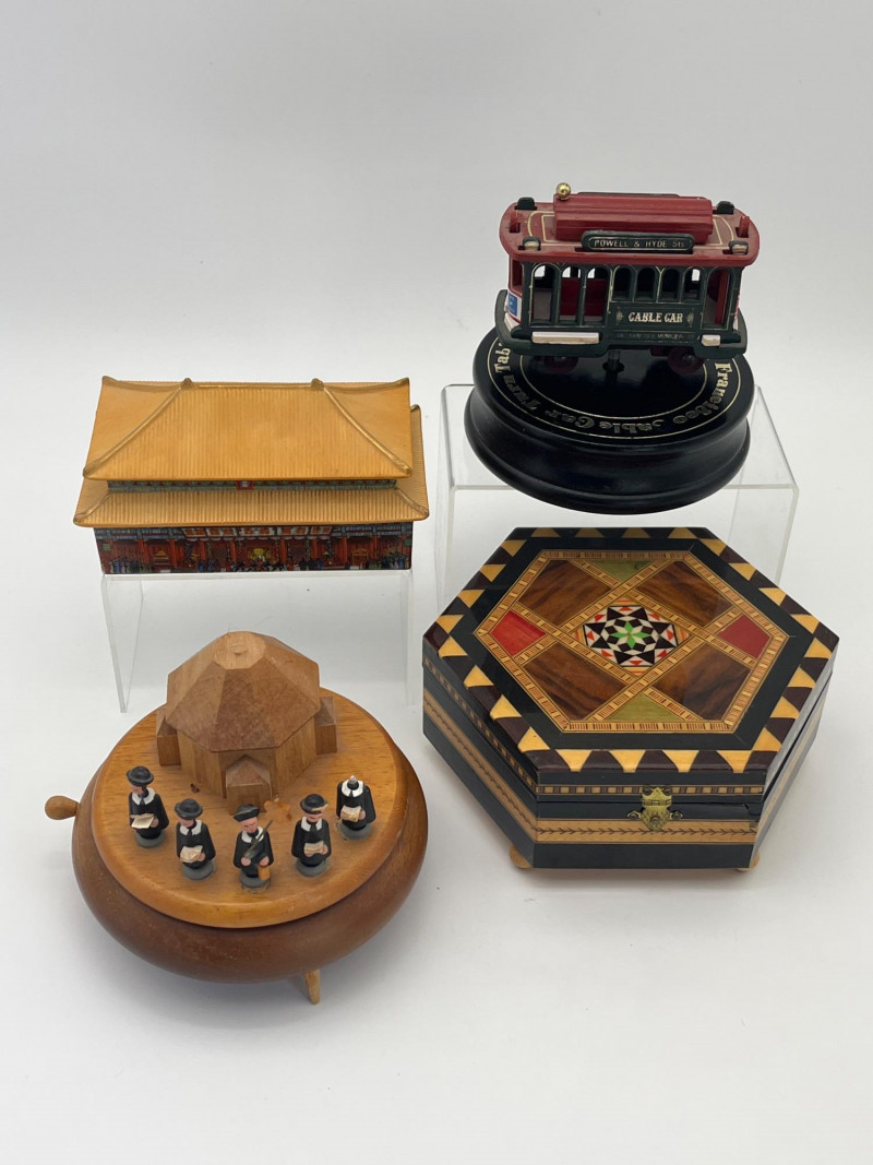Working Wooden and Ceramic Music Boxes from Around the World The pagoda styled music box is ceramic while the rest are all wooden. Note: the round one with the choir singers has one damaged "singer". See photos. All four music boxes are in working condition.