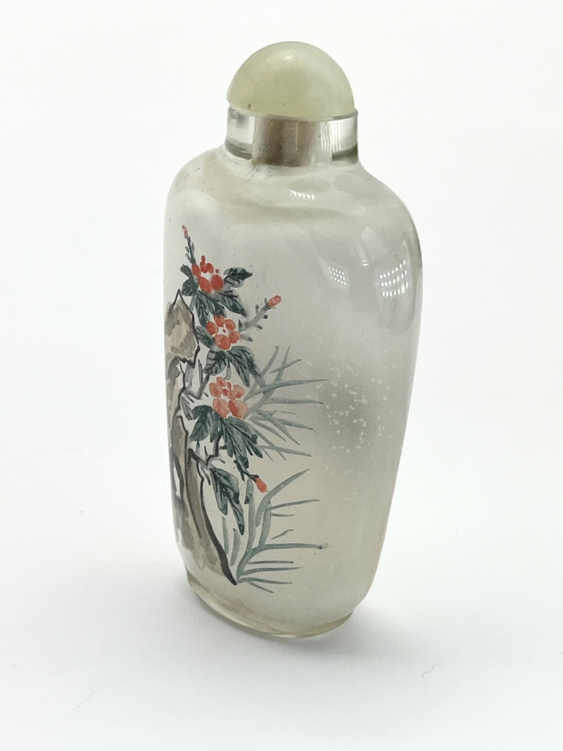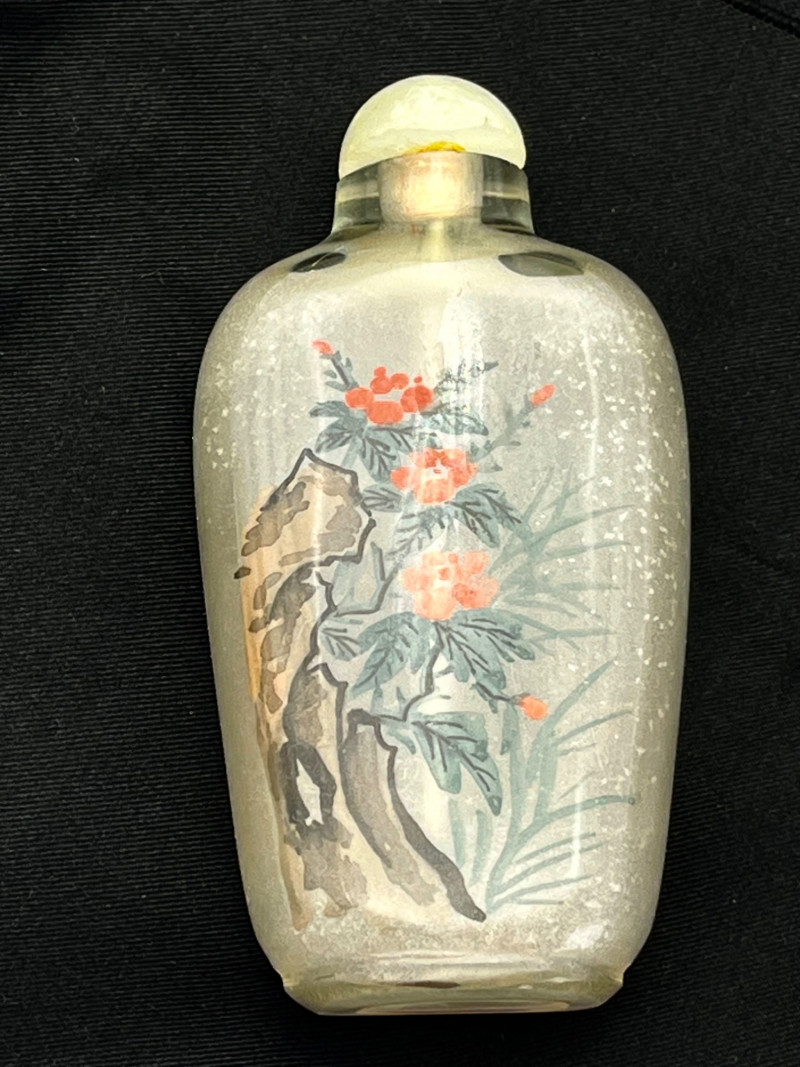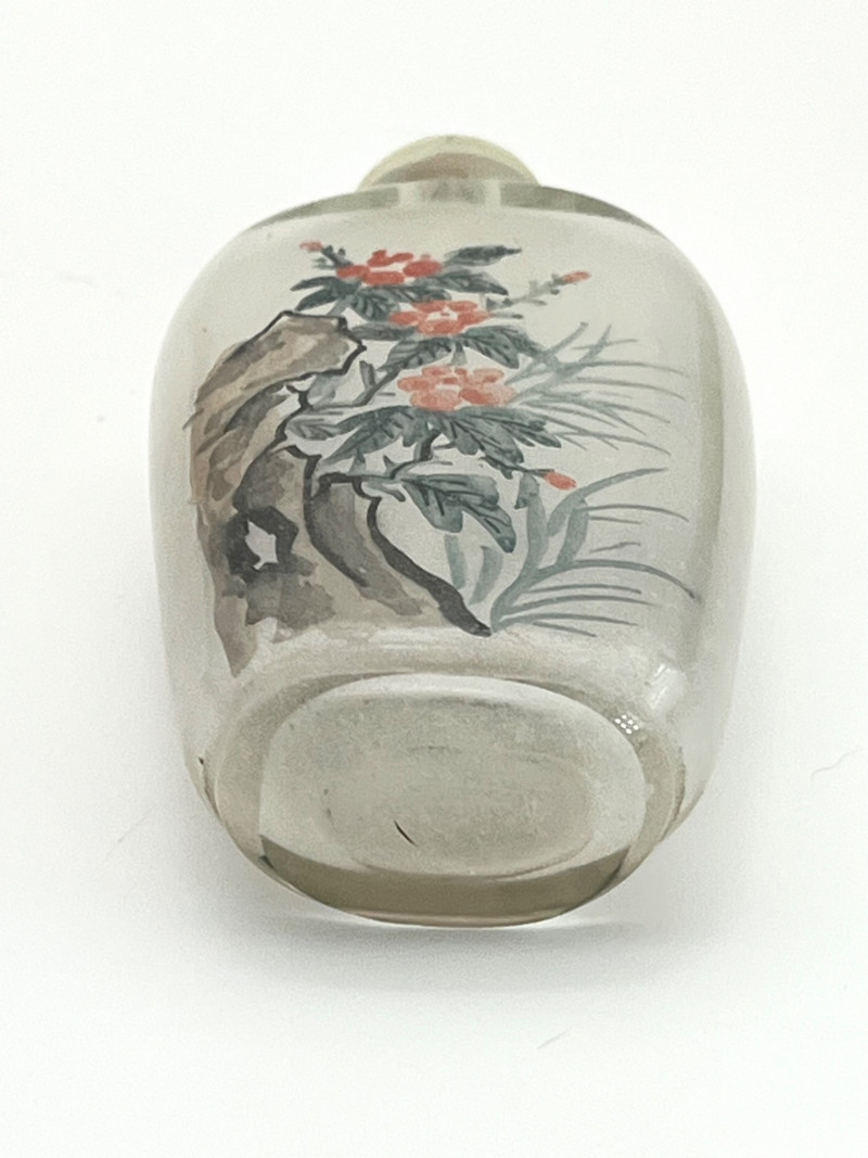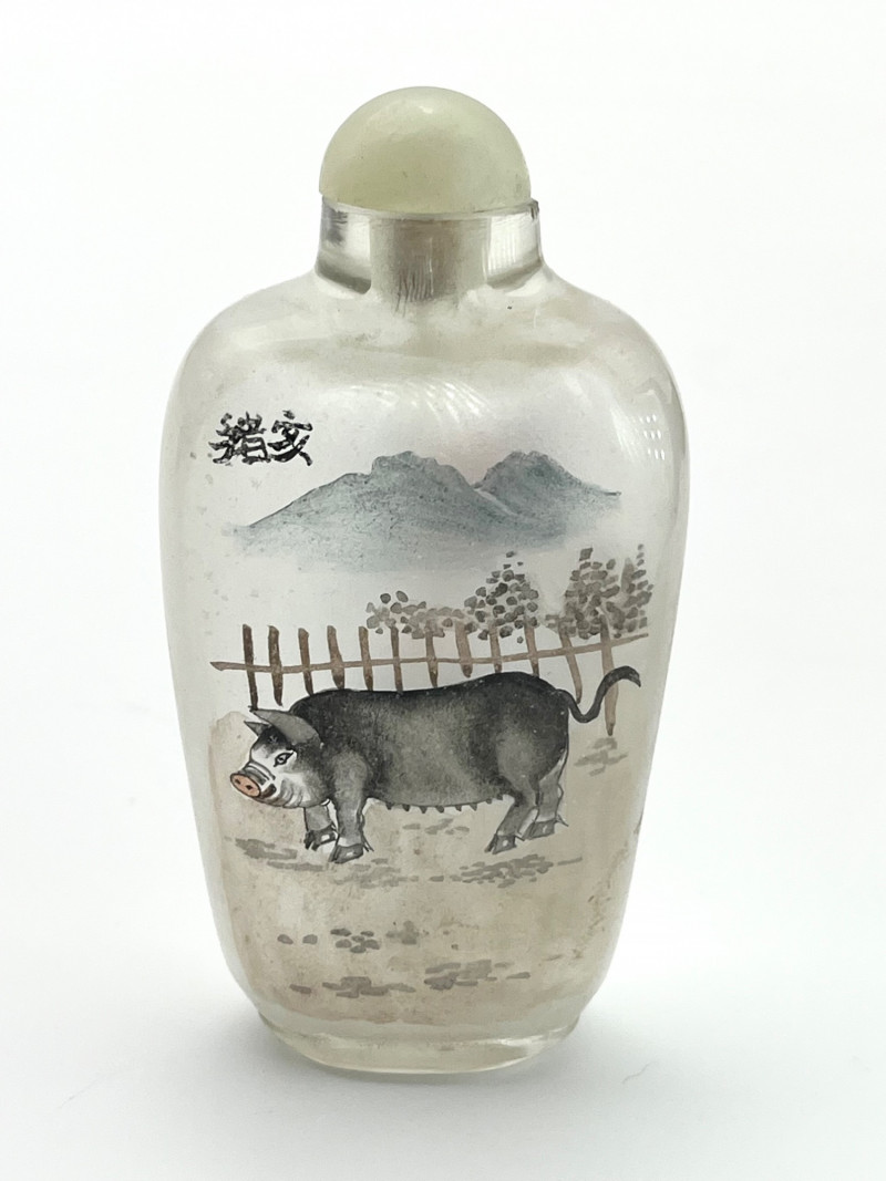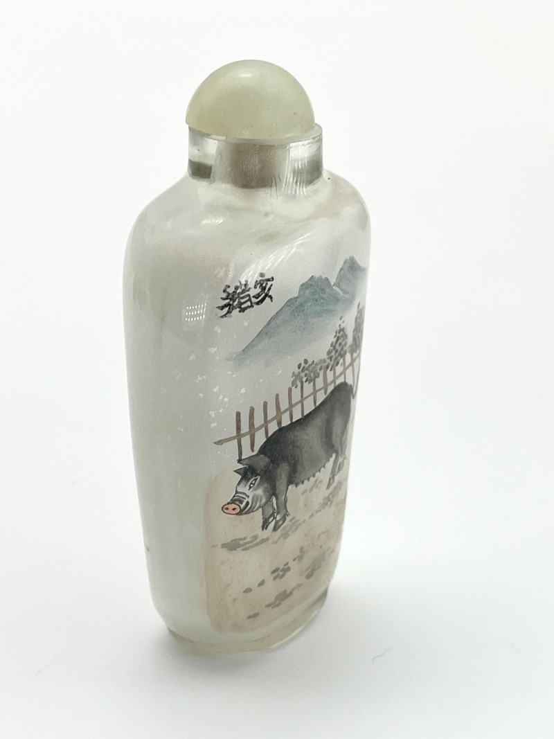Reverse Painted Snuff with Pig and Pale Green Stone Top Reverse painted snuff bottles are made by using specially designed, thin and curved brushes to paint on the interior surface of a clear bottle. The artist paints in reverse, starting with the last detail to ensure proper placement. This painstaking process requires exceptional artistic skill, calligraphy, and a specialized, fine tipped tool that can be manipulated though the bottle's small opening to achieve intricate designs and like lifelike depictions on the bottle's interior wall. This bottle is painted with a floral design on one side and a pig on the other. The pig is a symbol representing abundance and good fortune for one's self and family. The stone top, cork, and bamboo spoon are all in good condition and look to be original to the bottle.