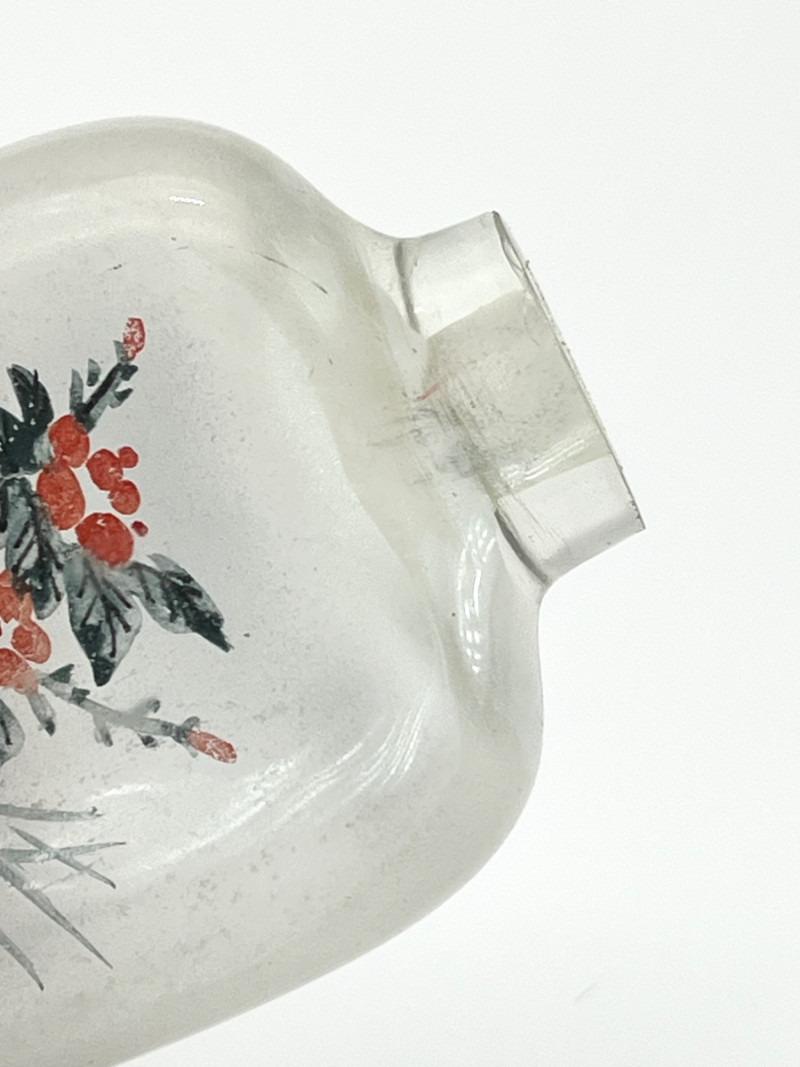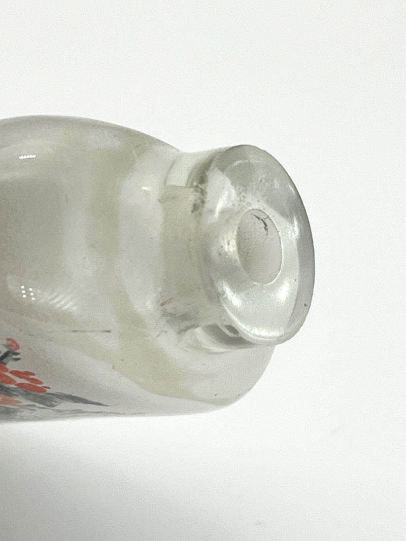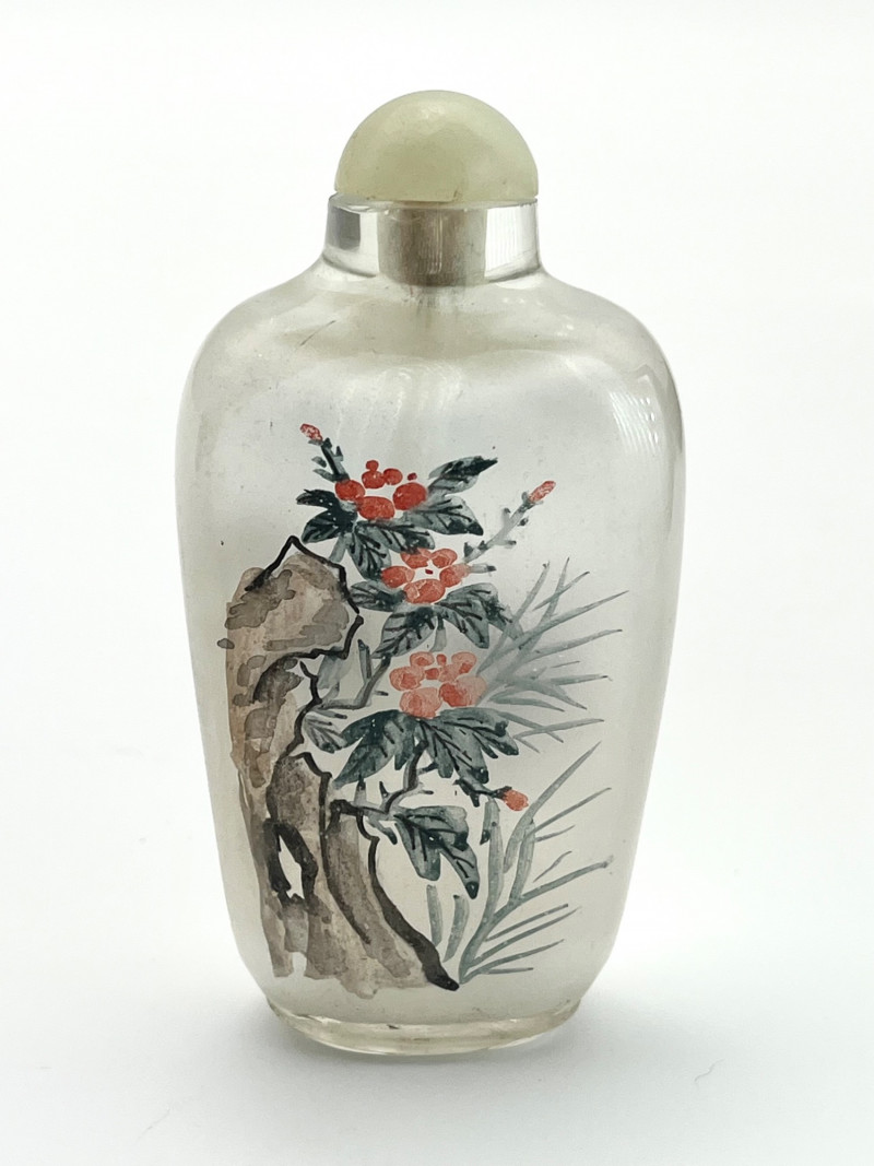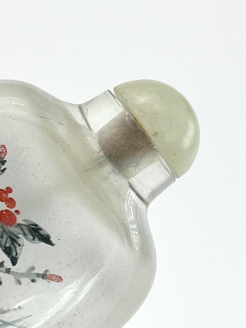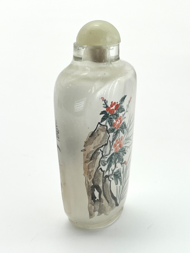 Reverse Painted Snuff with Pig and Pale Green Stone Top Reverse painted snuff bottles are made by using specially designed, thin and curved brushes to paint on the interior surface of a clear bottle. The artist paints in reverse, starting with the last detail to ensure proper placement. This painstaking process requires exceptional artistic skill, calligraphy, and a specialized, fine tipped tool that can be manipulated though the bottle's small opening to achieve intricate designs and like lifelike depictions on the bottle's interior wall. This bottle is painted with a floral design on one side and a pig on the other. The pig is a symbol representing abundance and good fortune for one's self and family. The stone top, cork, and bamboo spoon are all in good condition and look to be original to the bottle.