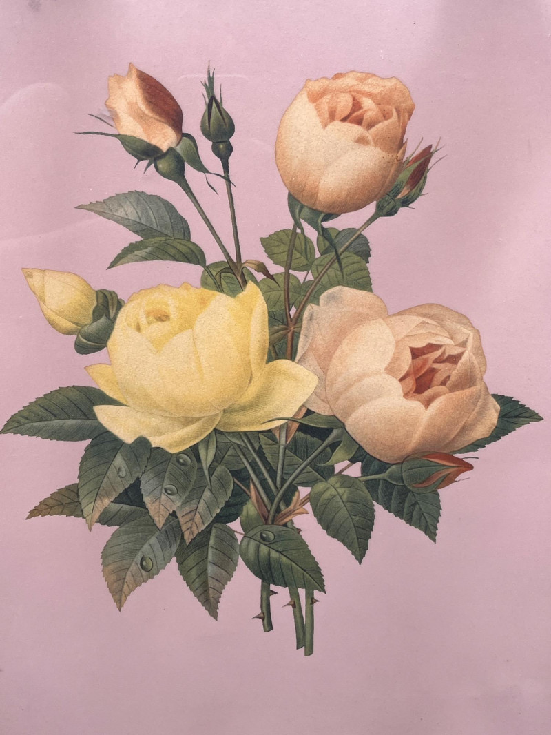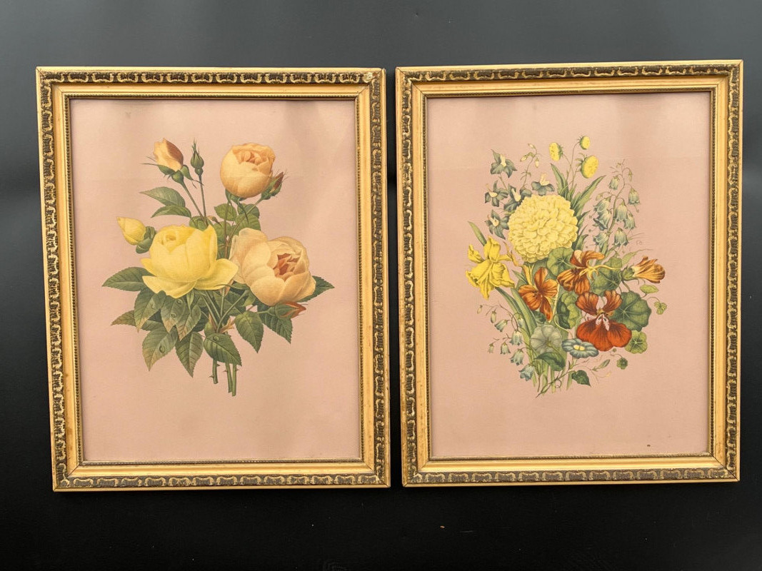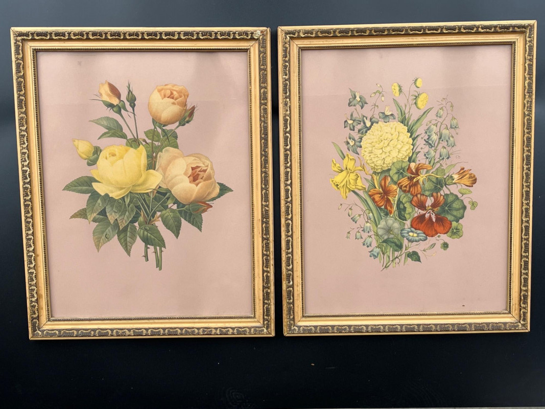 Pair of Vintage Floral Art Prints in Carved Wood Frames This style gained popularity in the 1940's when high quality printing became more widely available and thus, more affordable to American families. Still, the craftmanship of wood frames was superior to anything mass produced now and these frames are a perfect example of that quality. These measure 20 1/2 x 16 1/2“ and are in good vintage condition. Some paint may be chipping from the frames and there are some minor dents and dings to the wood. Both Pictures have glass fronts that are in good condition.