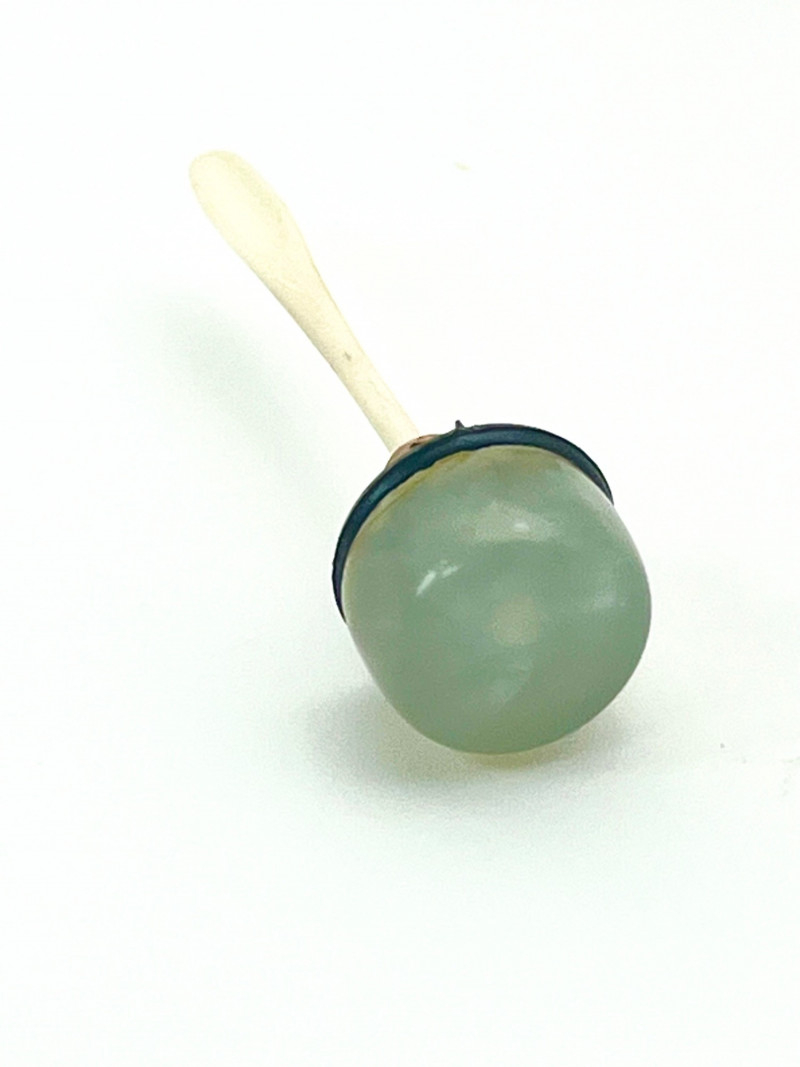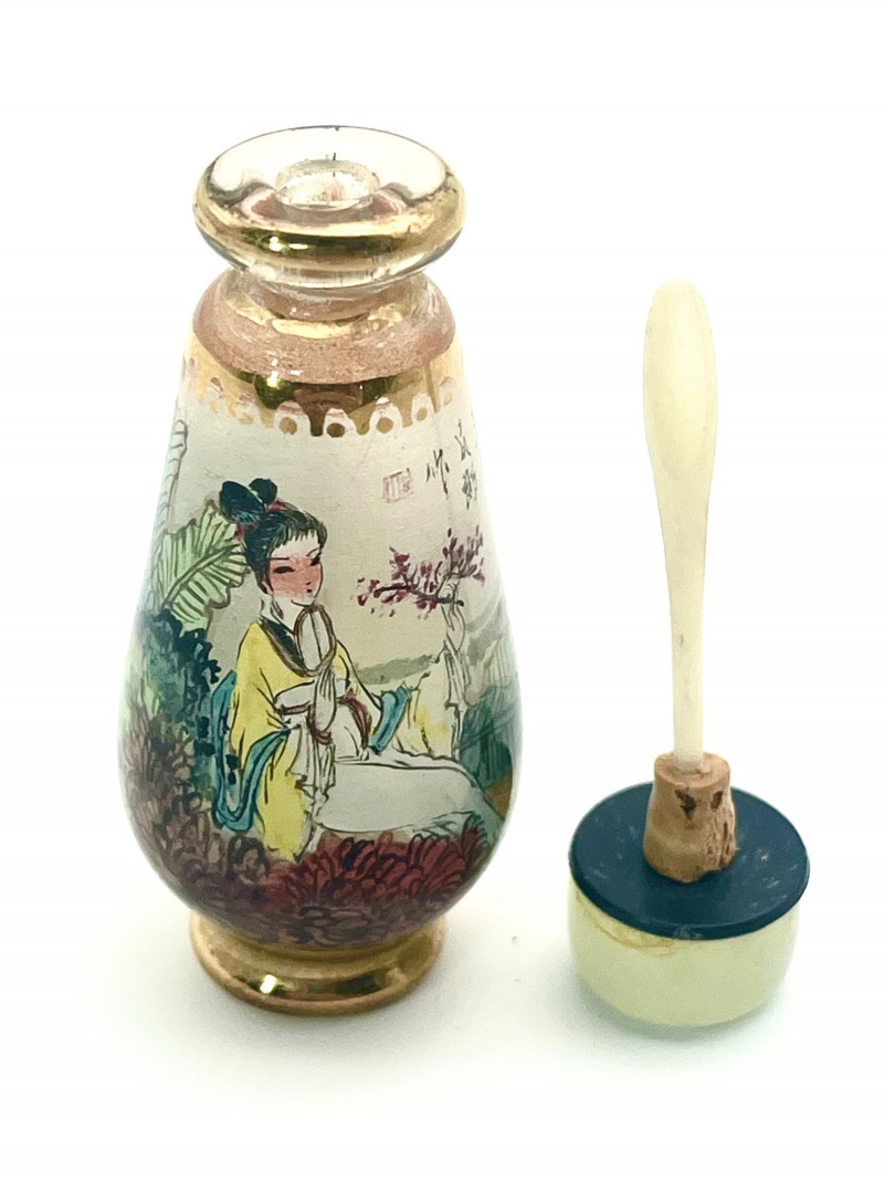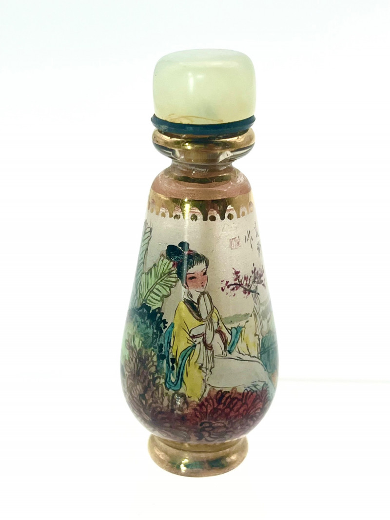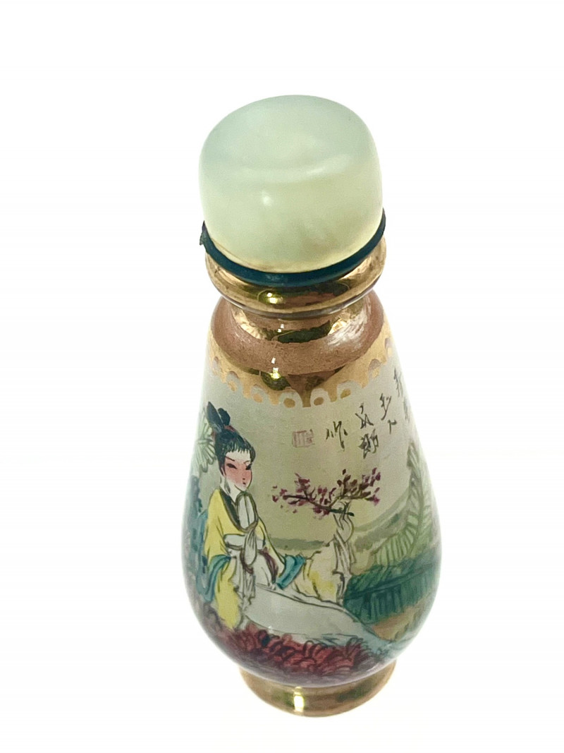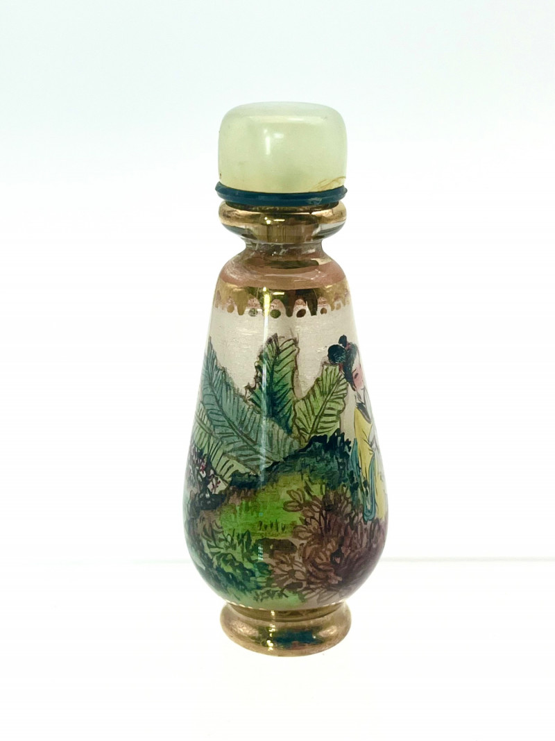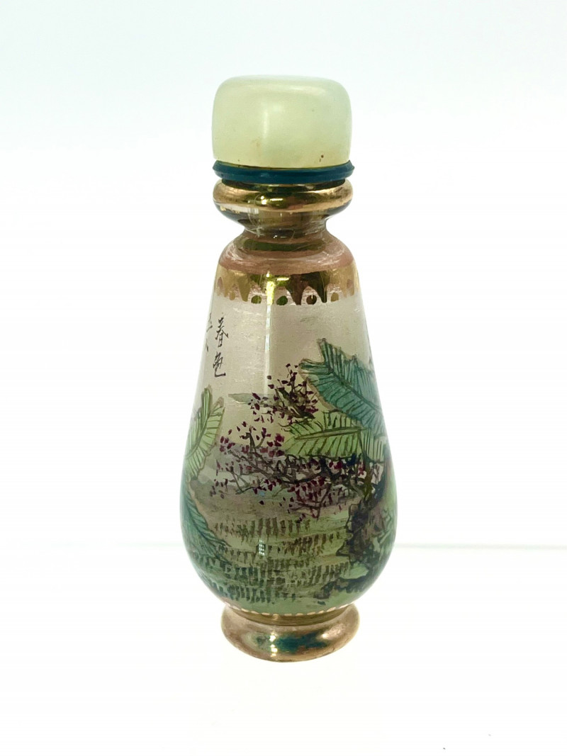 Small Reverse Painted Snuff Bottle with Gold Detail and Jade Top Reverse painted snuff bottles are made by using specially designed, thin and curved brushes to paint on the interior surface of a clear bottle. The artist paints in reverse, starting with the last detail to ensure proper placement. This painstaking process requires exceptional artistic skill, calligraphy, and a specialized, fine tipped tool that can be manipulated though the bottle's small opening to achieve intricate designs and like lifelike depictions on the bottle's interior wall. This bottle is quite small at only 2 3/4" tall and only 1" wide. As small as this one is, I would imagine the process to paint this one would be incredibly difficult!