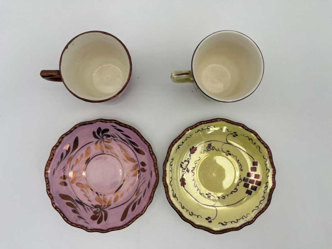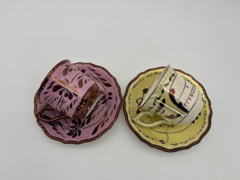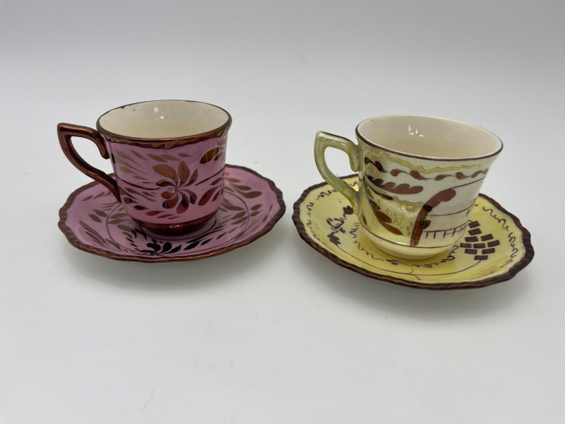Small Collection of Mid-Century Era Teacups I’m unsure of the maker of the pink and yellow pair but they are a lighter, less dense ceramic common of that era. The paint has a light metallic finish and they are both in good vintage condition. I would consider these two demitasse sized sets.