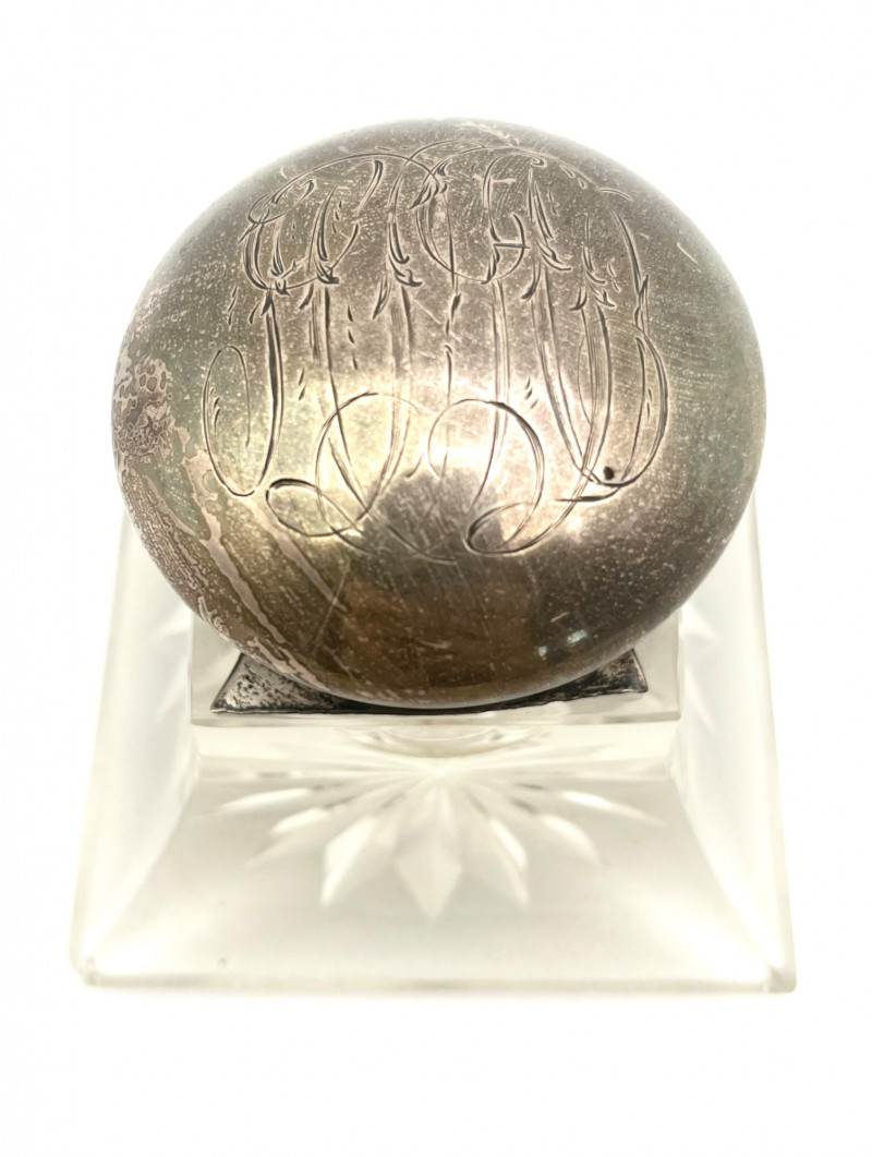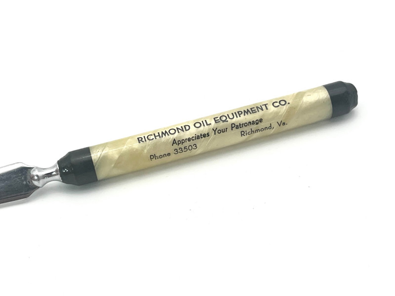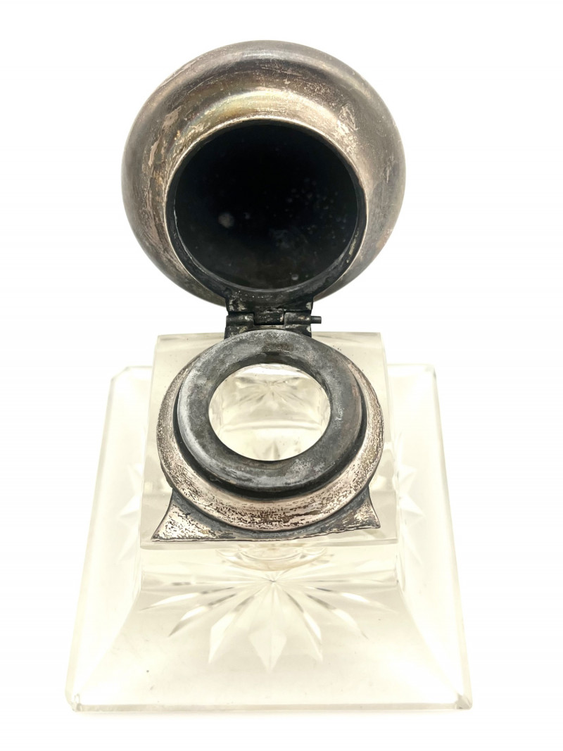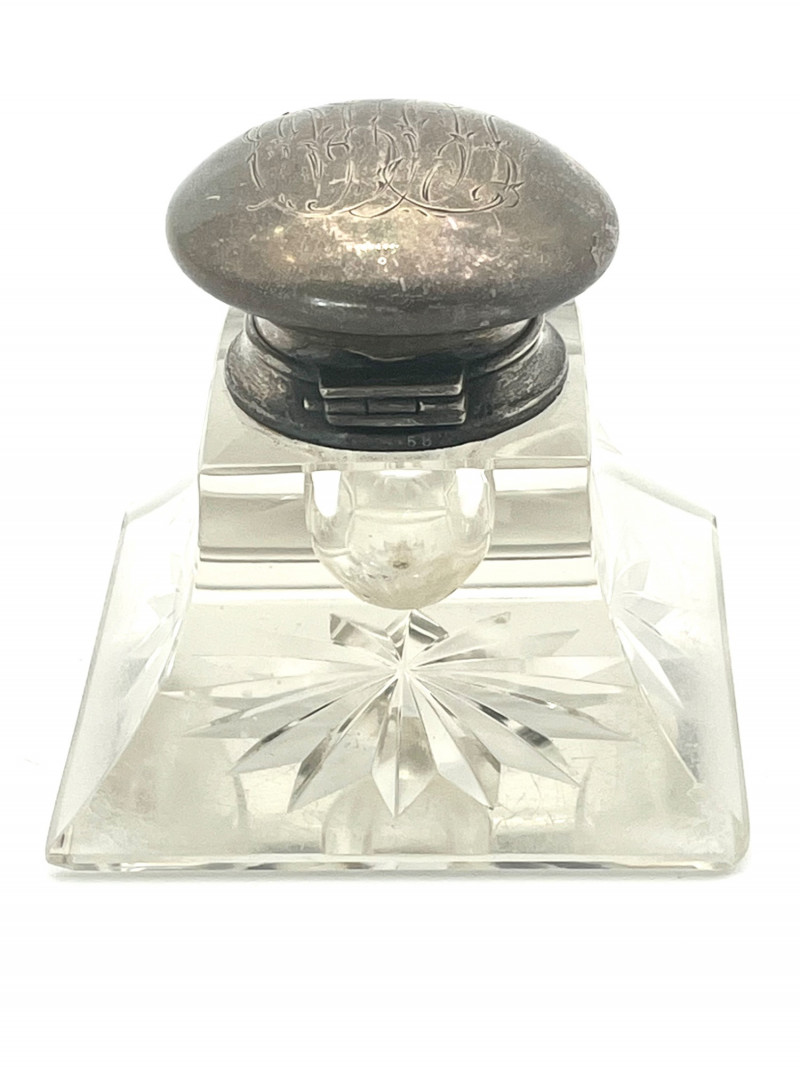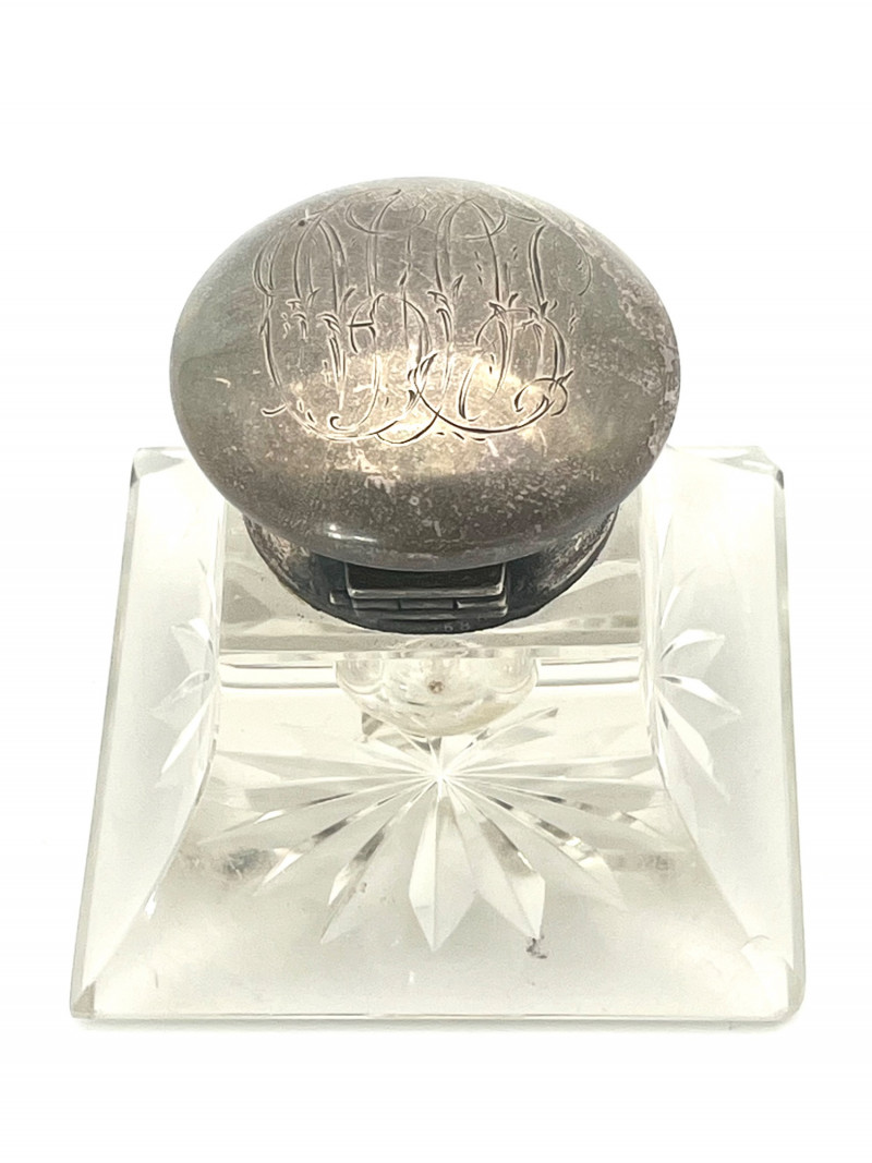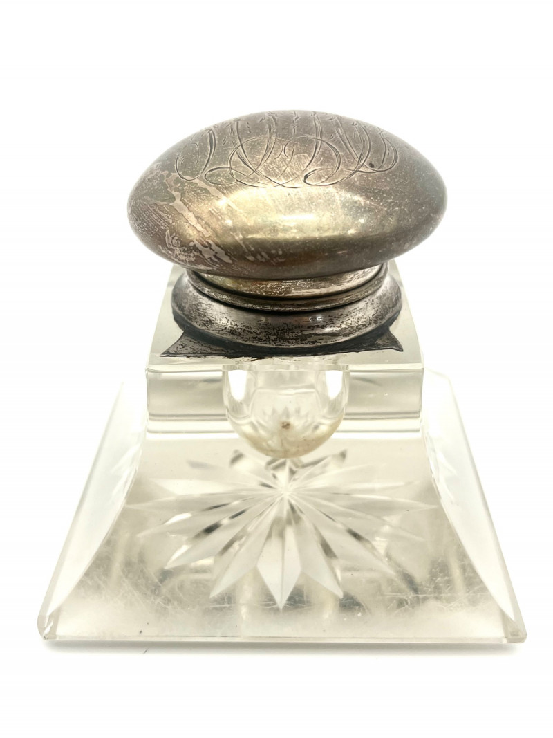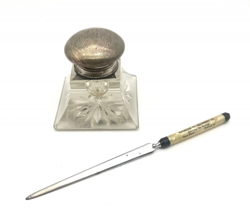 Antique Lead Crystal Ink Well and Vintage Letter Opener The ink well is scratched and has some chips on the corners, shown in photos. The lid is silver but not stamped 925 or sterling so I'm not sure if it is sterling or plated. The letter opener was an advertising piece for Richmond Oil Equipment Co, in Richmond, WA. This style letter opener was popular in the 1960's and into the 70's and letter openers were a popular advertising tool given to customers to help promote their business.
