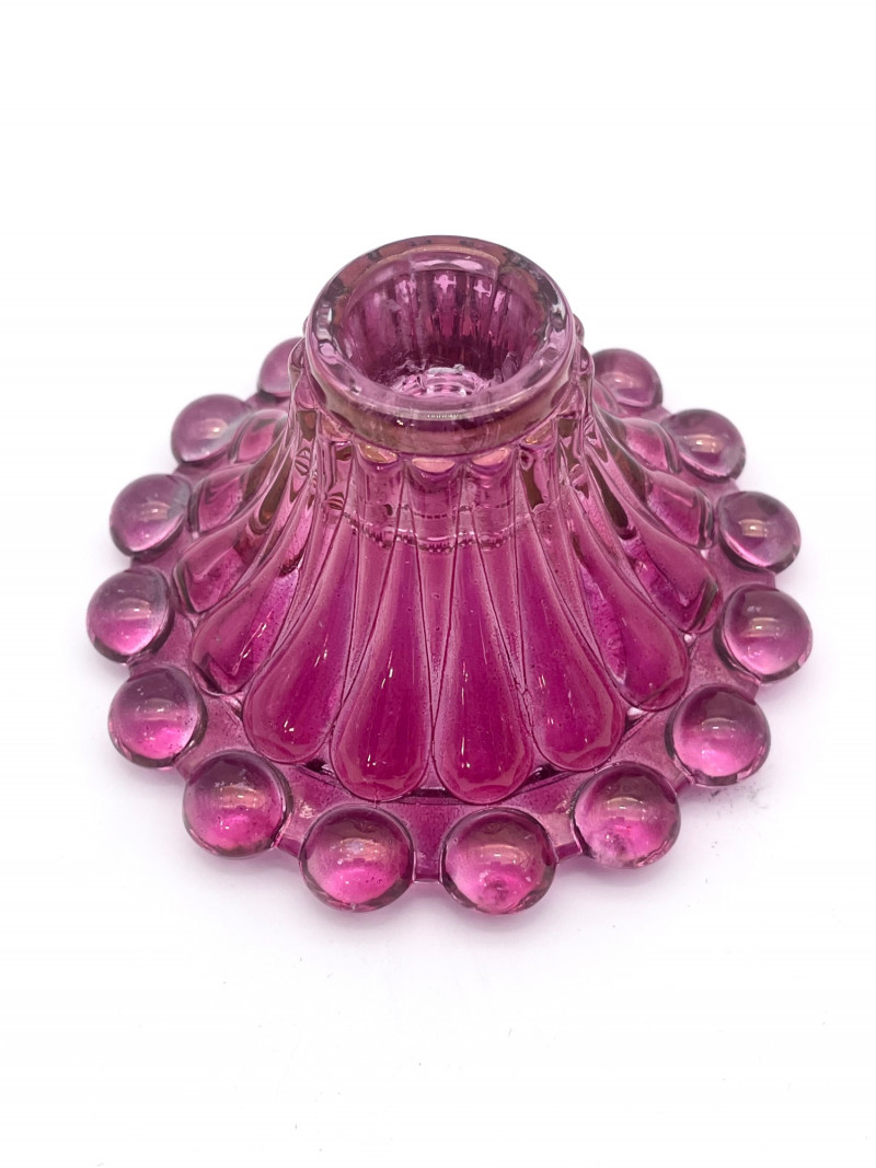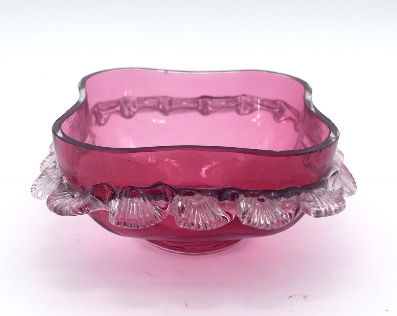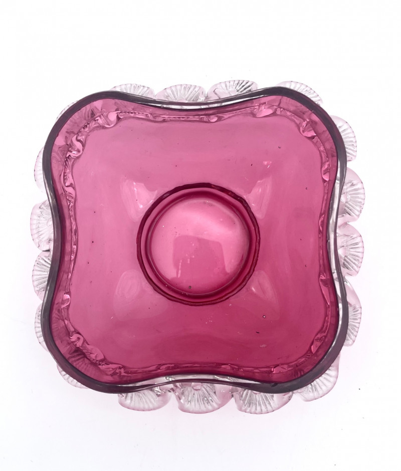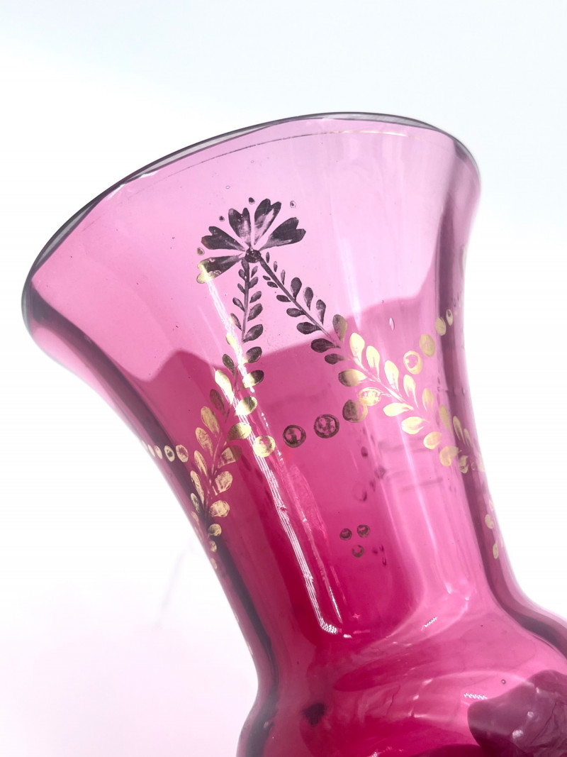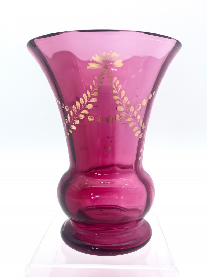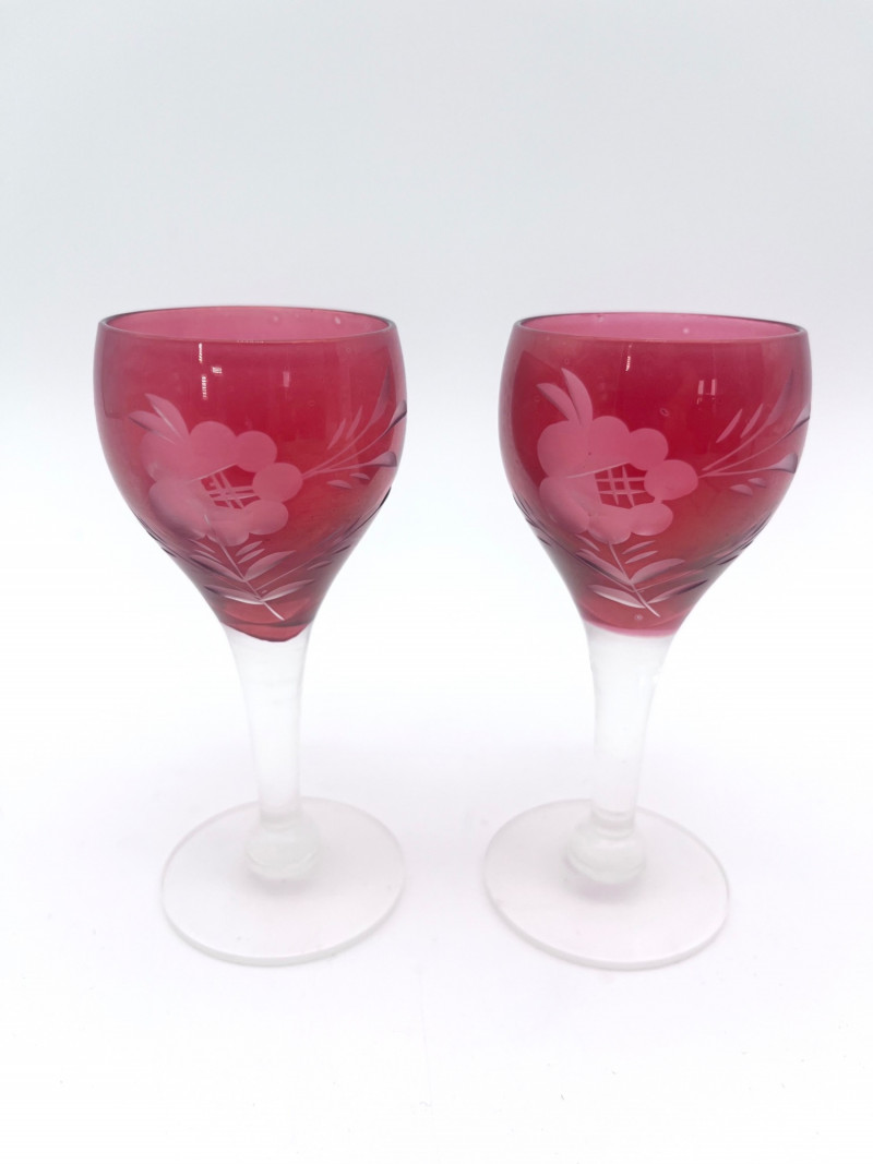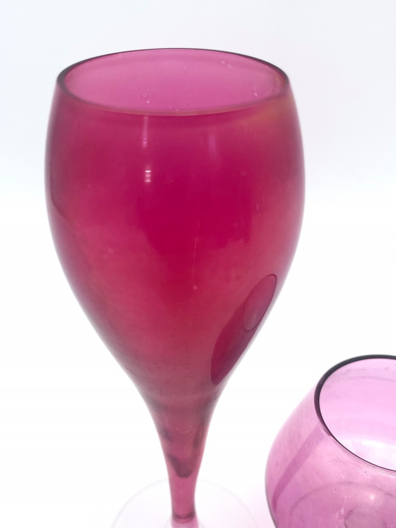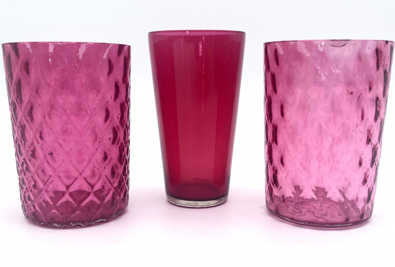 Flashed Cranberry Glass Lot - Dishes, Glasses and Candle Holder All of these pieces are flashed glass, that is clear glass with a cranberry (dark pink to fuchsia) finish. Some pieces are scratched or have some wear to the finish but in good condition with no cracks or chips. For perspective, the tallest glass is 7"and the painted vase is 4 3/4" tall. The diamond optic glasses are 3 5/8" and the cut-to-clear cordials (tiny wine glasses) are 3 3/4" tall.