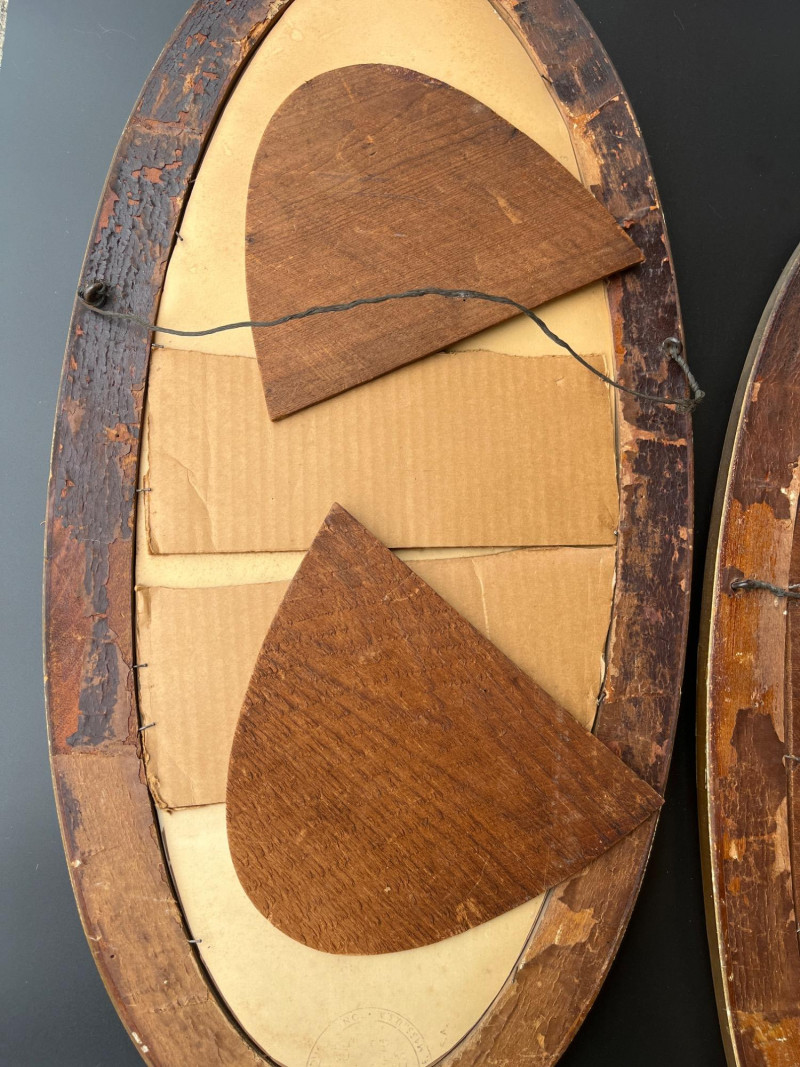 Antique Oval Gold Framed Japanese Paintings These are 27" tall and 13" wide and both have wire hangers. I am unsure of the art medium but the frames are painted wood with metal embellishments. See photos for wear and damage to the back of one of the frames.