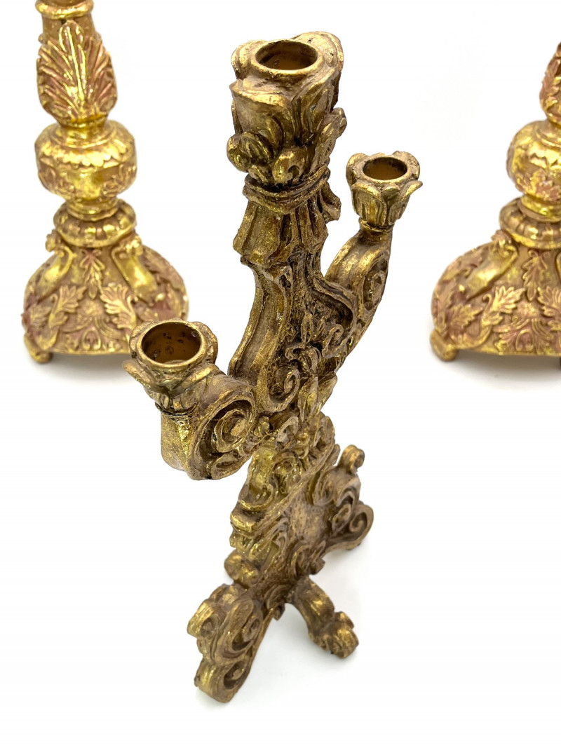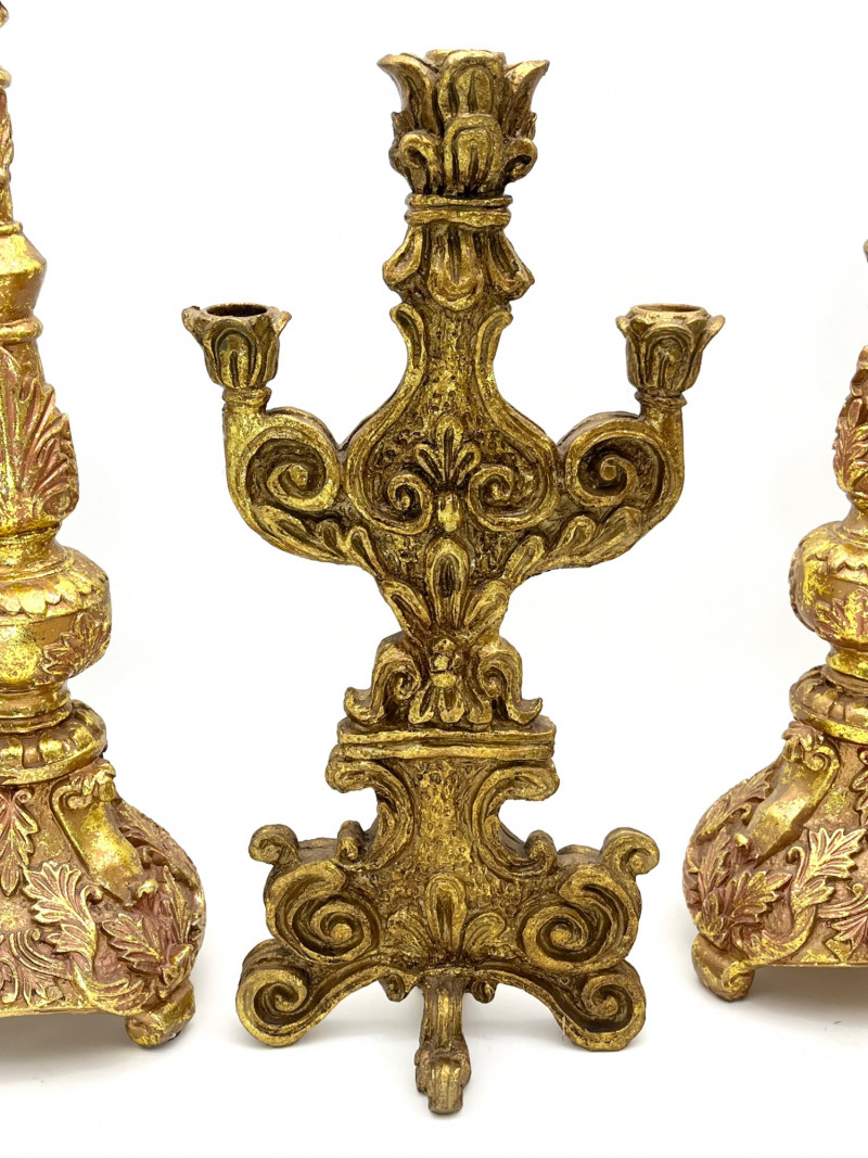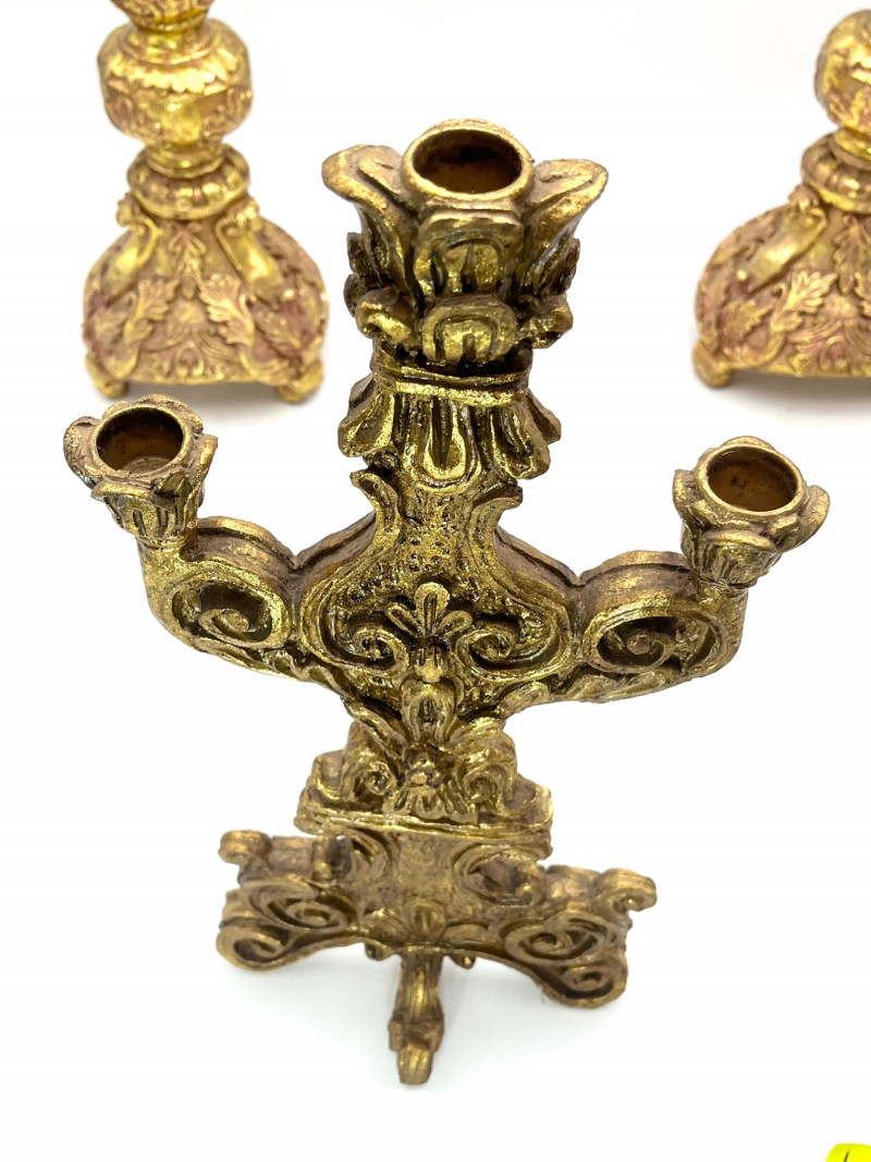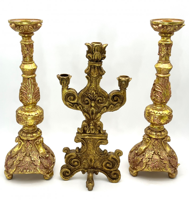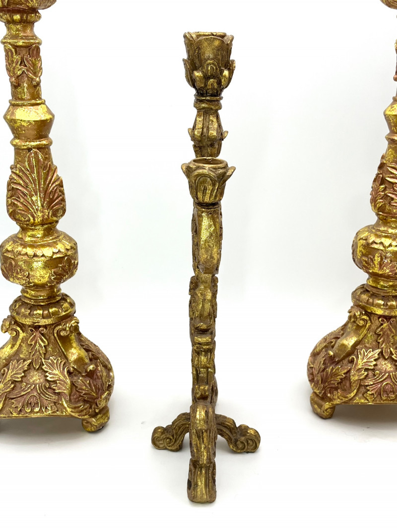Ornate Faux Gold Tapered Candle Holders These are resin with a heavy gold tone finish. The two single candle holders are 17 3/4" tall and the triple candle holder is 16" tall.