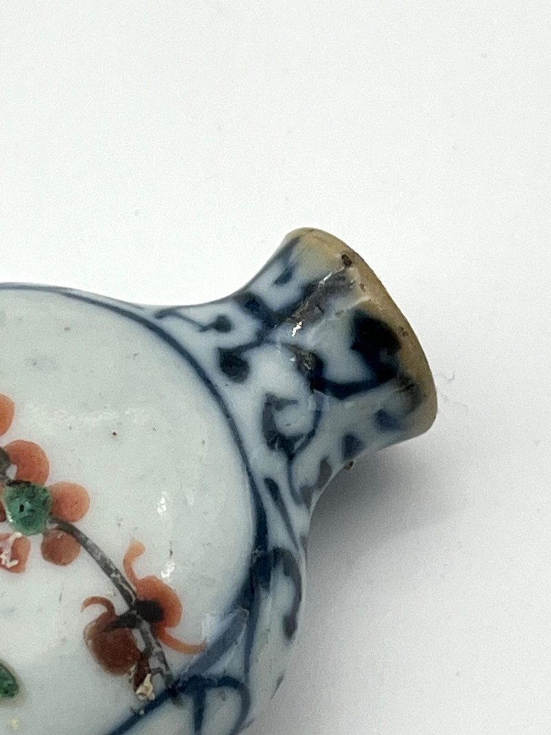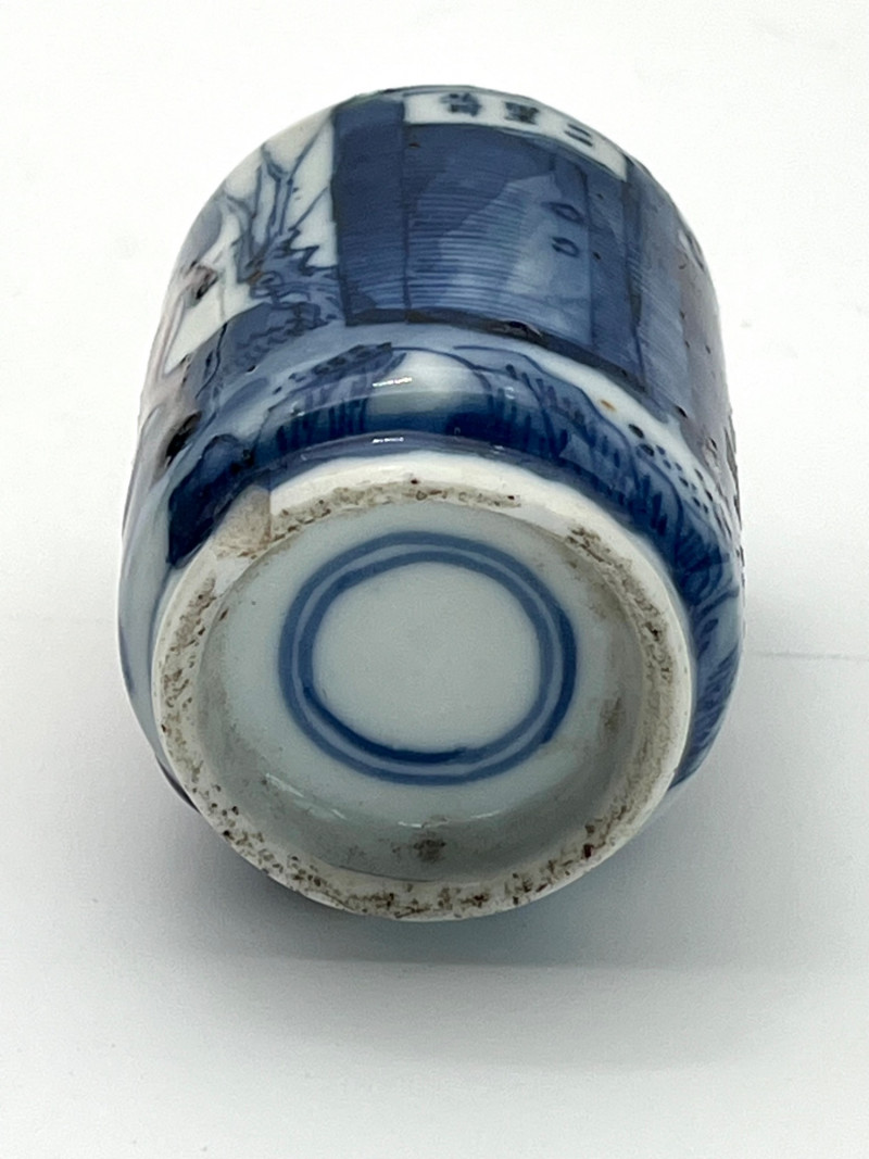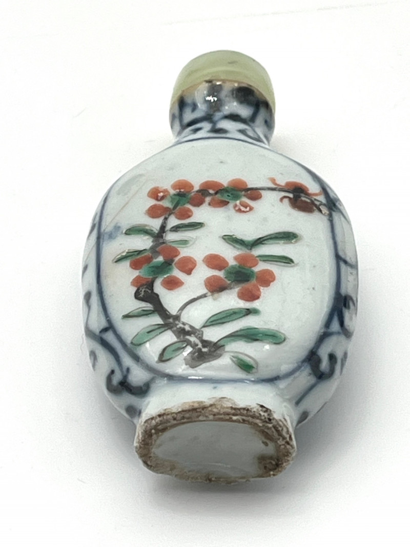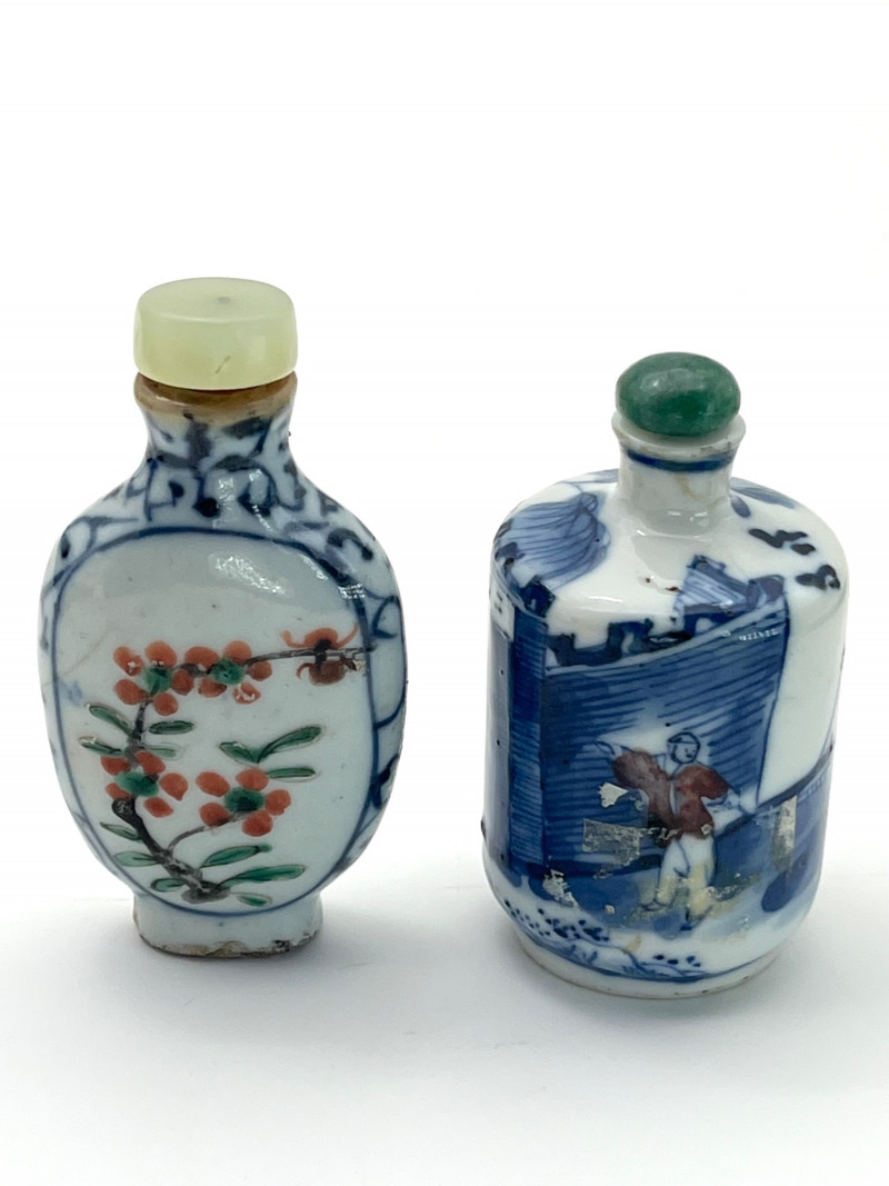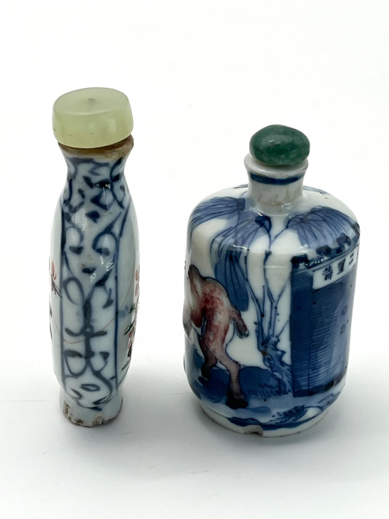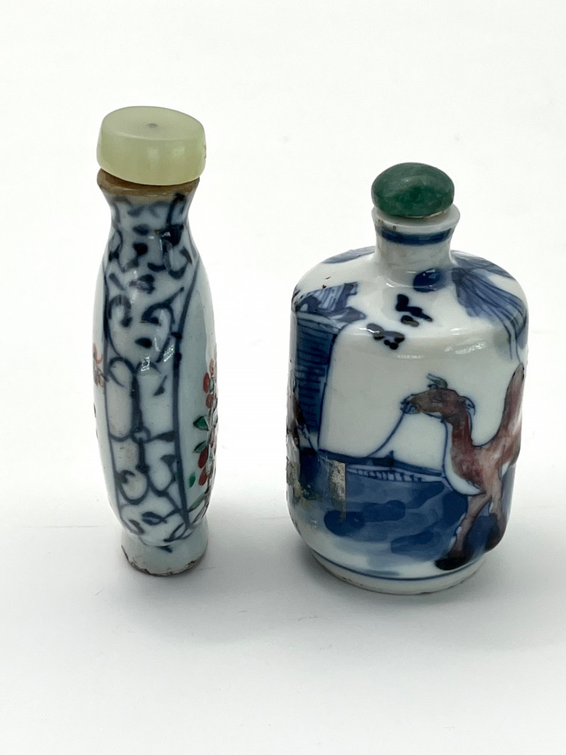 Two Blue and White Painted Traditional Ceramic Snuff Bottles While these are likely older than a few of the others available in this estate, these two do have some flaws. The taller of these two is 3 1/8" tall and is painted in a Famille Rose style with a pale nephrite jade top. The cork stopper and bamboo spoon are intact. The bottle itself has a crack on its side and shows signs of quite a bit of wear; these are sure signs of age and may be helpful in more accurate dating since there is no dynasty mark on the bottom. The shorter, round bottle is 3 3/4" tall with a jadeite top. The cork is repaired with an adhesive but the bamboo spoon is in good condition. The style of this bottle is a traditional blue and white with the addition of a man leading his camel. The bottom has quite a bit of wear (including a small chip) and no dynasty mark to accurately date.