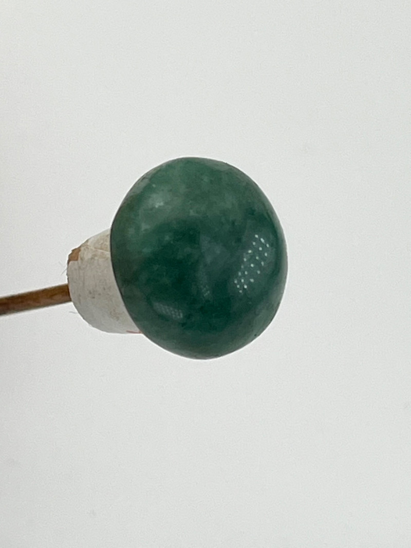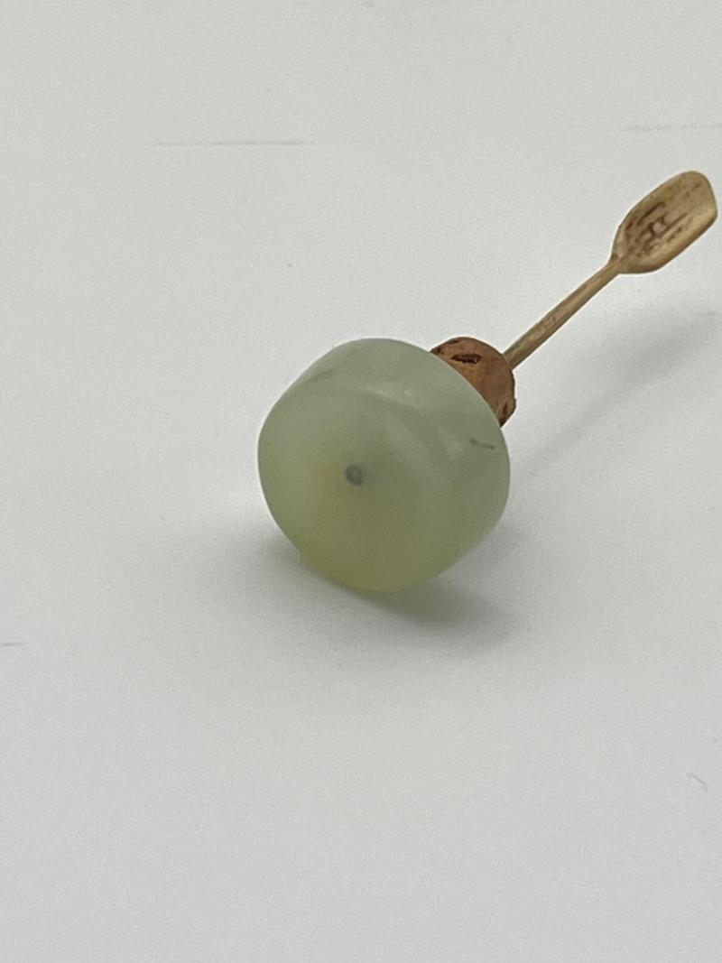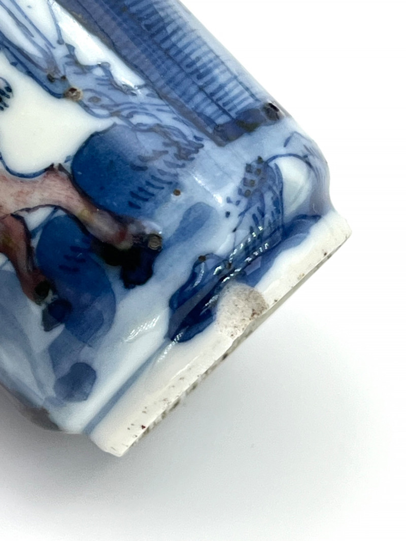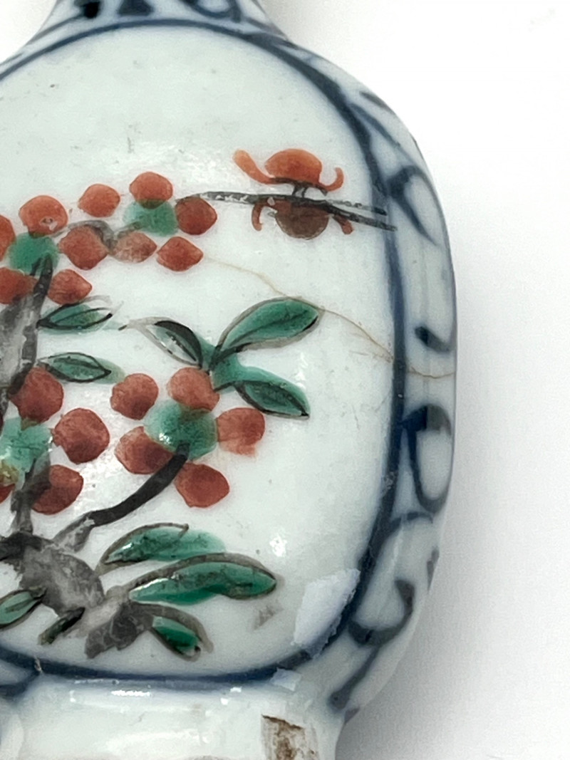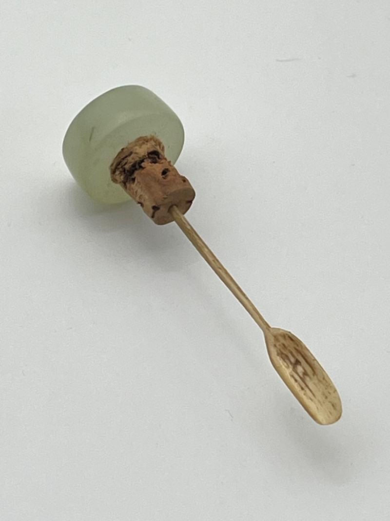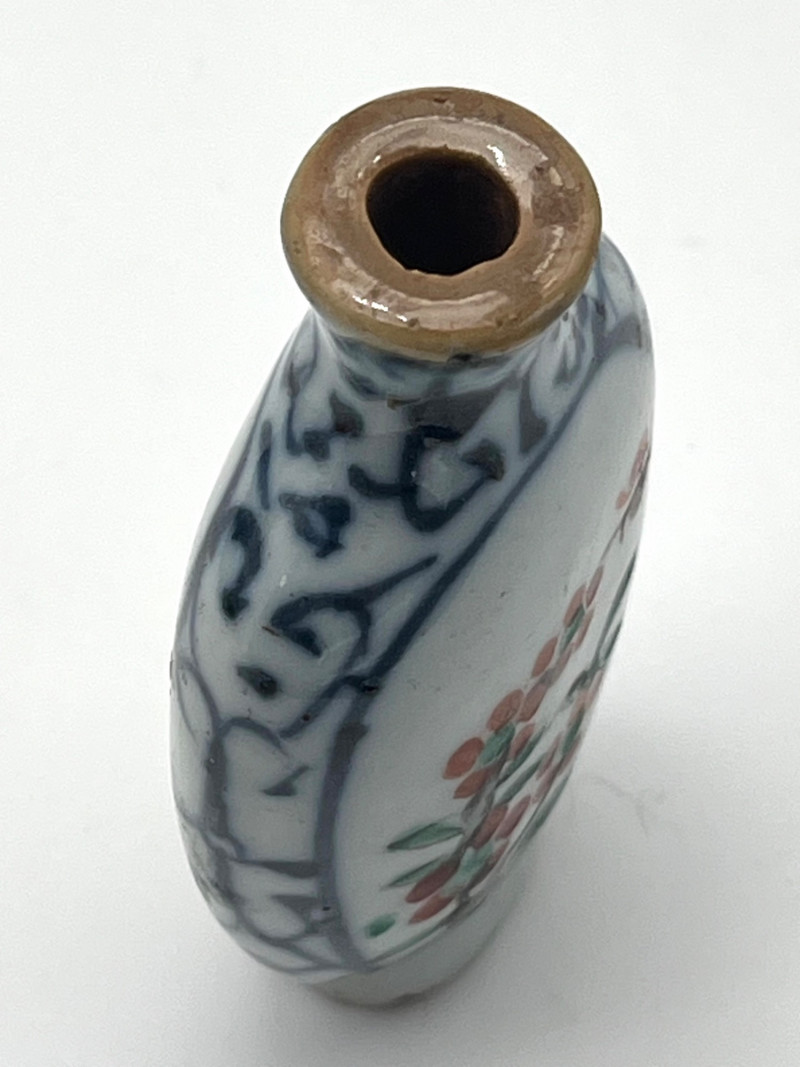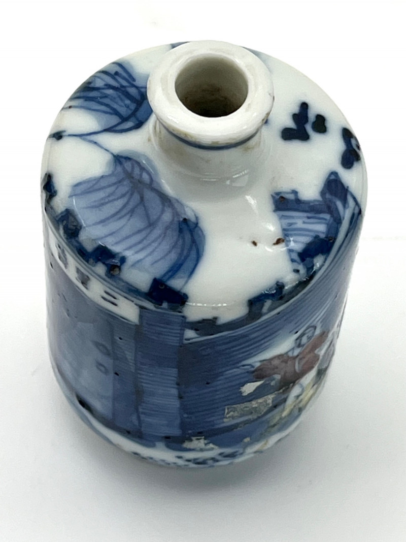 Two Blue and White Painted Traditional Ceramic Snuff Bottles While these are likely older than a few of the others available in this estate, these two do have some flaws. The taller of these two is 3 1/8" tall and is painted in a Famille Rose style with a pale nephrite jade top. The cork stopper and bamboo spoon are intact. The bottle itself has a crack on its side and shows signs of quite a bit of wear; these are sure signs of age and may be helpful in more accurate dating since there is no dynasty mark on the bottom. The shorter, round bottle is 3 3/4" tall with a jadeite top. The cork is repaired with an adhesive but the bamboo spoon is in good condition. The style of this bottle is a traditional blue and white with the addition of a man leading his camel. The bottom has quite a bit of wear (including a small chip) and no dynasty mark to accurately date.