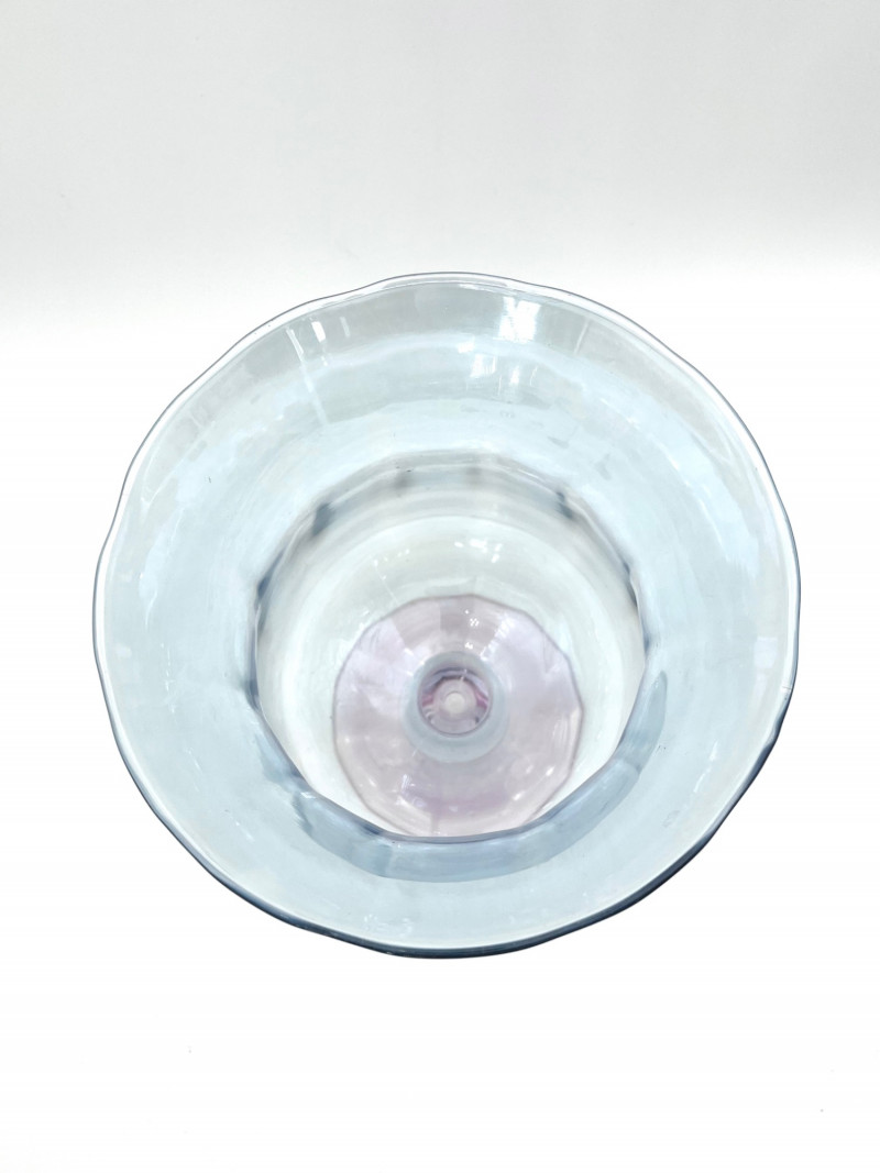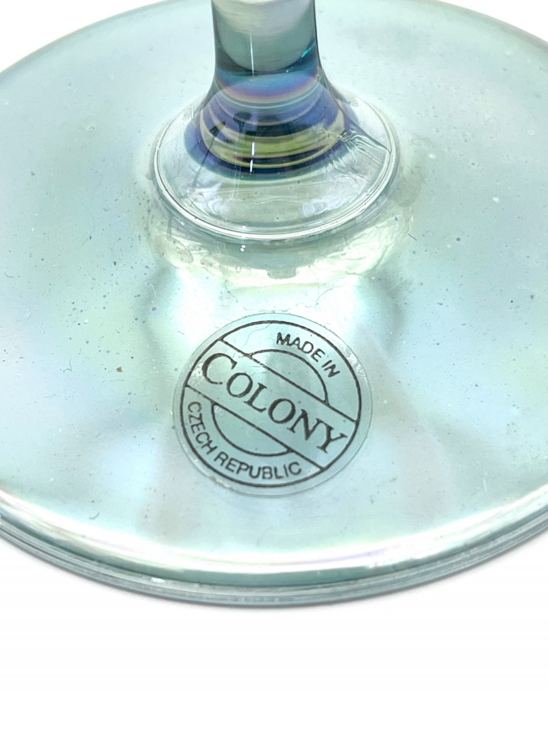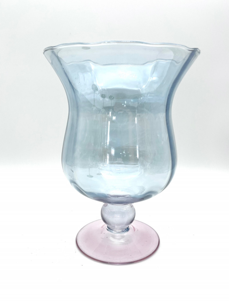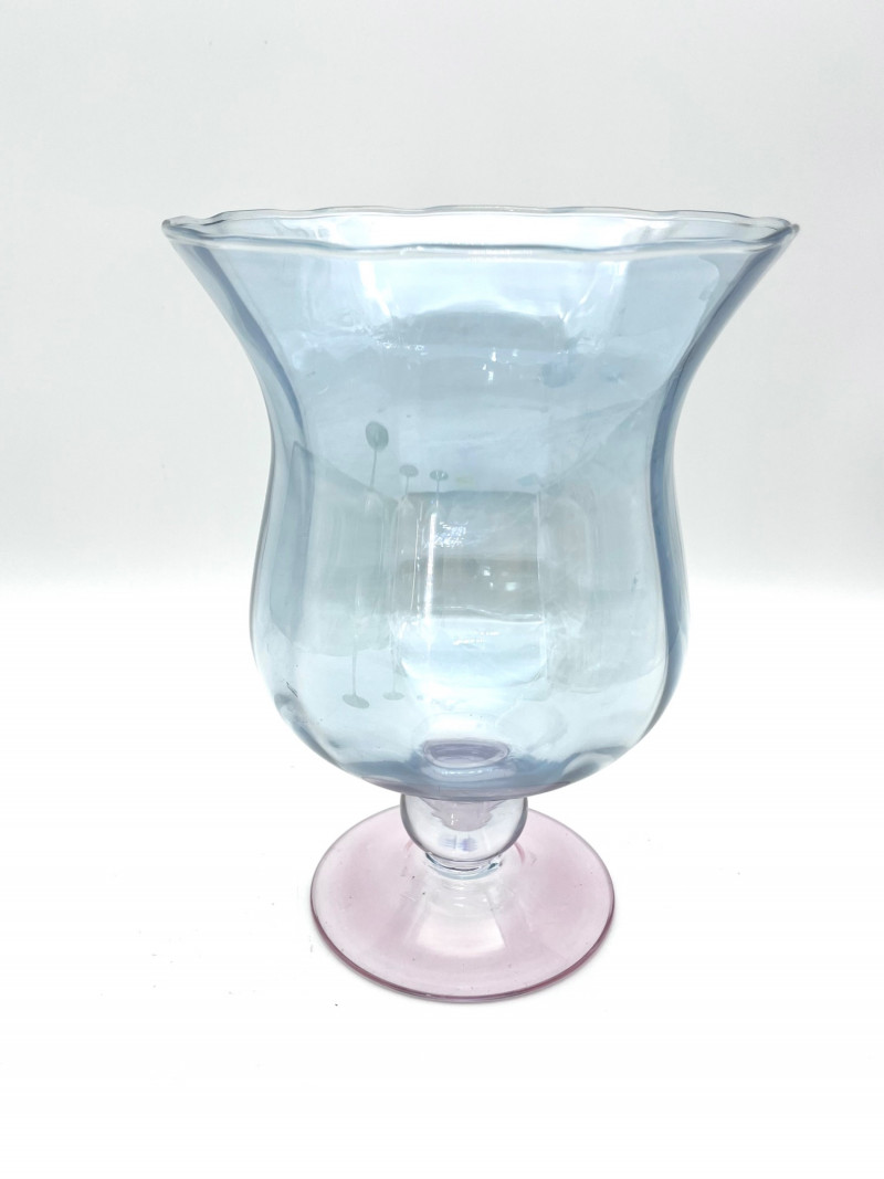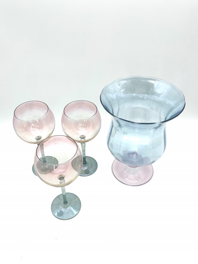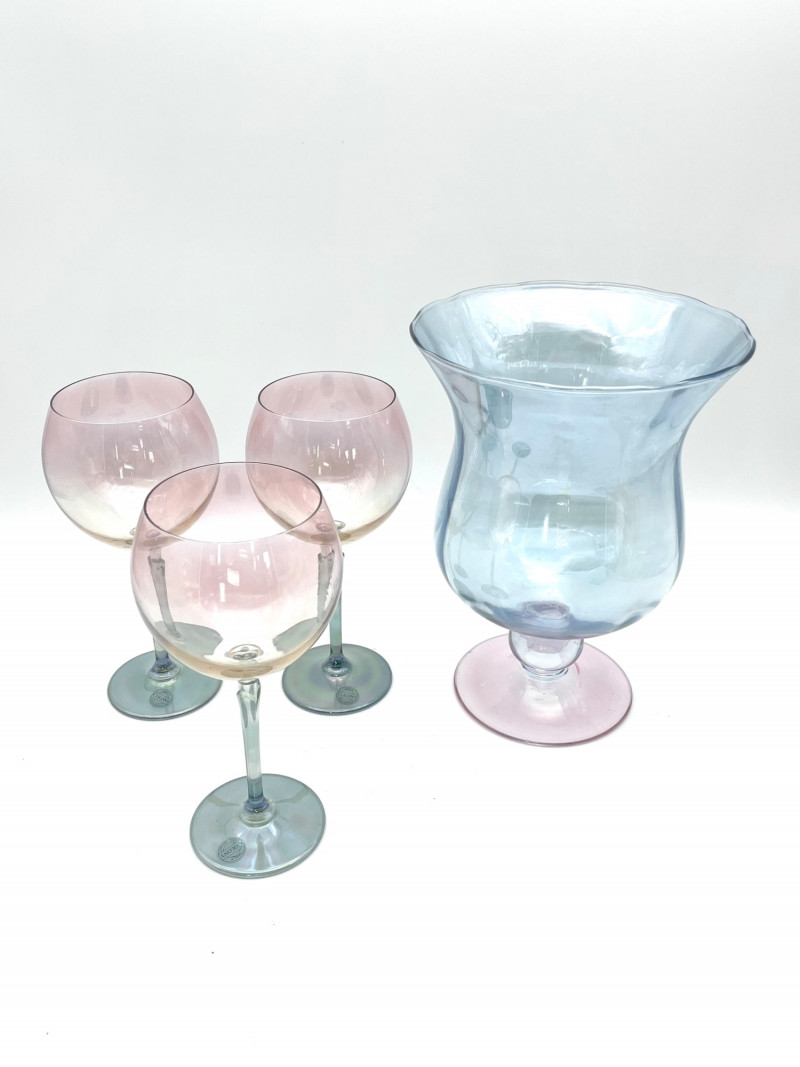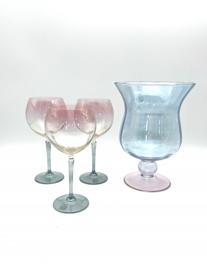 Colony Pink Tulip Balloon Glasses and Iridescent Blue and Pink Vase The vase is a light blue with a pink foot, all with a light iridescent finish. It stands 10" tall and 8" wide. The wine glasses are 8" tall with lovely green stems and bowls that fade from a pale yellow at the bottom to a warm pink at the top.