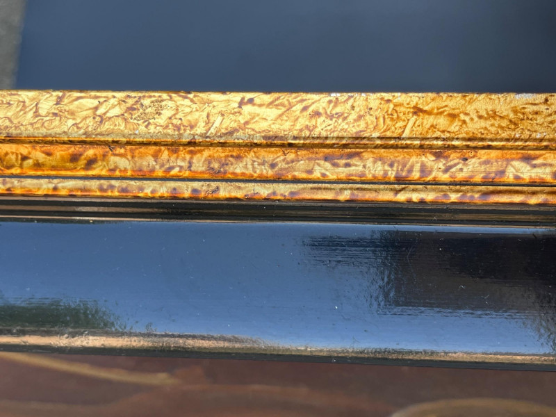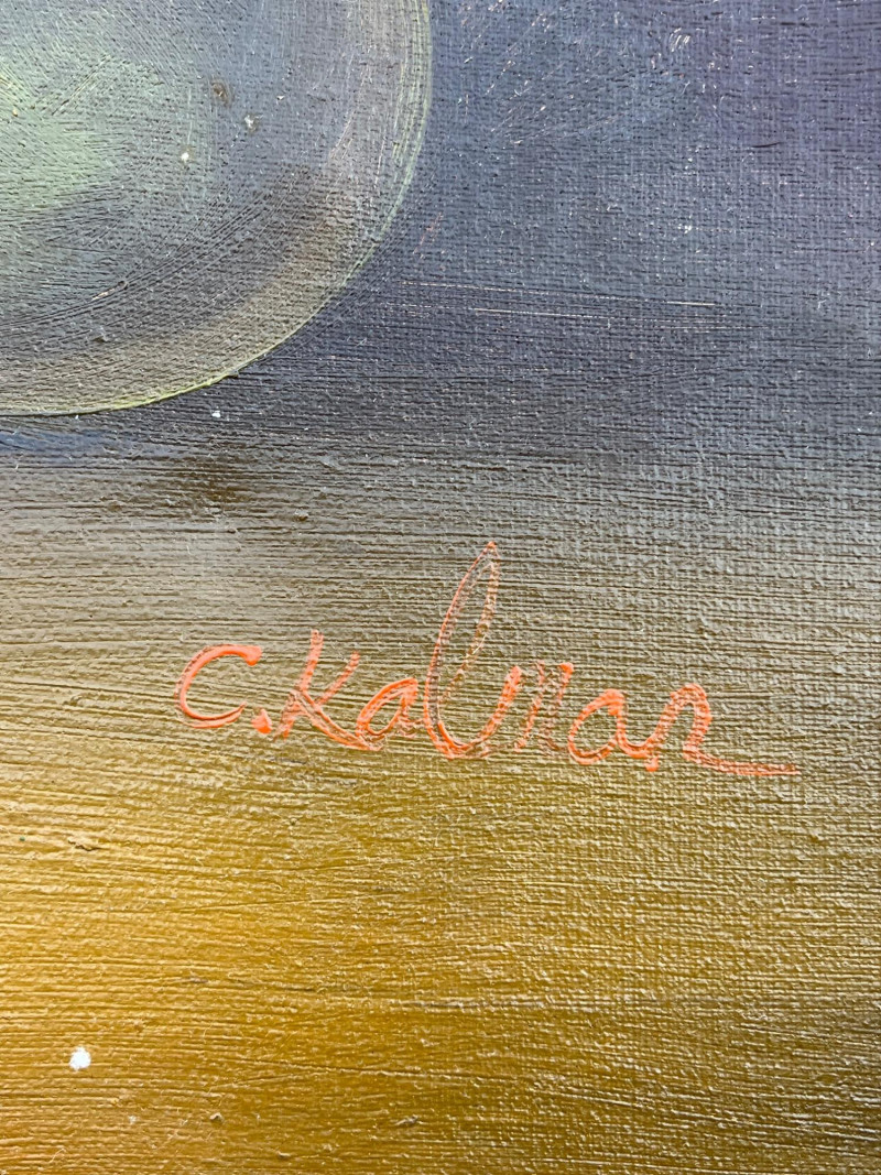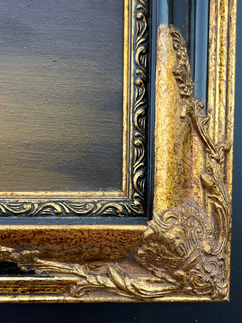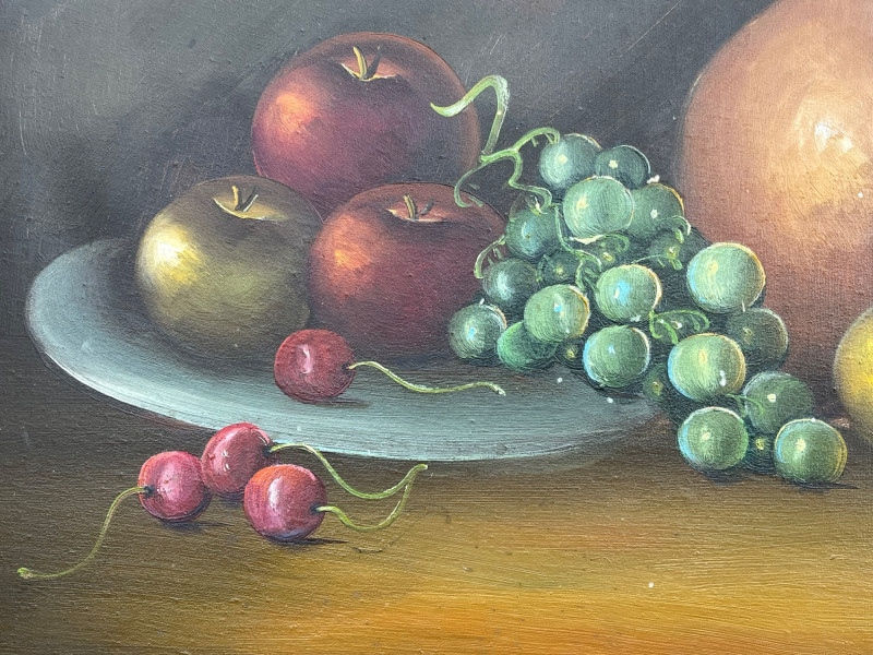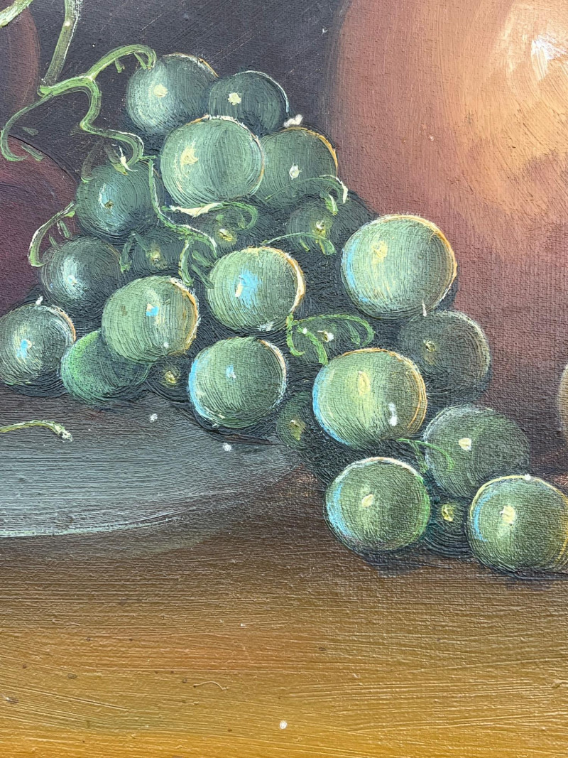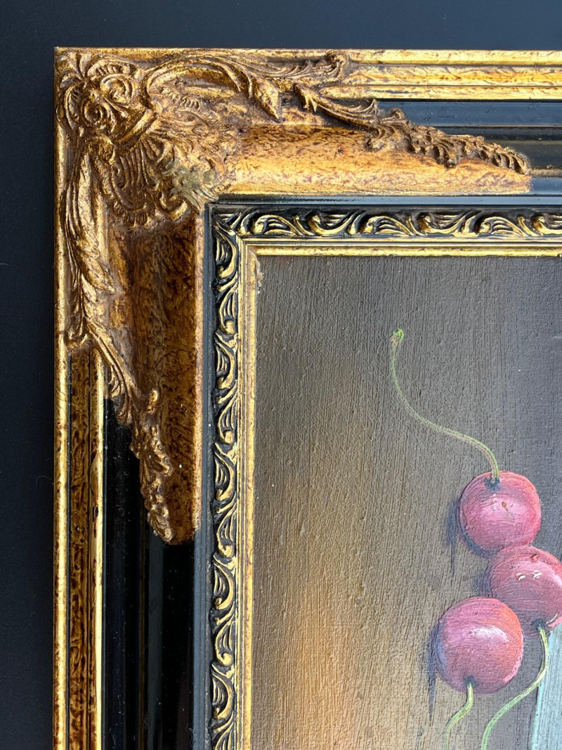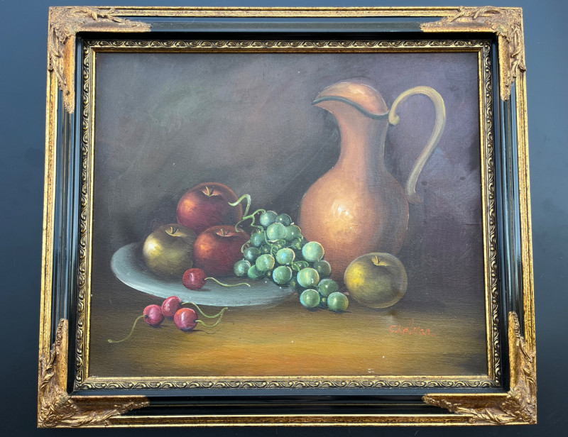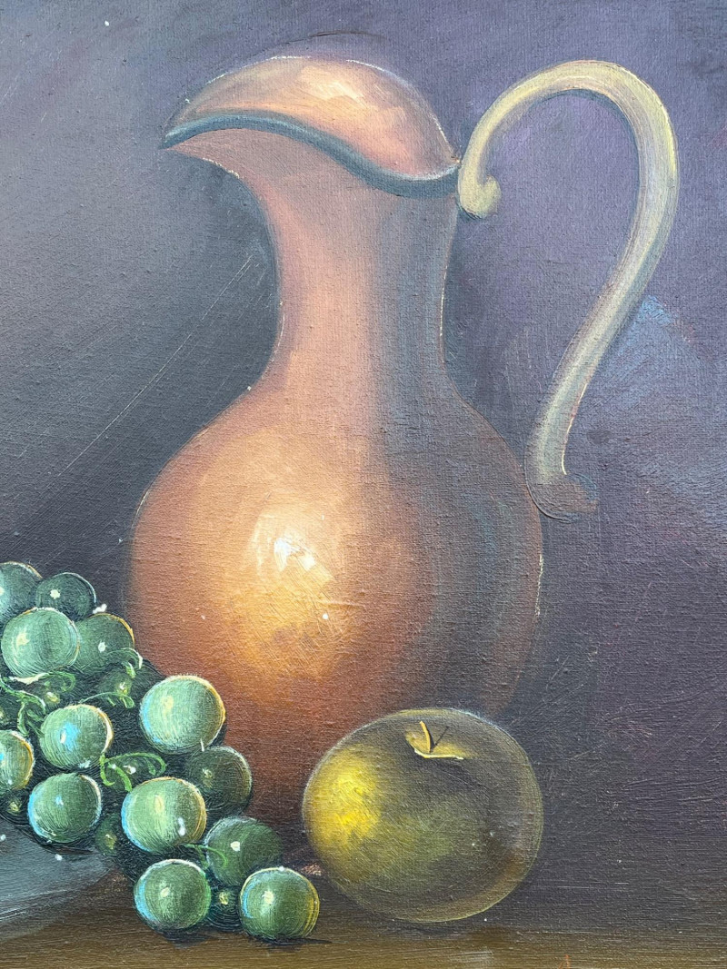 Fruit Bowl and Pitcher Still life Oil with Dramatic Gold & Black Frame This painting steals your attention immediately because of its dramatic, dark mode highlighted by brilliant accents. The painting is a vintage oil, signed by the artist. The frame is newer because the owner loved the painting so much that they had it professionally framed, likely in the late 1990's or early 2000's. The frame measures 29” x 25”.
