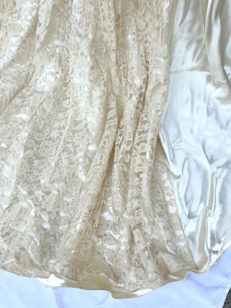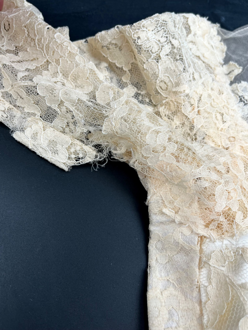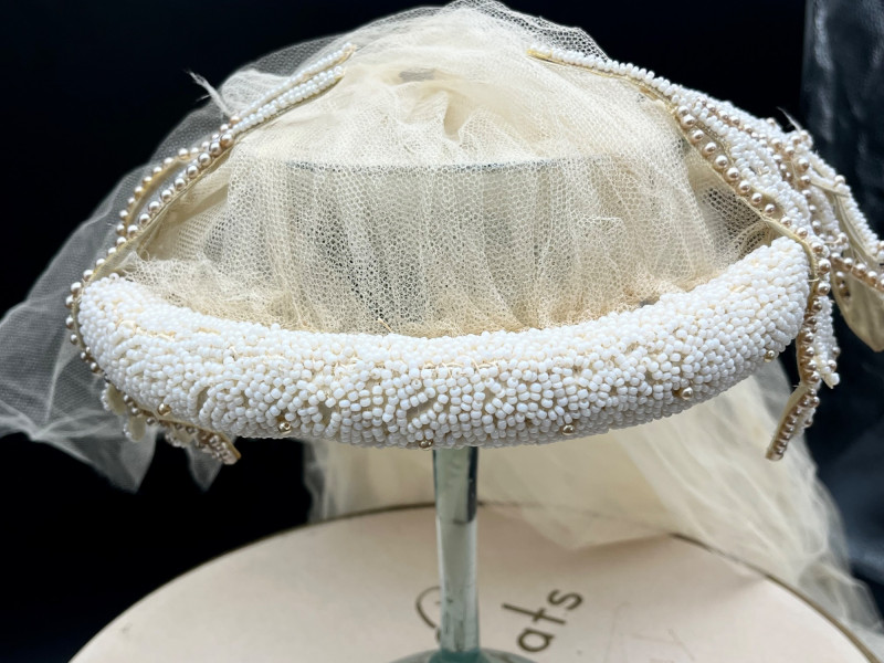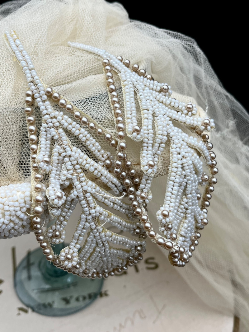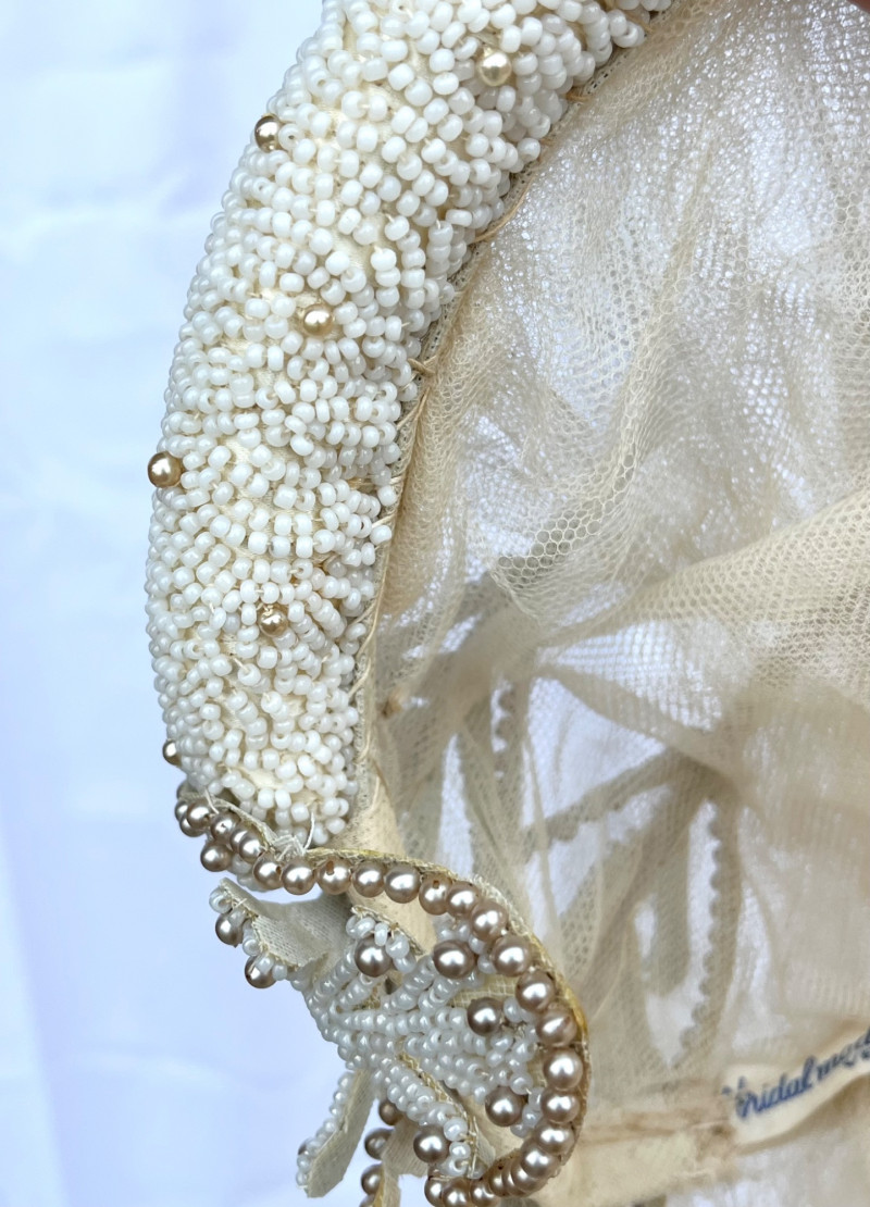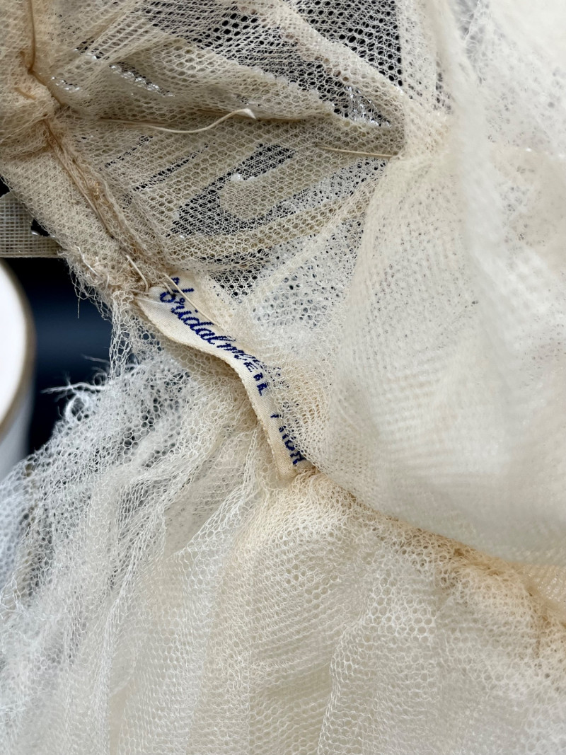 1950’s B. Altman & Co. 5th Ave NY Wedding Dress, Veil, and Shoes Wedding dress styles of the 1950's brought us much of what is still popular today: princess bodices with full skirts, feminine silhouettes, and sweetheart necklines in elegant fabrics like satin, delicate lace, tulle and beadwork. While this dress and the veil is in need of repair and/or restoration, the elements are all there! Luxurious satin, delicate tulle and lace, and intricate beads. True elegance never goes out of fashion! My photos really don't do this set nearly the justice it deserves because I just didn't have the space to spread the dress out without risking further damage. The train is at least 6 feet behind where the bottom seem would be. The shoes are a very small size 5 or 6 with a leather sole.