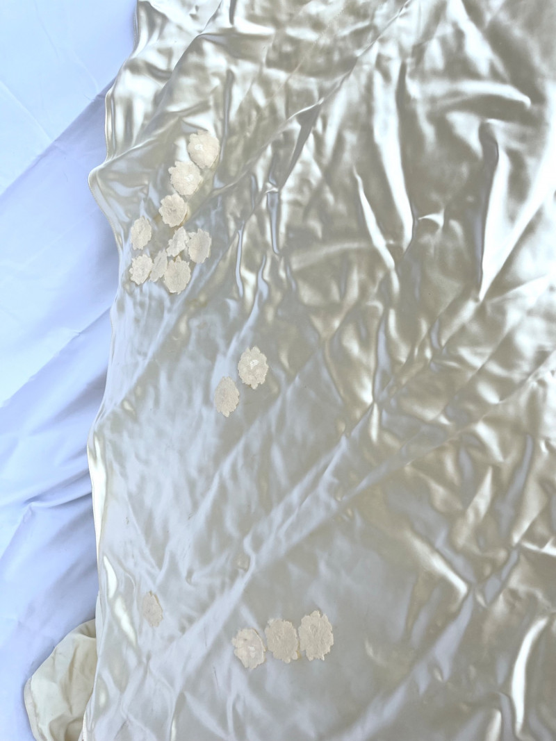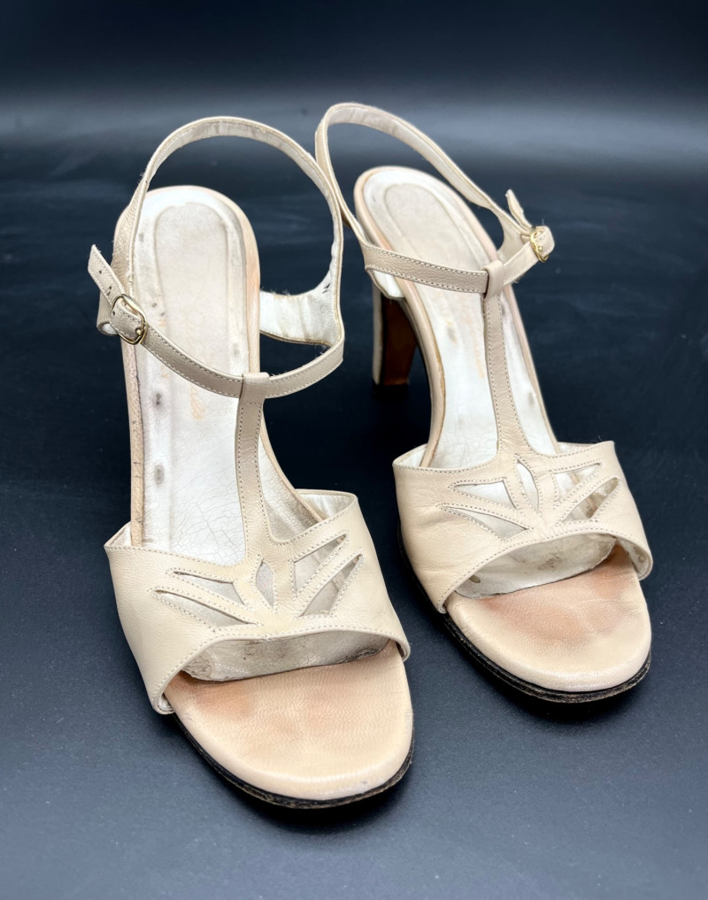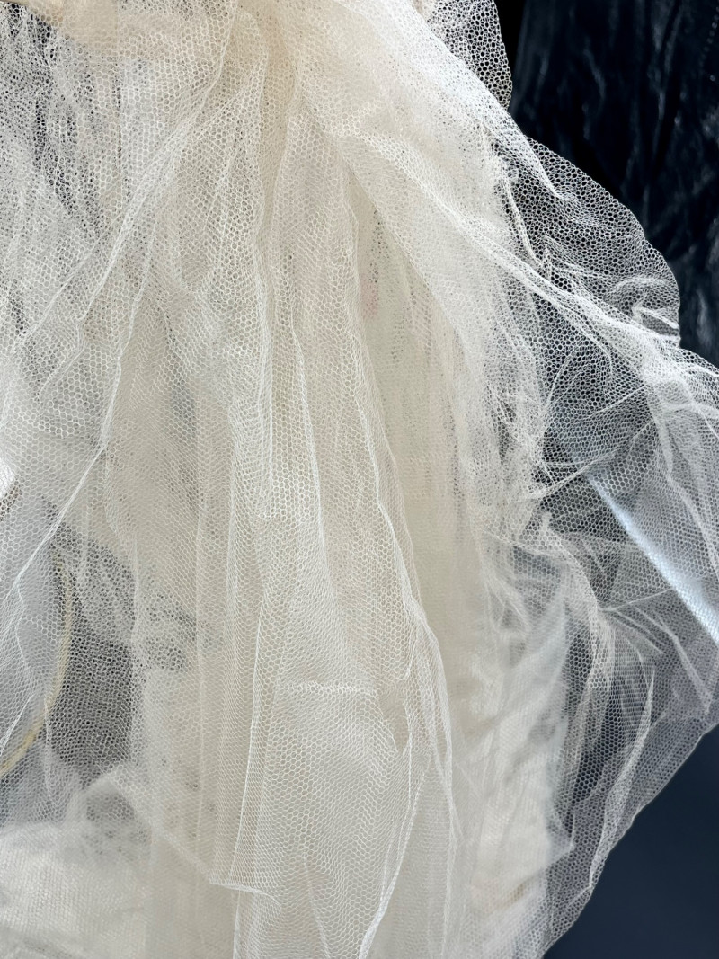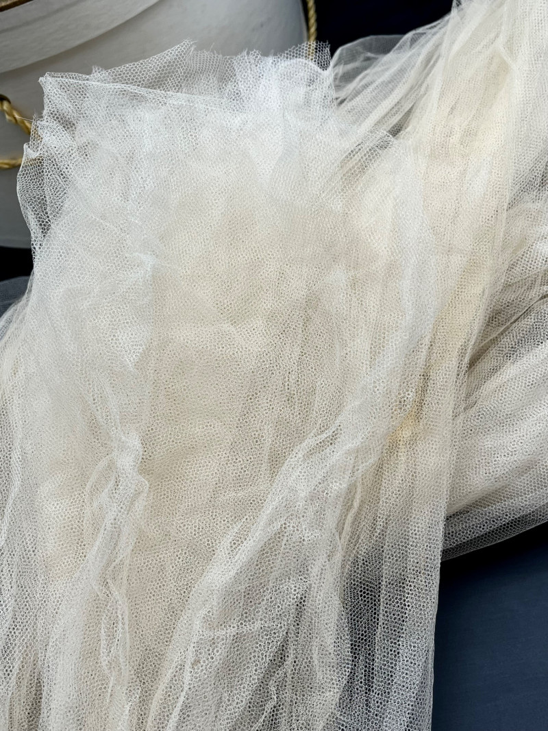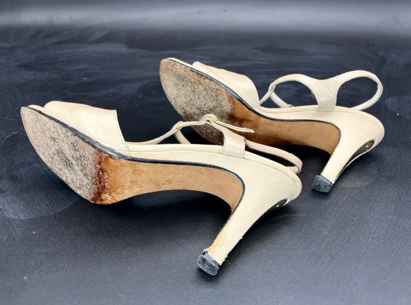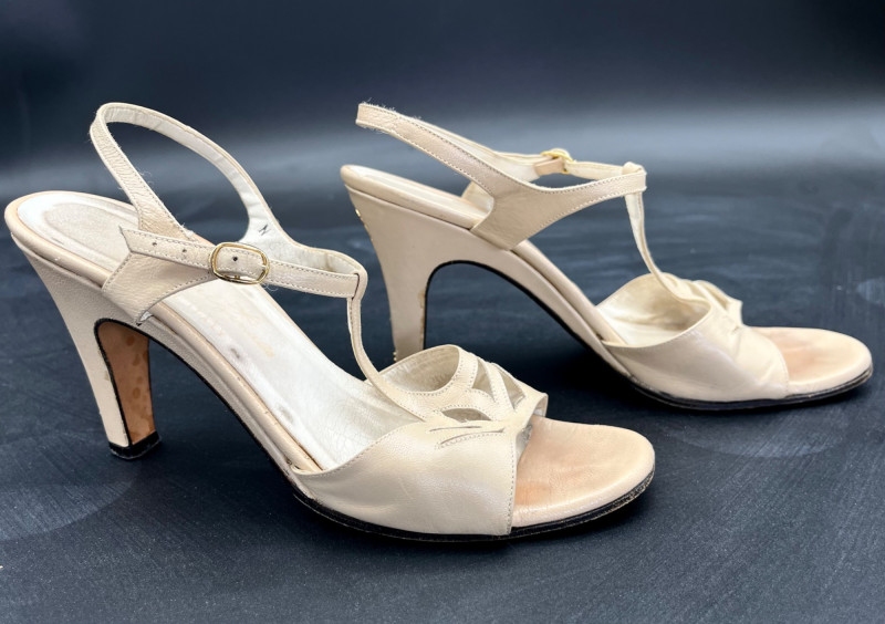 1950’s B. Altman & Co. 5th Ave NY Wedding Dress, Veil, and Shoes Wedding dress styles of the 1950's brought us much of what is still popular today: princess bodices with full skirts, feminine silhouettes, and sweetheart necklines in elegant fabrics like satin, delicate lace, tulle and beadwork. While this dress and the veil is in need of repair and/or restoration, the elements are all there! Luxurious satin, delicate tulle and lace, and intricate beads. True elegance never goes out of fashion! My photos really don't do this set nearly the justice it deserves because I just didn't have the space to spread the dress out without risking further damage. The train is at least 6 feet behind where the bottom seem would be. The shoes are a very small size 5 or 6 with a leather sole.