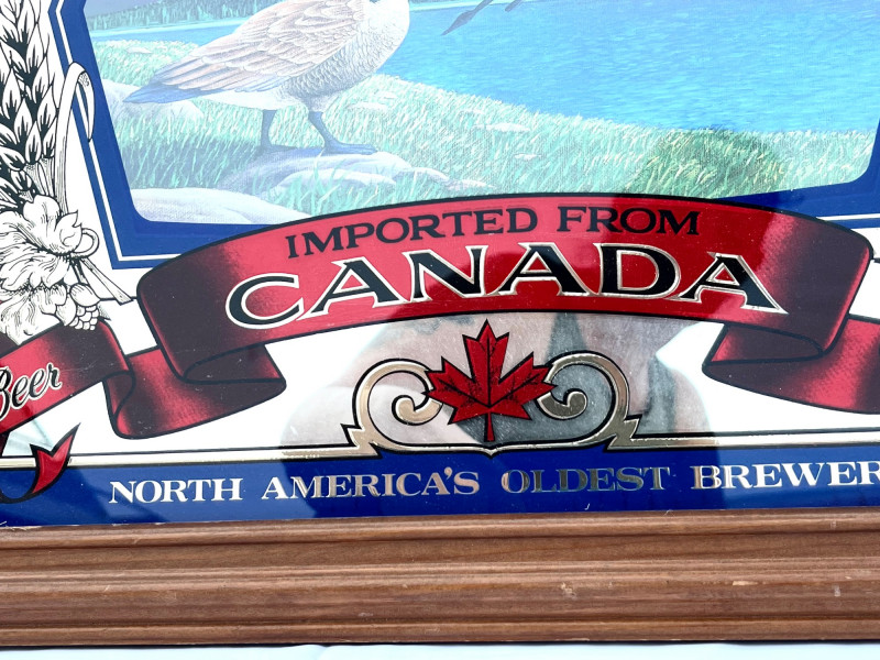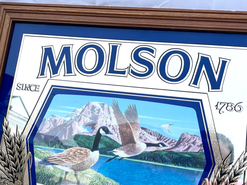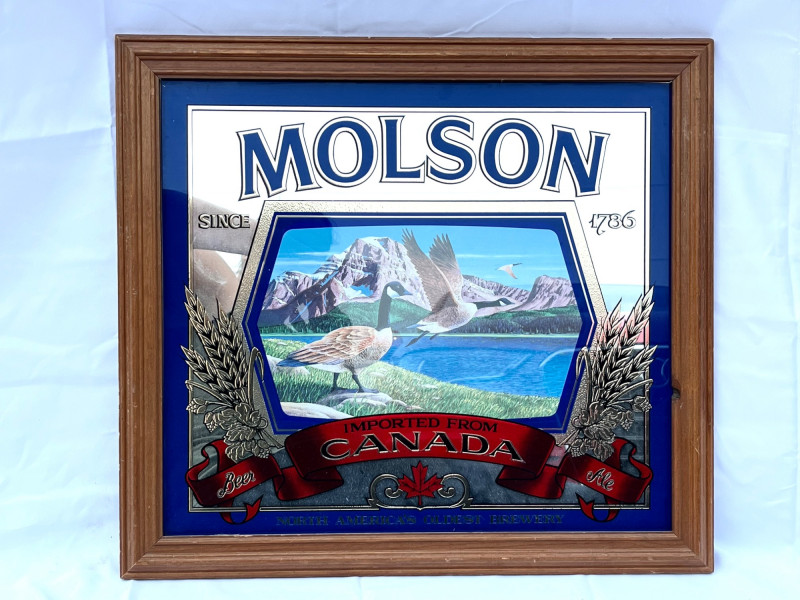 Molson Canadian Beer Promotional Oak Framed Bar Mirror This mirror is in good condition and measures 21 1/2' wide by 18 1/2" tall.