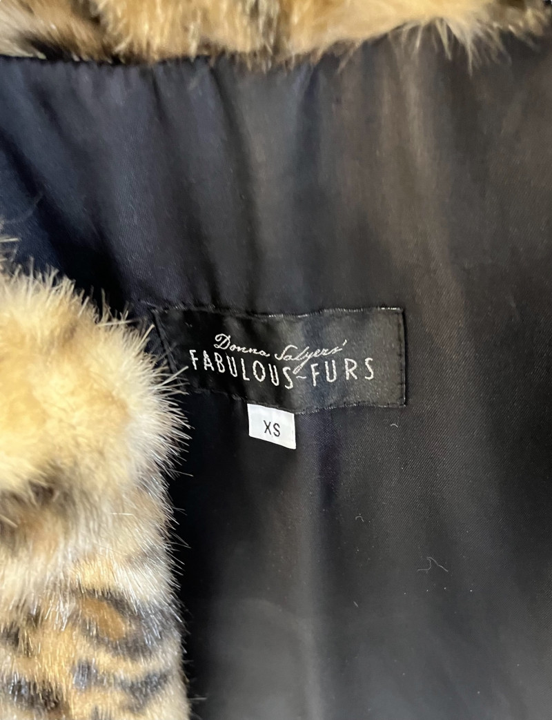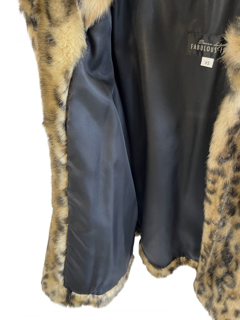 Donna Salyers Faux Leopard Fur Jacket Ladies Size XS Donna Salyers faux furs stand out from others mostly because of their use of high quality materials. This leopard pattern jacket is a perfect example of that quality in its color dimension and consistency and soft texture. The jacket is lined with a dark brown satin finishing the elegant look that a fur coat should have.
