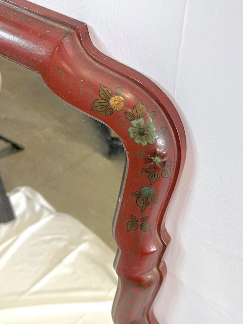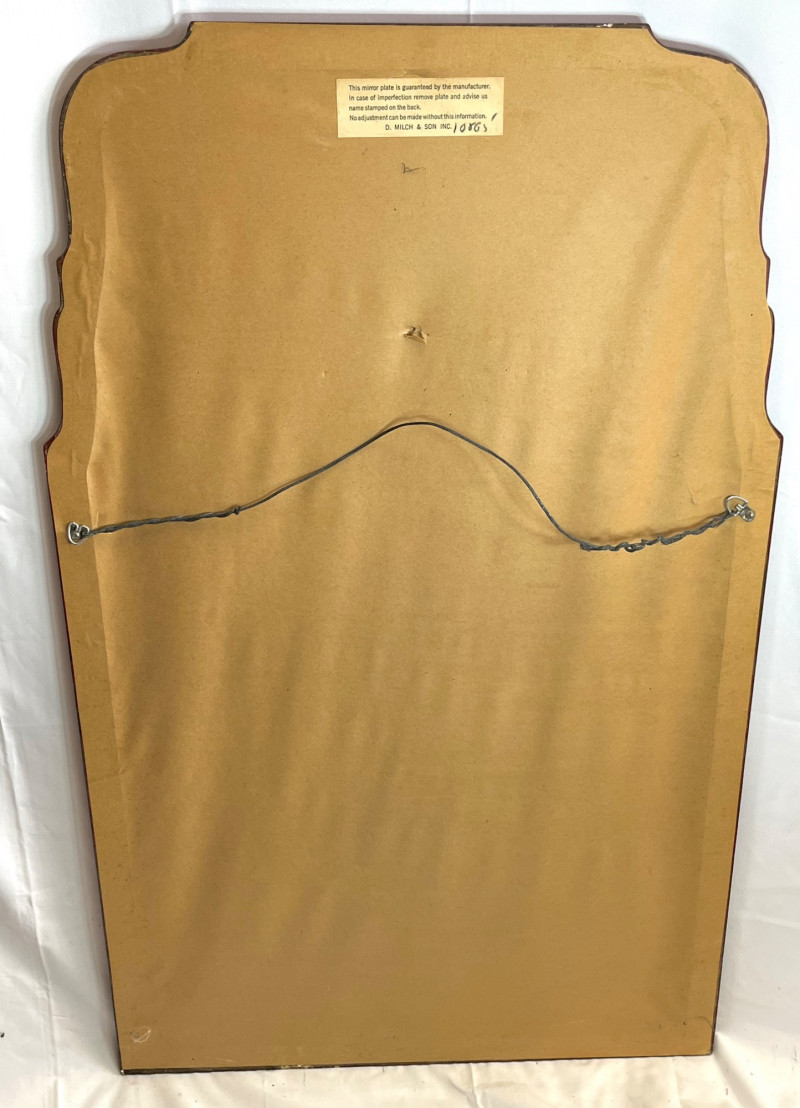 D. Milch and Sons Large Framed Mirror Painted in Asian Inspired Motifs D. Milch & Sons mirrors are highly sought after for their quality construction and artistic details. This mirror is finished to give it a rosewood look and painstakingly detailed with floral and Asian inspired art. The back of the mirror has its original paper backing that prevents damage to the mirror and has its original D. Milch & Sons Label as well. The wire hanger is intact and sturdy enough to easily handle the hefty weight of this mirror. Measures 36 1/2" tall and 22 1/4" wide.