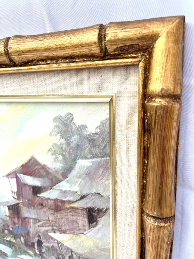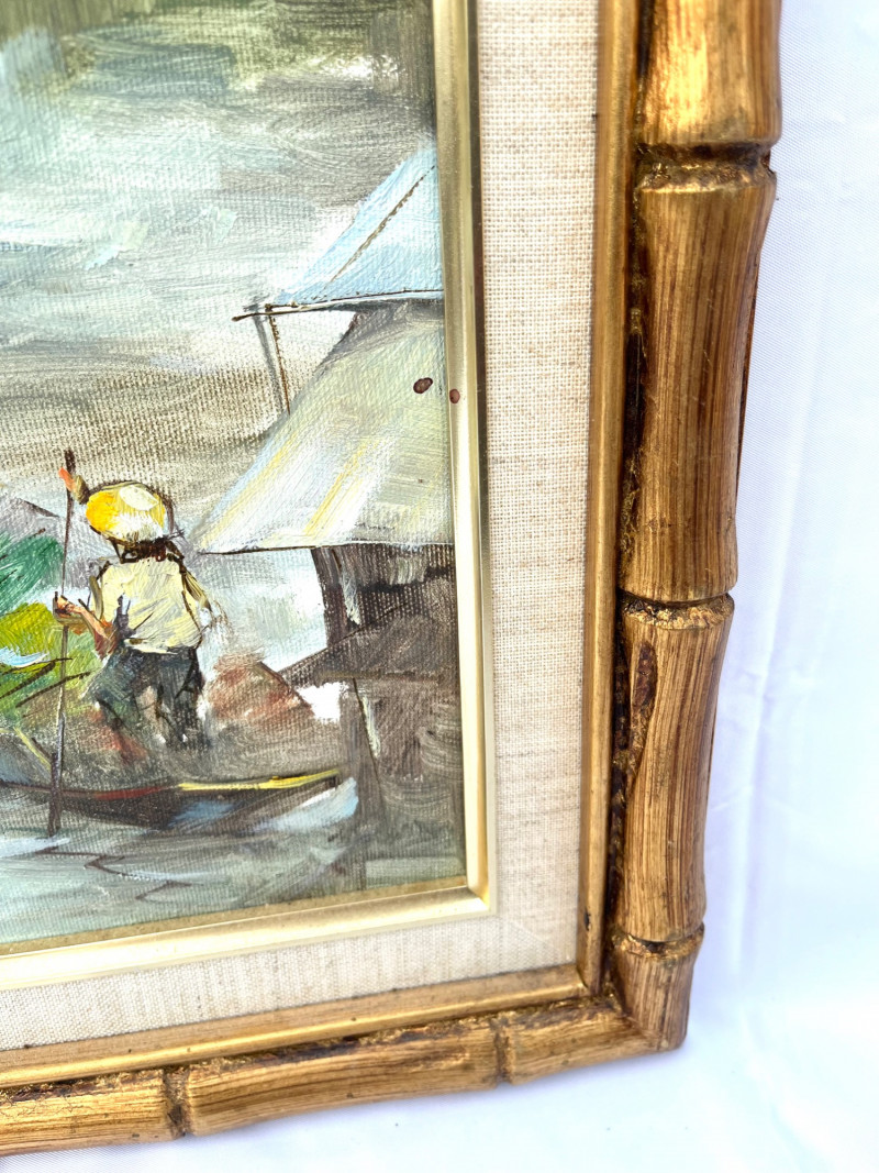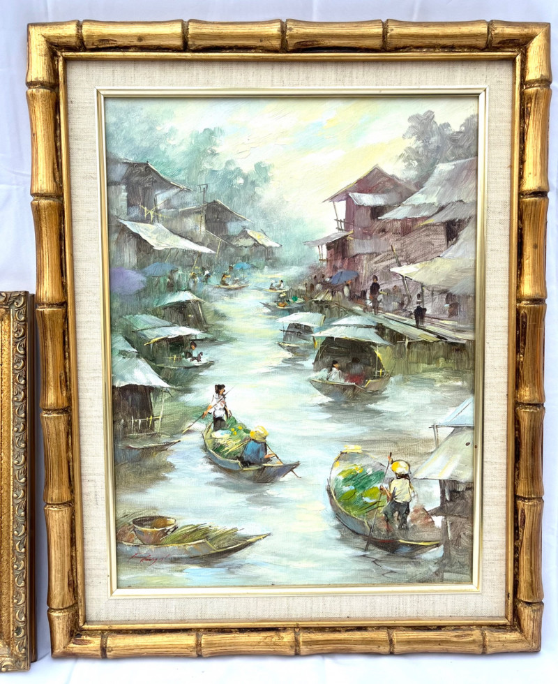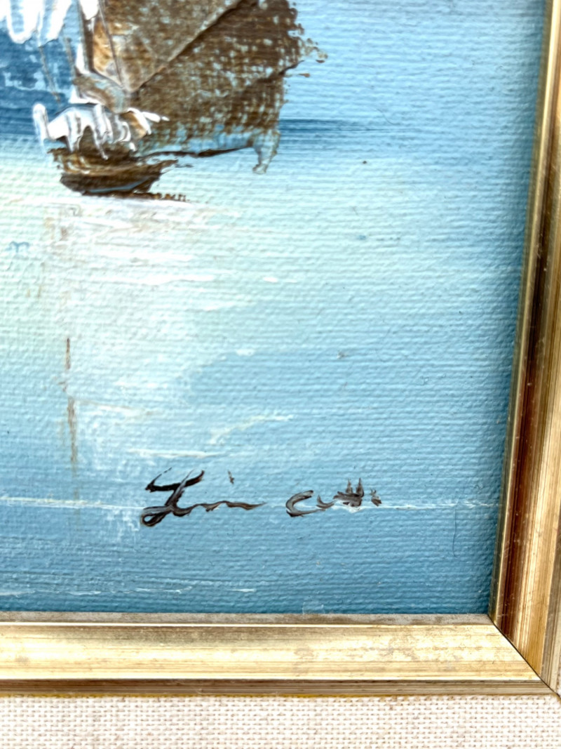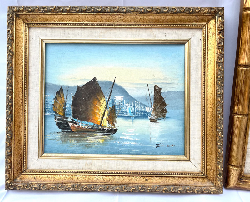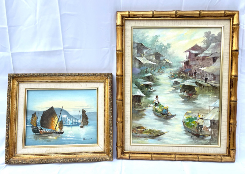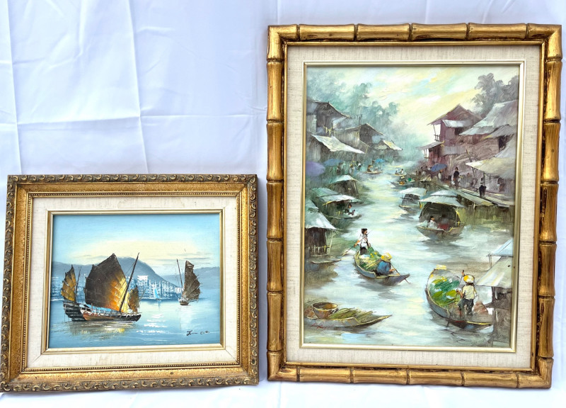 Chinese Junk Boats and Thai Fishing Boats Framed Oil Paintings The larger painting is an oil on stretched canvas, professionally framed measuring 19 3/4" tall by 15 1/2" wide. The smaller painting is also and oil on stretched canvas, professionally framed, and measures 13 3/4" tall x 12" wide. The smaller is signed by the artist while the larger does not show an artist's signature.