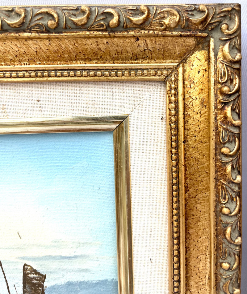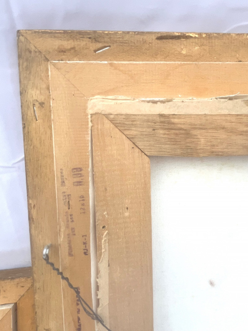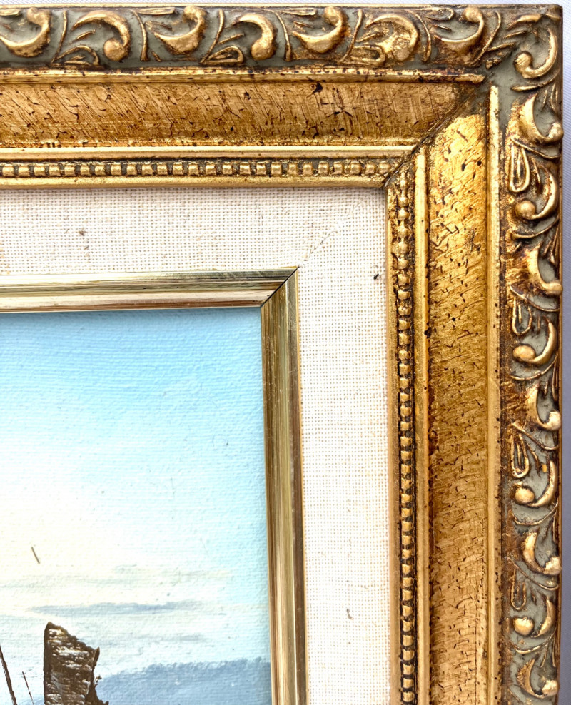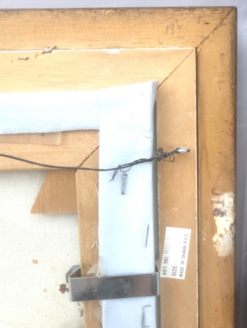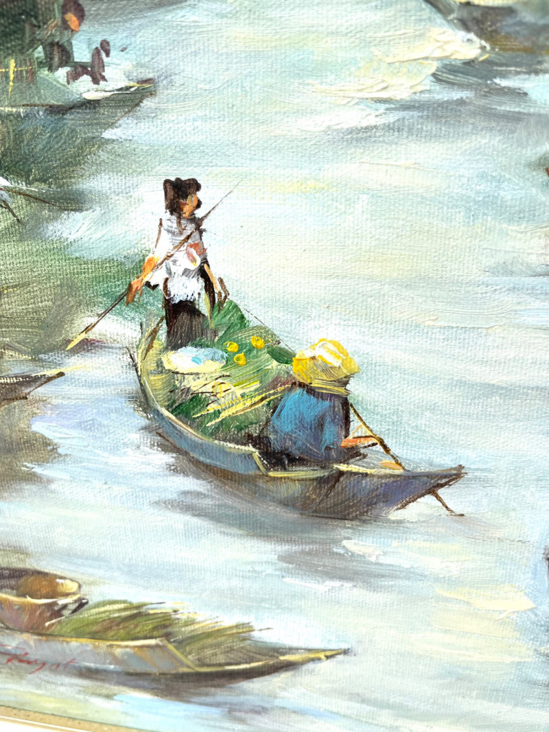 Chinese Junk Boats and Thai Fishing Boats Framed Oil Paintings The larger painting is an oil on stretched canvas, professionally framed measuring 19 3/4" tall by 15 1/2" wide. The smaller painting is also and oil on stretched canvas, professionally framed, and measures 13 3/4" tall x 12" wide. The smaller is signed by the artist while the larger does not show an artist's signature.