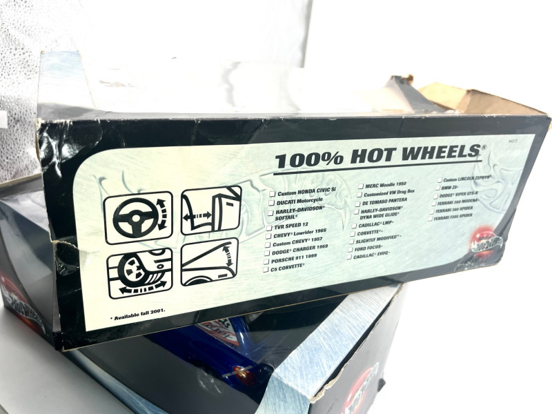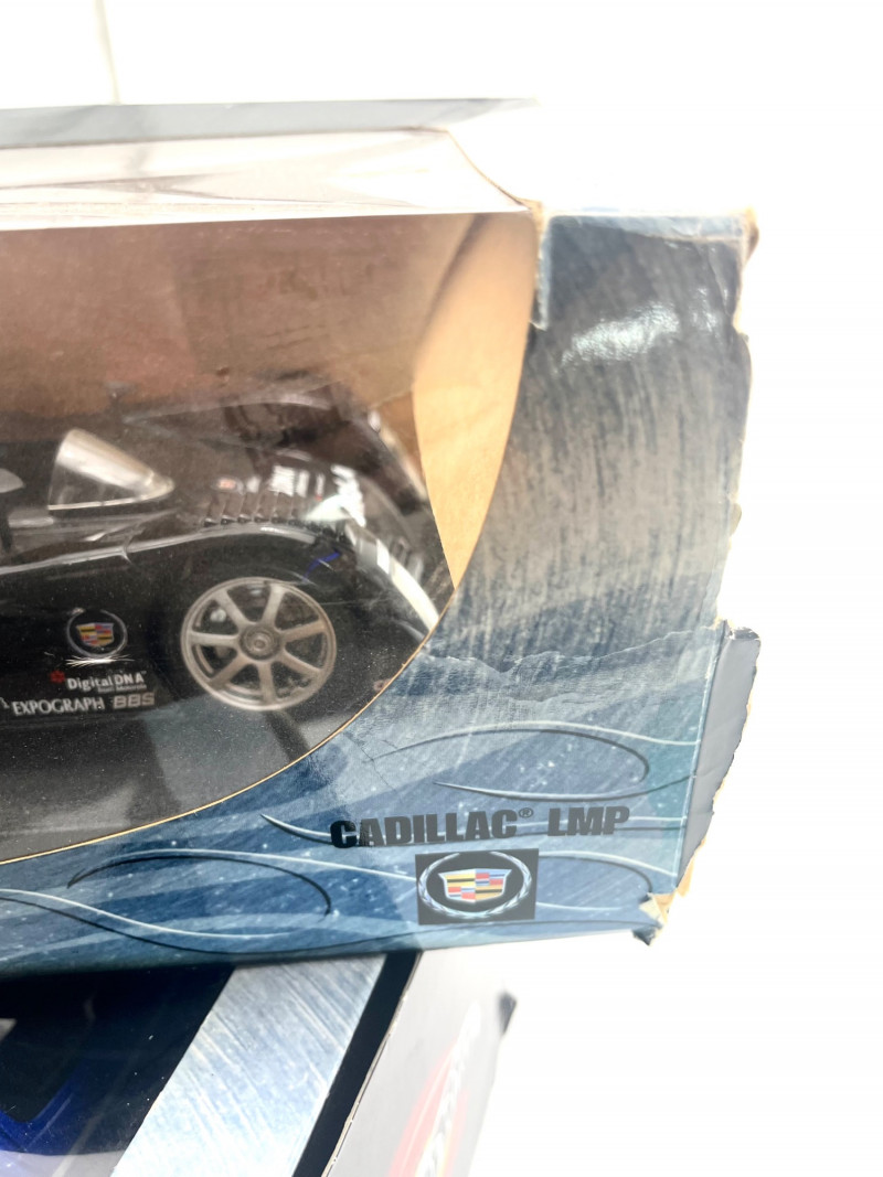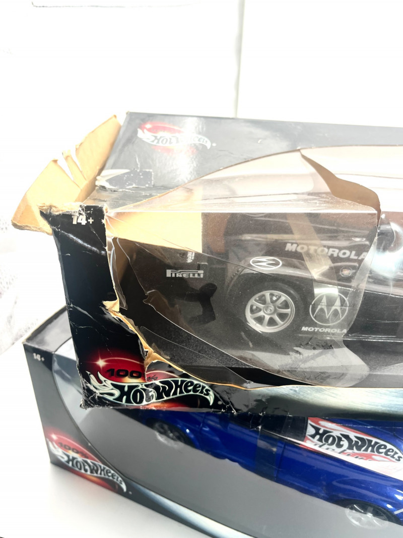 Hot Wheels 1:18 Models PT Cruiser and Cadillac LMP The Cadillac LMP has been displayed outside of the box and is dusty. The box is squished but could be "repaired" with tape for the sake of storing the model if needed which is why I'm including it. The PT Cruiser looks like its always been in the box.