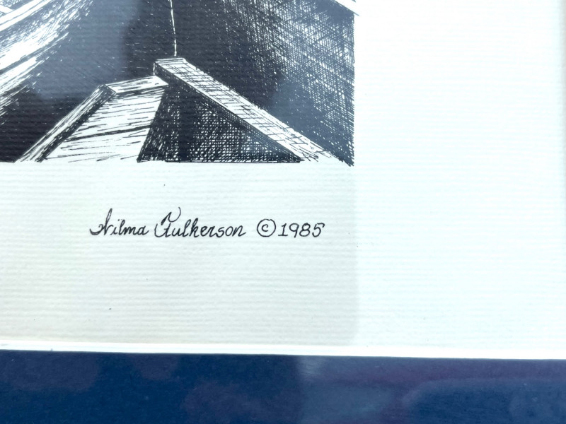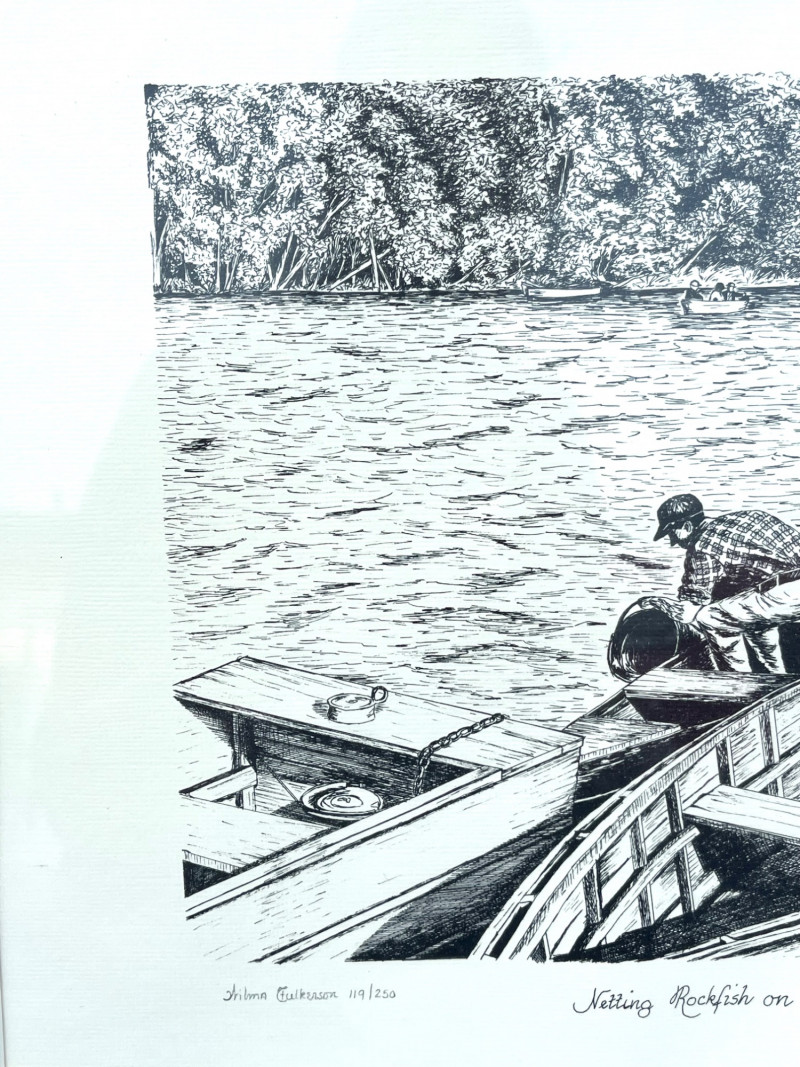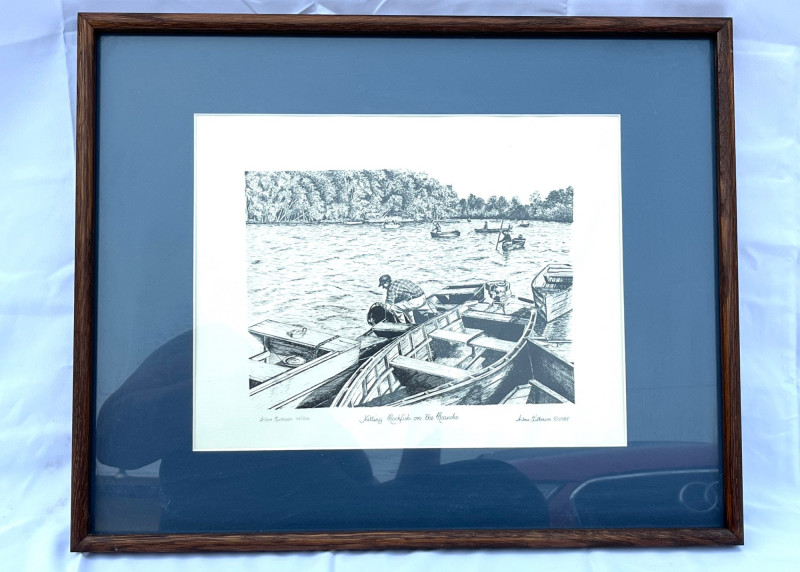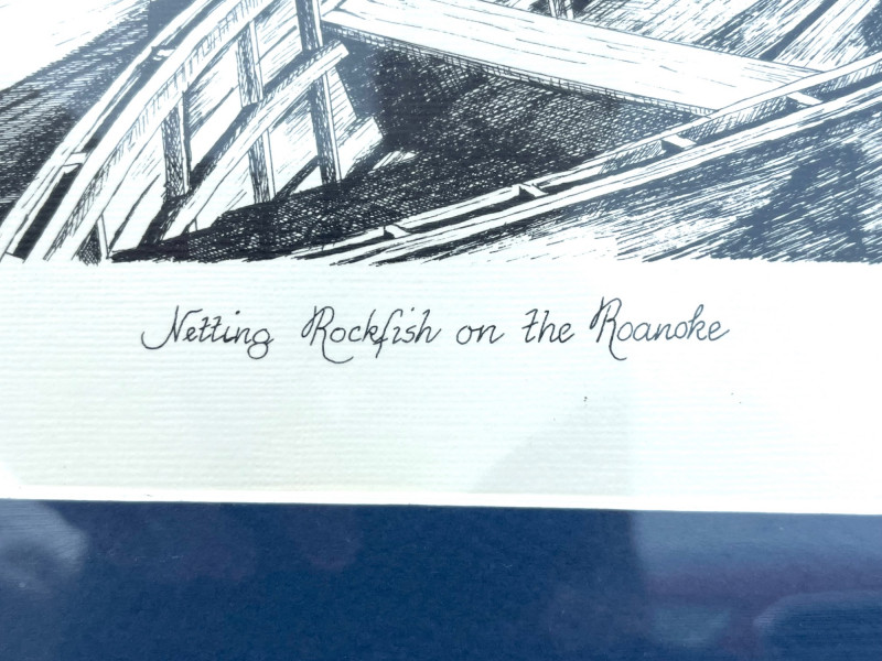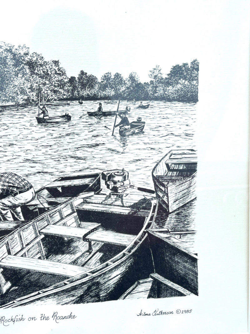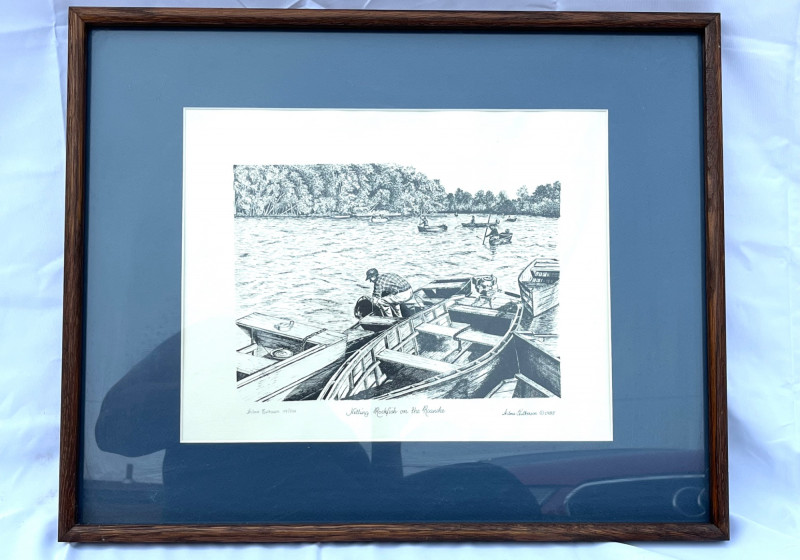 Fishing on the Roanoke Drawing Signed Print By Wilma Fulkerson c. 1985 This print is a signed by the artist and numbered 119 of a limited run of 250 (119/250). It has been professionally matted and framed and the frame measures 20 1/2" x 16 1/4".