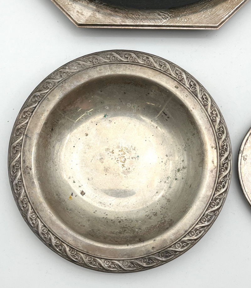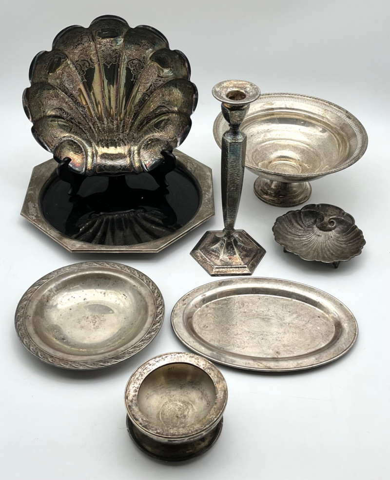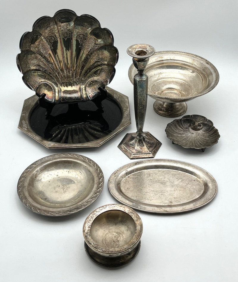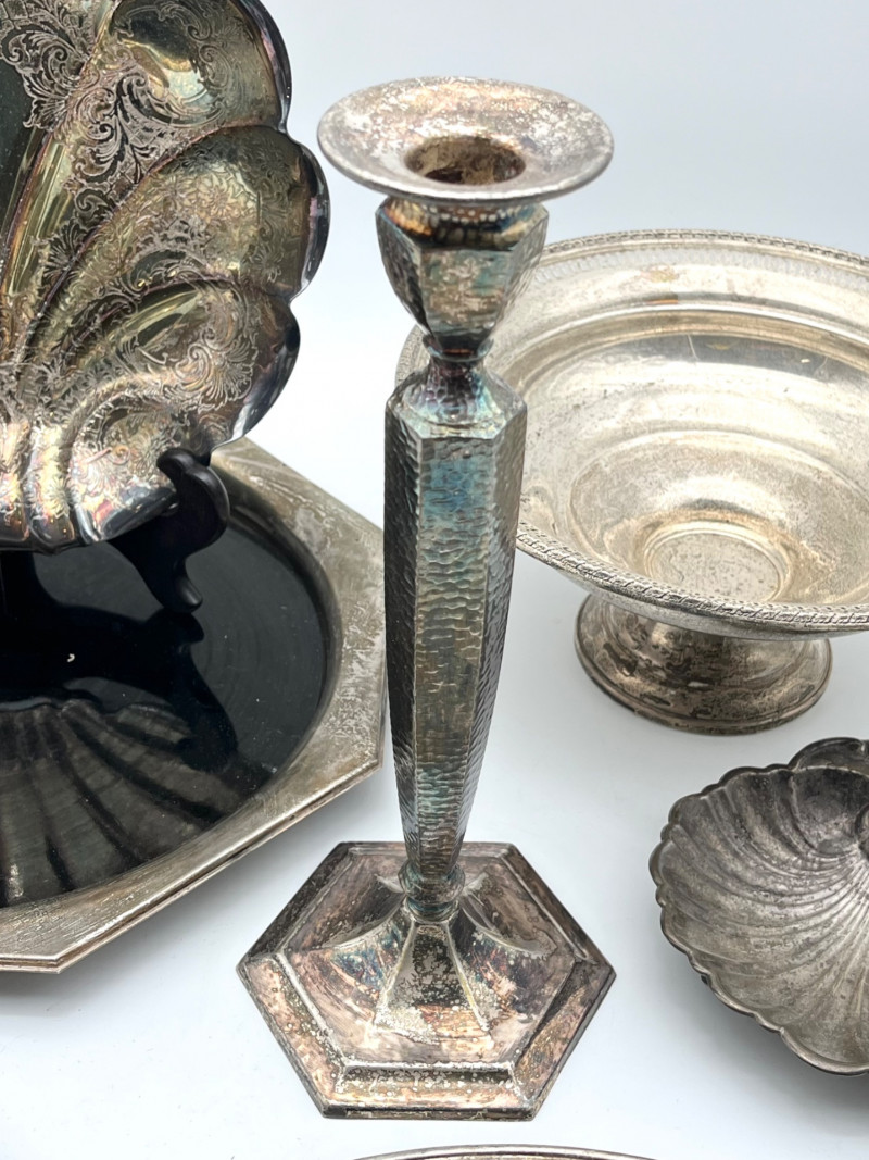 Collection of Silver Plate Pieces Featuring Bowls Platters Candlestick This pretty grouping of silver plate items includes everything shown. There is a variety of sizes, styles pieces and brands. For perspective, the candlestick in the center 10 1/2" tall. A unique piece that isn't seen too often is an octagon shaped plate with a black enameled center. All pieces are in good vintage condition.