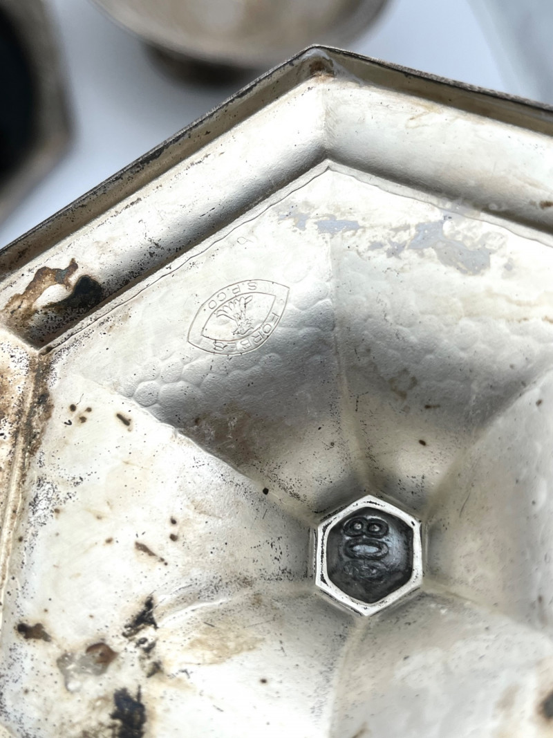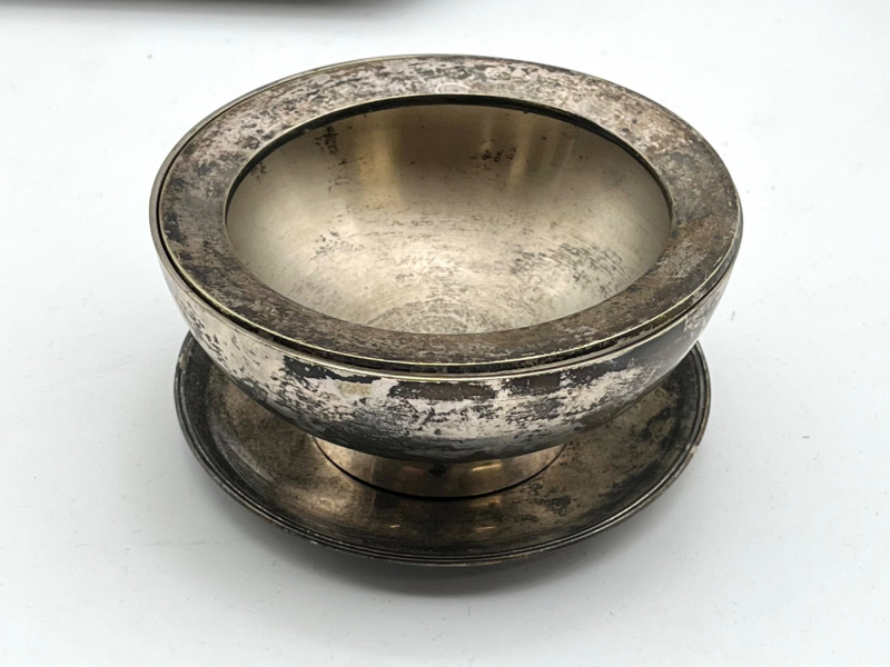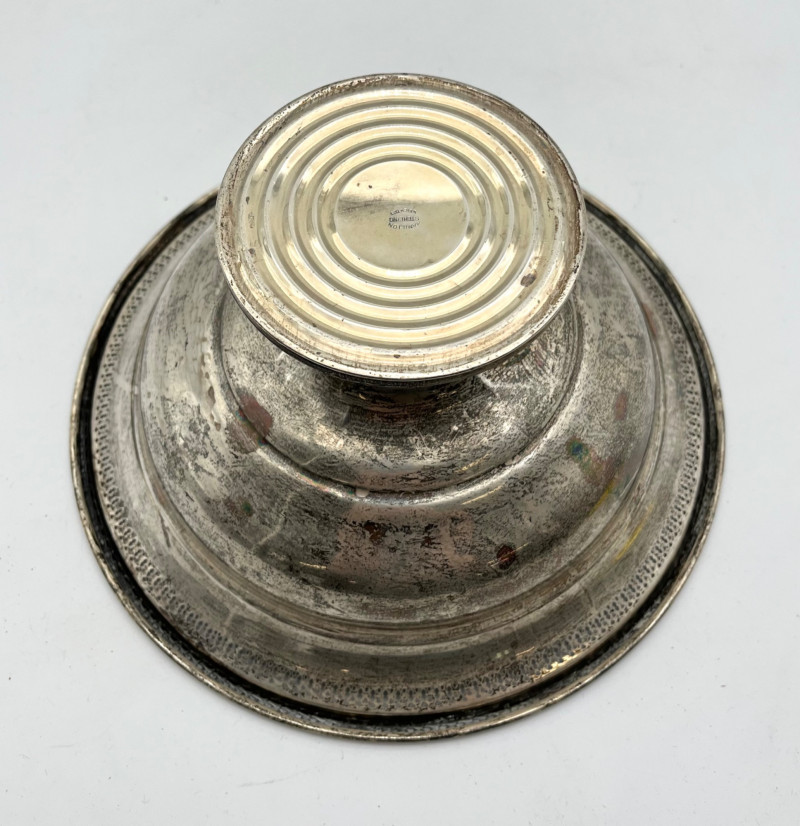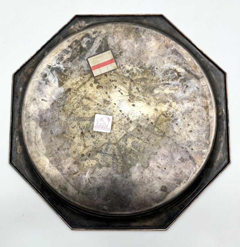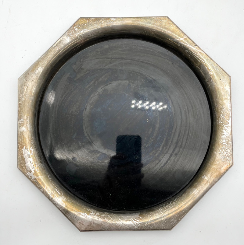 Collection of Silver Plate Pieces Featuring Bowls Platters Candlestick This pretty grouping of silver plate items includes everything shown. There is a variety of sizes, styles pieces and brands. For perspective, the candlestick in the center 10 1/2" tall. A unique piece that isn't seen too often is an octagon shaped plate with a black enameled center. All pieces are in good vintage condition.