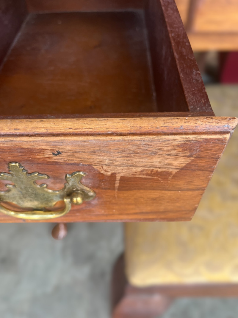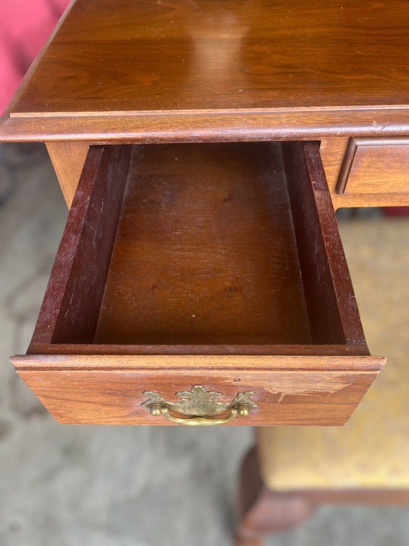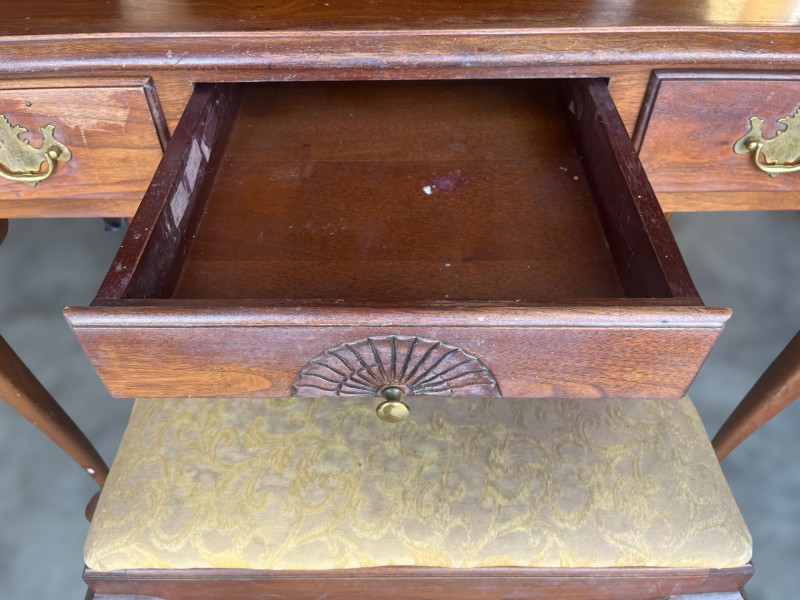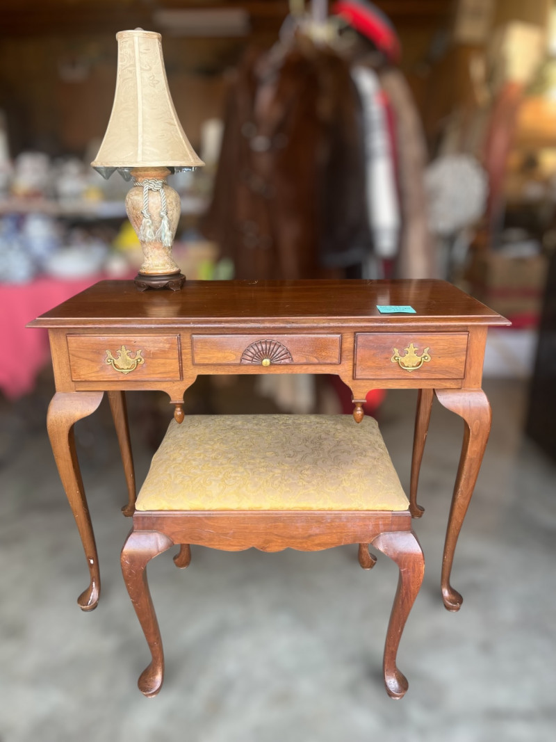 Vintage Vanity with Matching Stool and Lamp The desk is 40" across, 30 1/2" tall and 15" deep (front to back). The flaws are cosmetic and this would be a great piece of furniture as it is or for restoration. The stool is 22" wide 19" tall and 19" deep. The top is detached but needs to be reupholstered which might make that project a little easier! The lamp is 24" tall. This is a ceramic lamp with a wooden base. Lamp has not been tested.