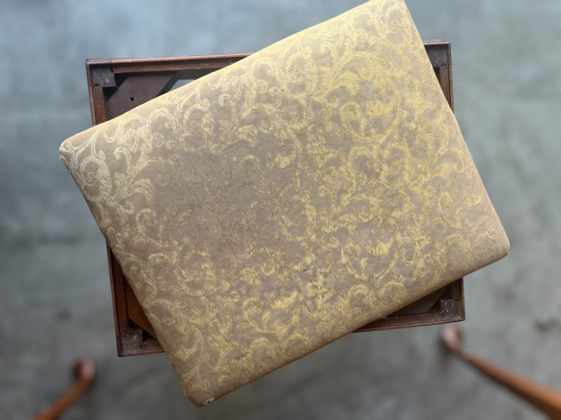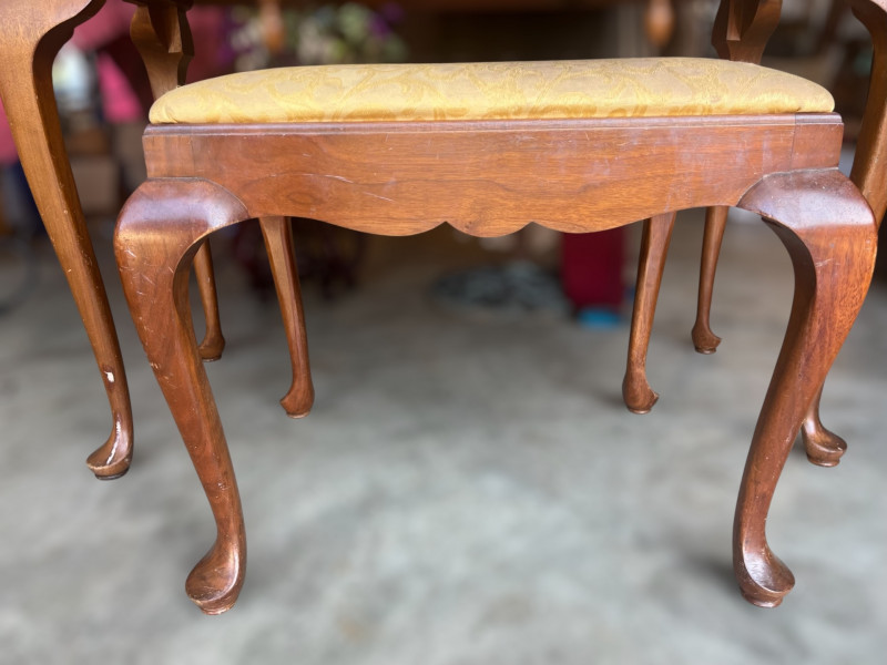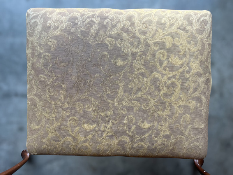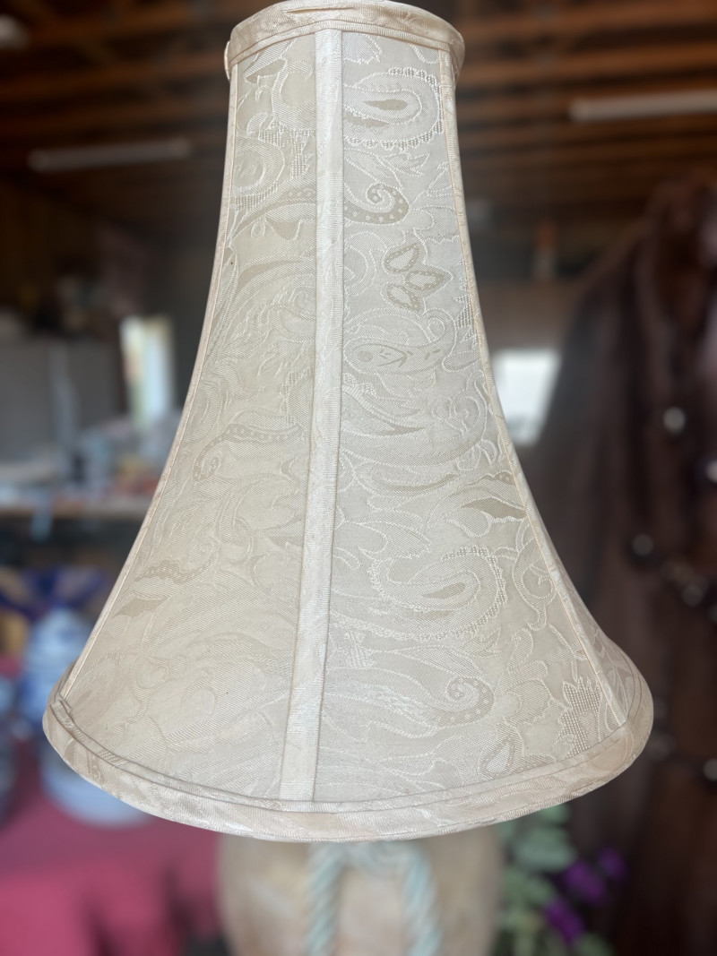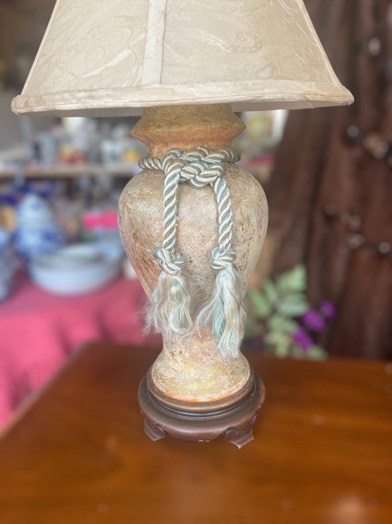 Vintage Vanity with Matching Stool and Lamp The desk is 40" across, 30 1/2" tall and 15" deep (front to back). The flaws are cosmetic and this would be a great piece of furniture as it is or for restoration. The stool is 22" wide 19" tall and 19" deep. The top is detached but needs to be reupholstered which might make that project a little easier! The lamp is 24" tall. This is a ceramic lamp with a wooden base. Lamp has not been tested.