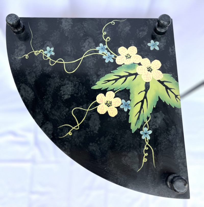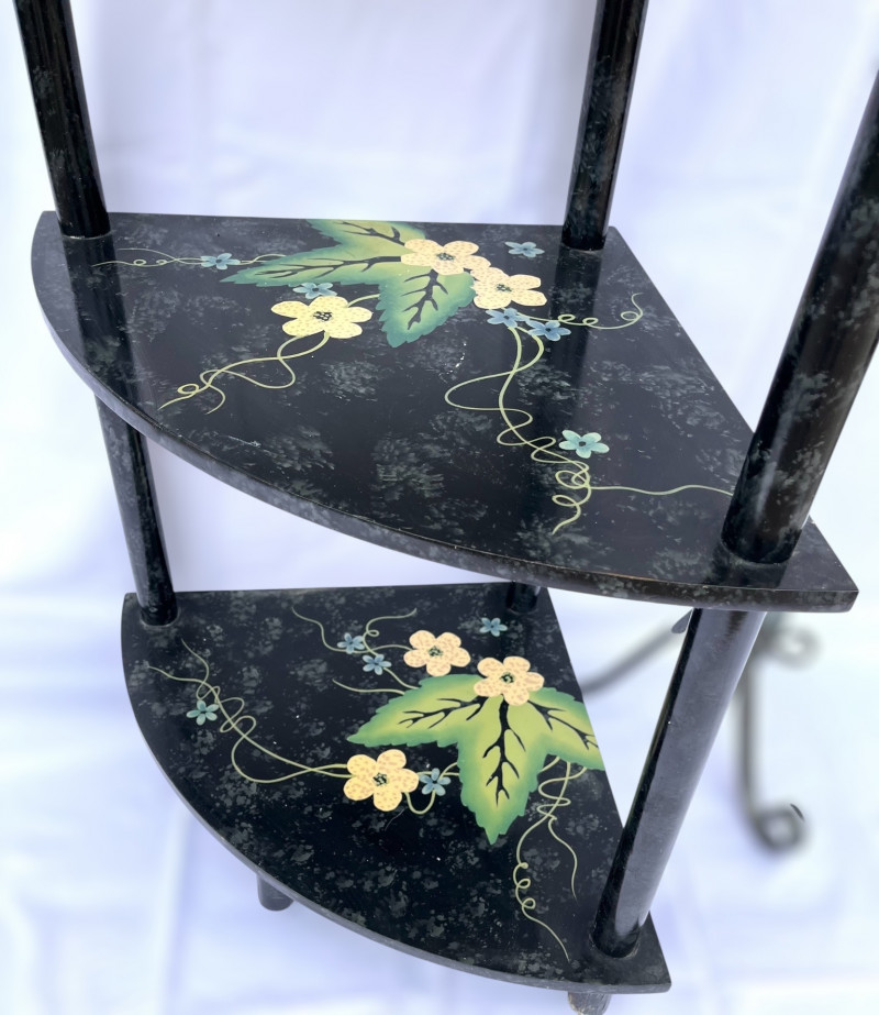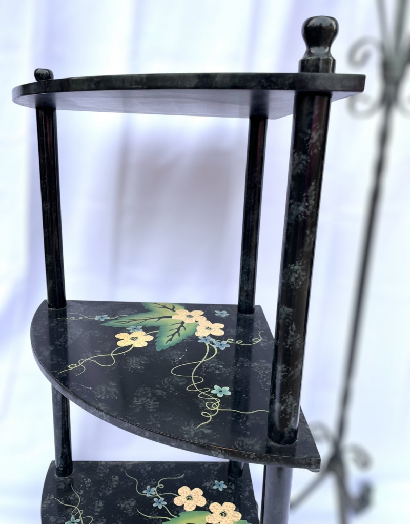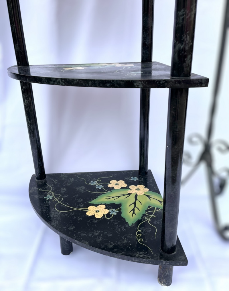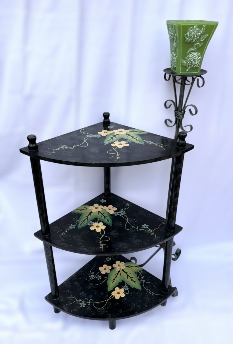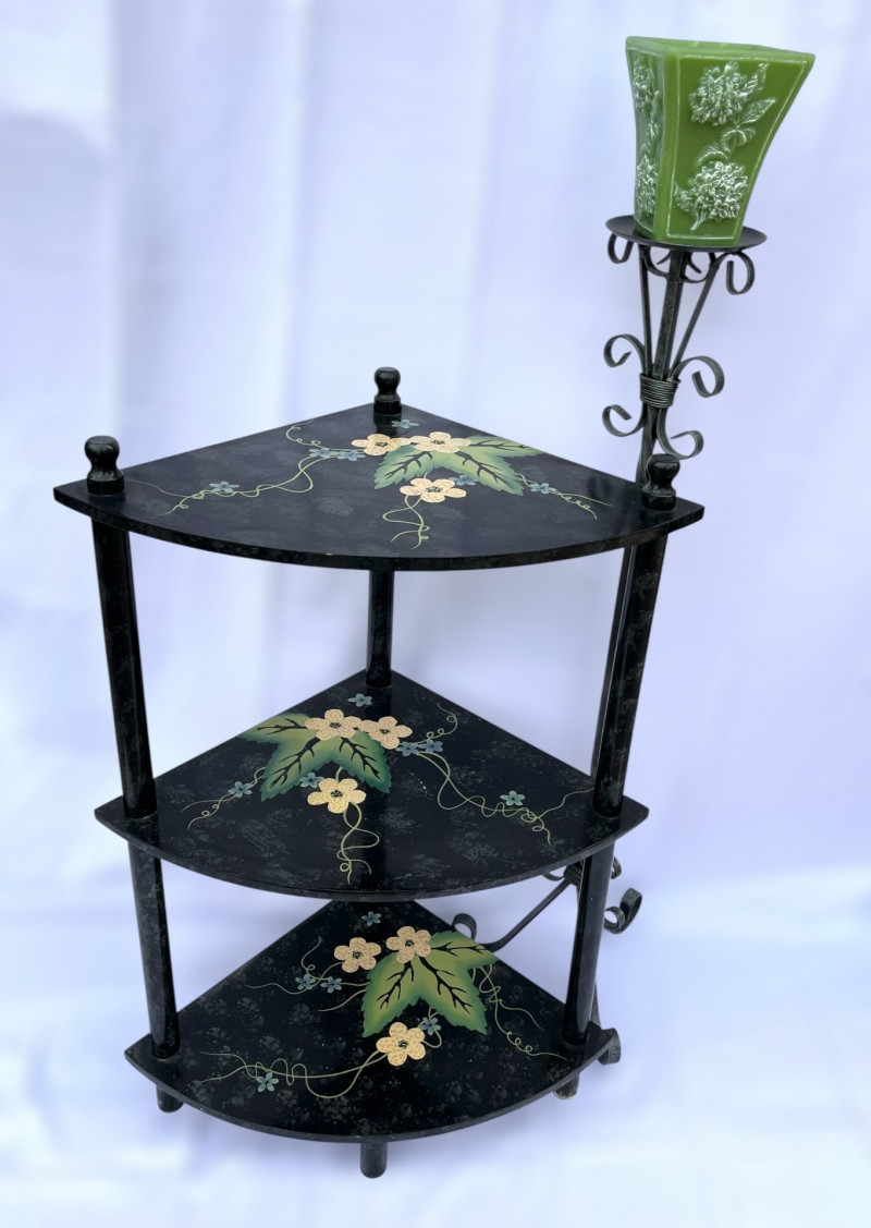 Painted Wood Corner Shelf and Tall Metal Scroll Candle Holder The top shelf is 29" high and each shelf is 15" long. The shelves are hand painted and in good condition. The candle stand is iron and stands 37" tall.