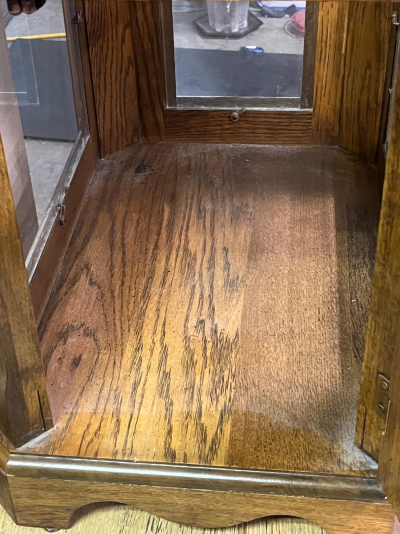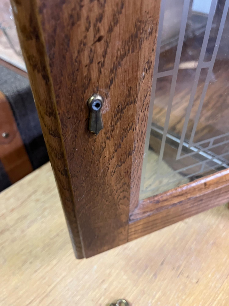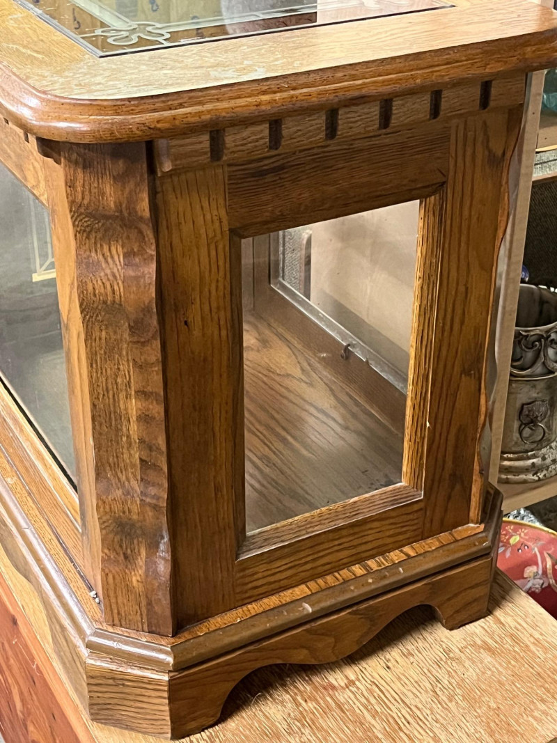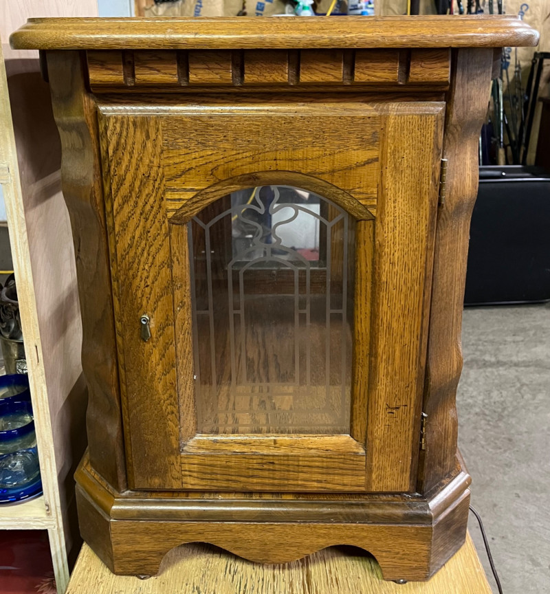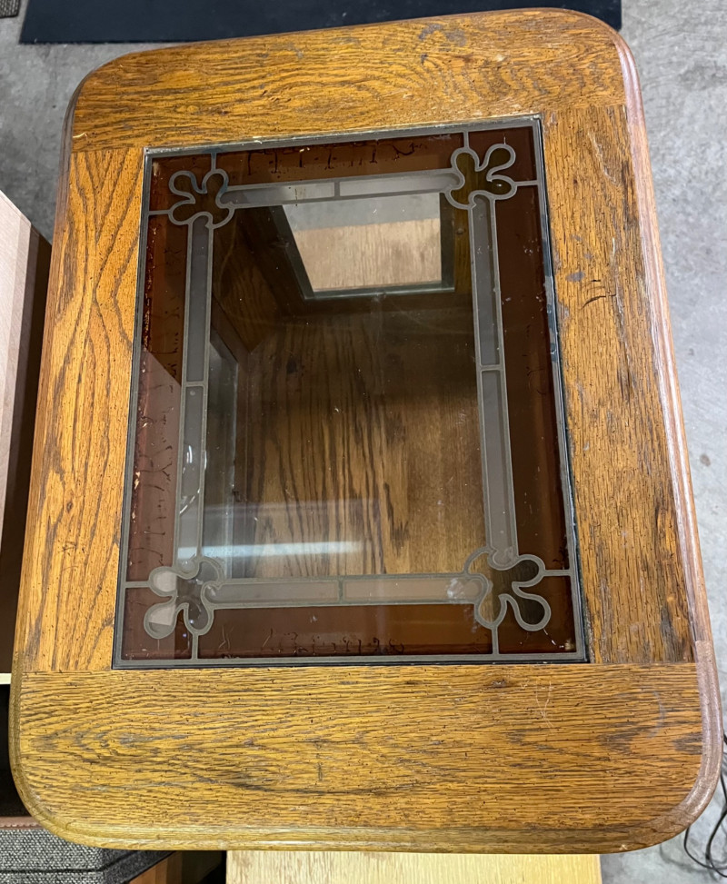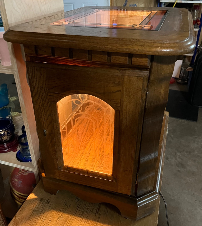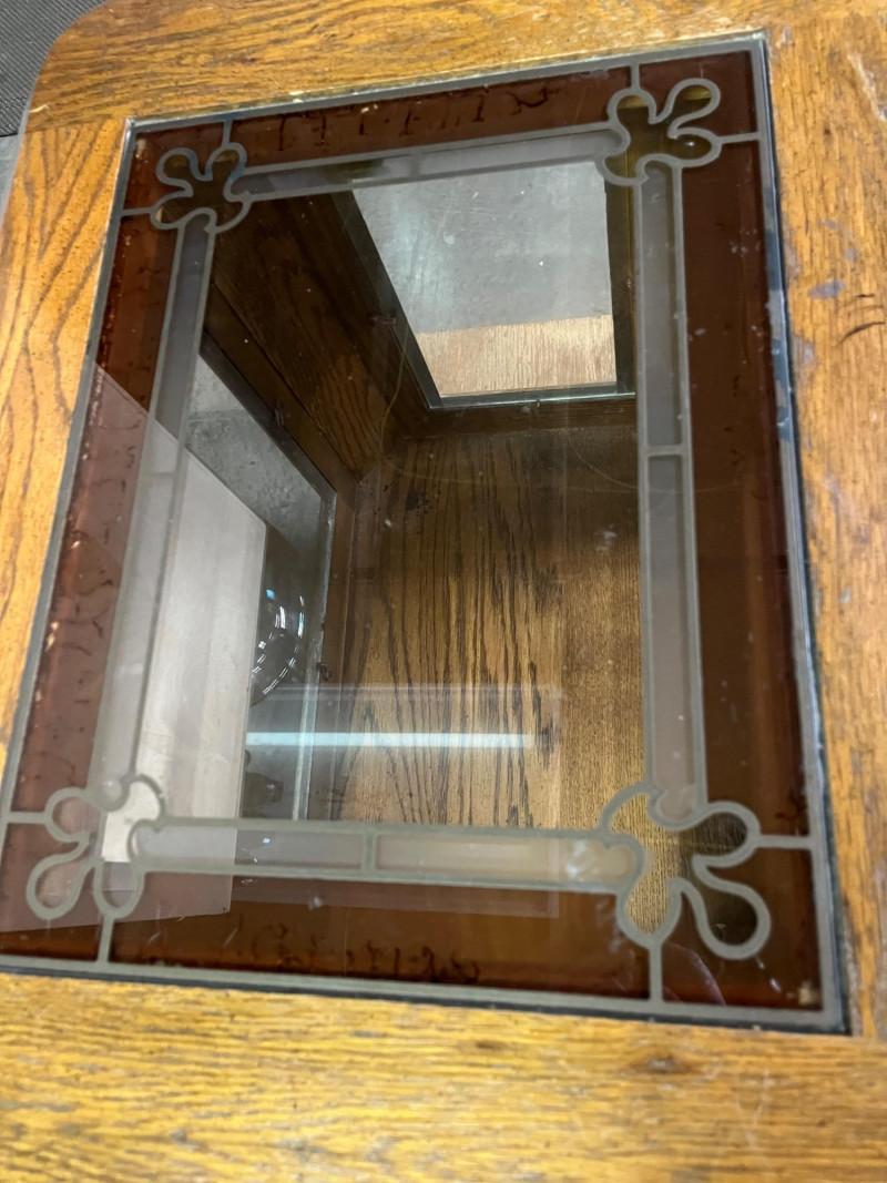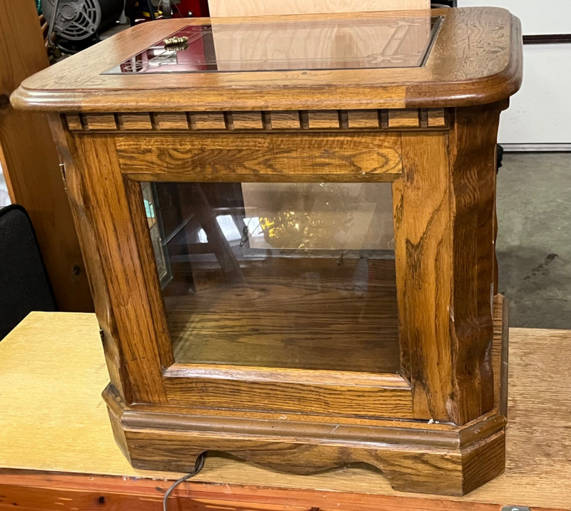 1980's Oak and Glass End Table with Faux Stained Glass and Light Inside Measurements: 22" tall, 18" wide, and 23" deep. The light inside works but the knob on the door is broken off and needs to be replaced. Wood is in excellent condition. .