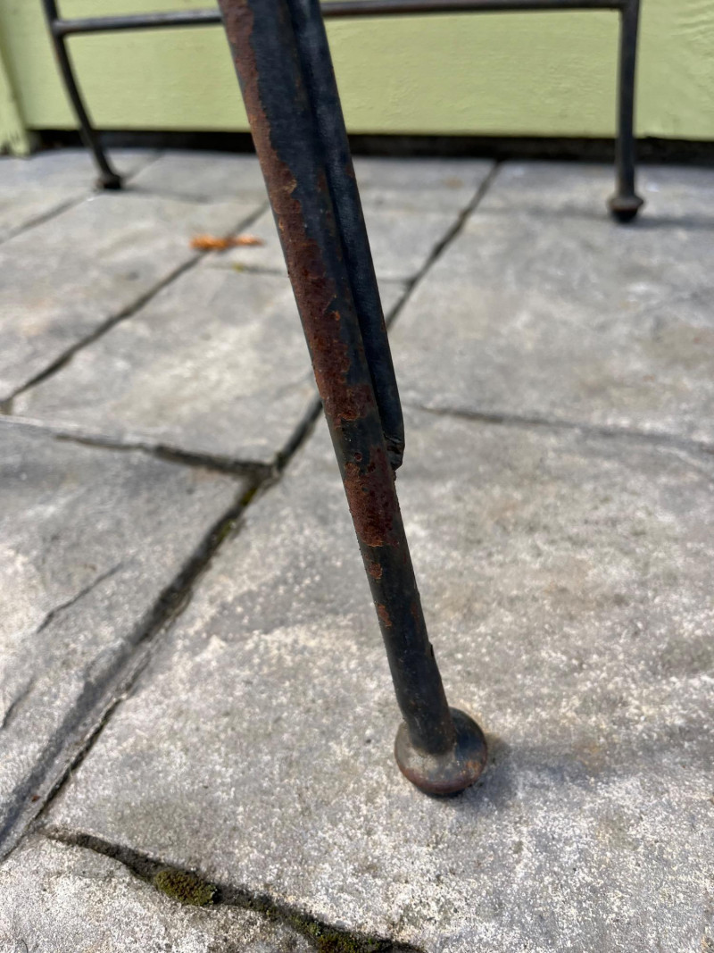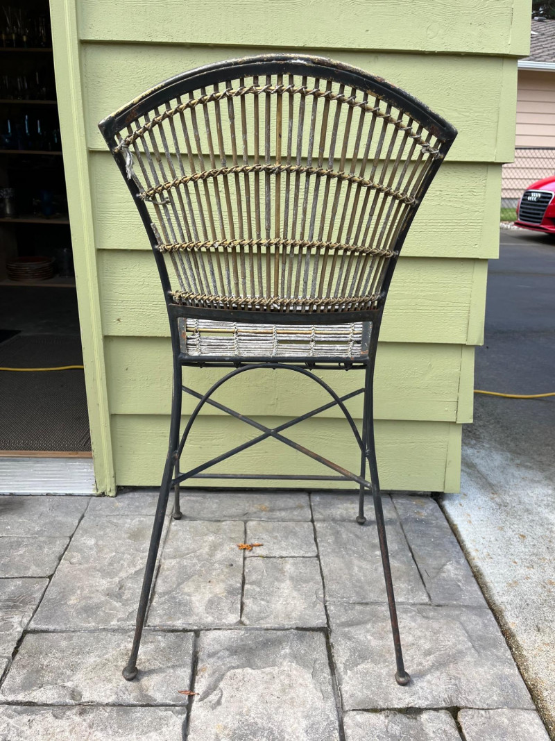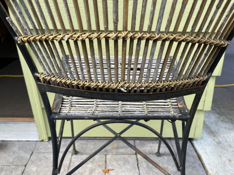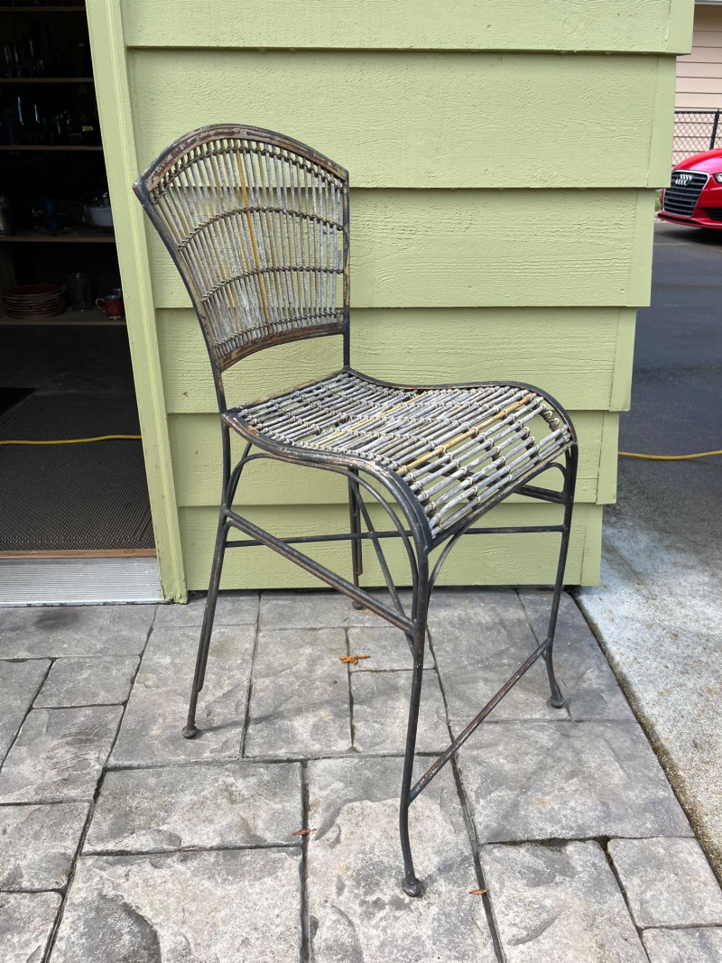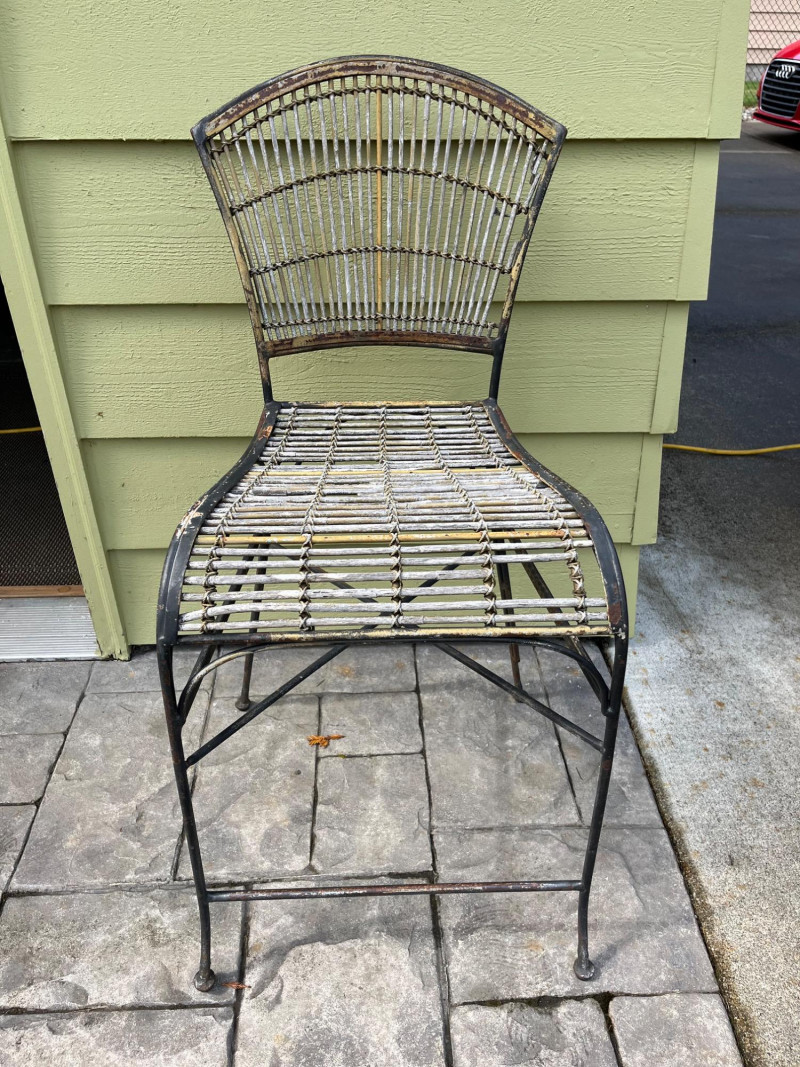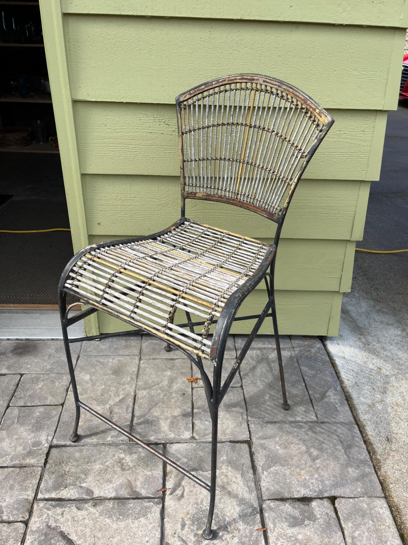 Rustic Iron And Bamboo Bar Height Chair This chair looks rustic but it's incredibly sturdy! The bamboo has a few broken pieces as you can see in photos. The back of this chair is 38" tall and the width is 16".