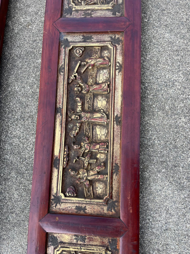 Chinese Hand Carved Wood Trim Pieces The longest (straight narrow) piece is 73 1/2" long and the shorter of the narrow pieces is 45 1/2" long. These two long, narrow pieces have wire hangers on the back. The larger of the two arch/corner pieces is 39" long and the shorter is 37 1/2" long. These two arch/corner pieces do not match in size or design.
