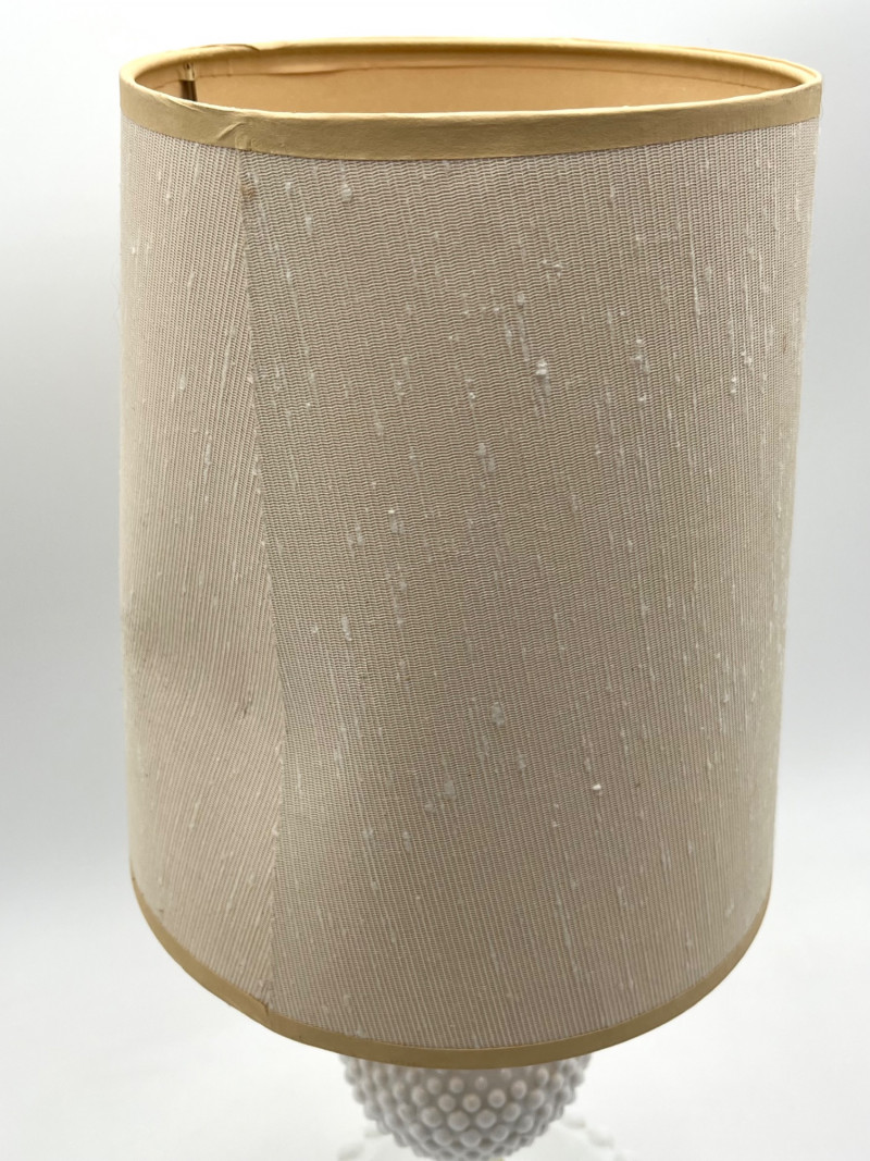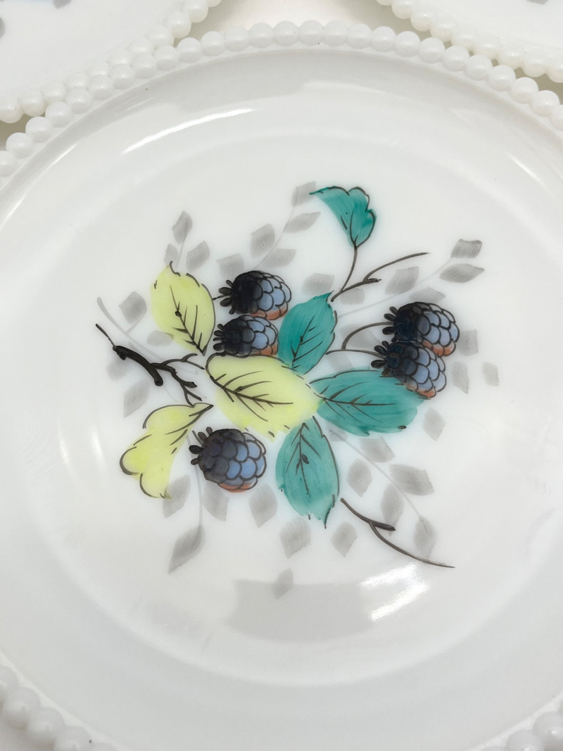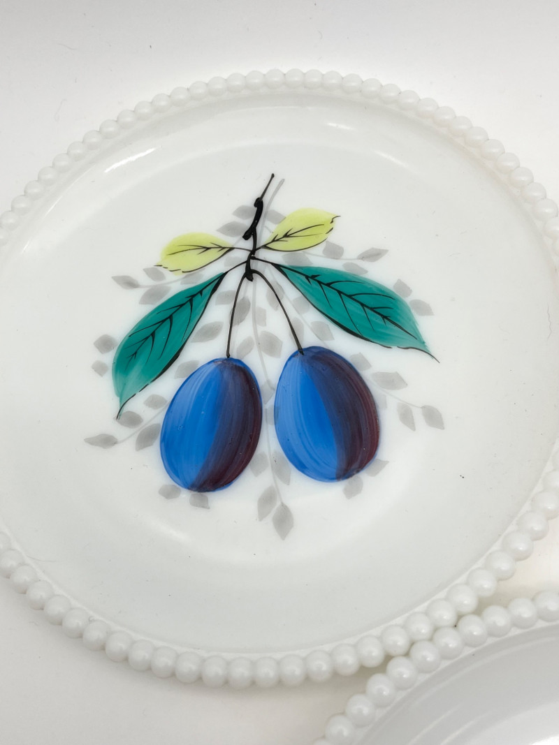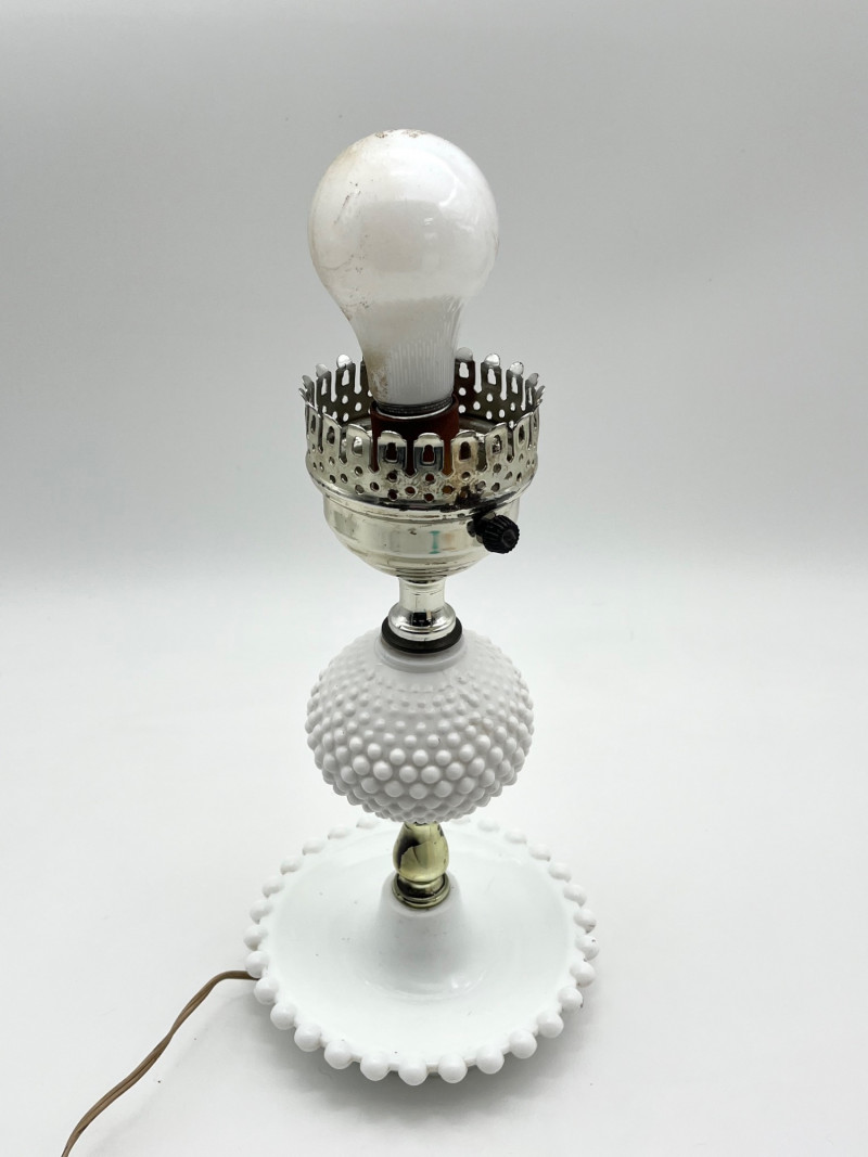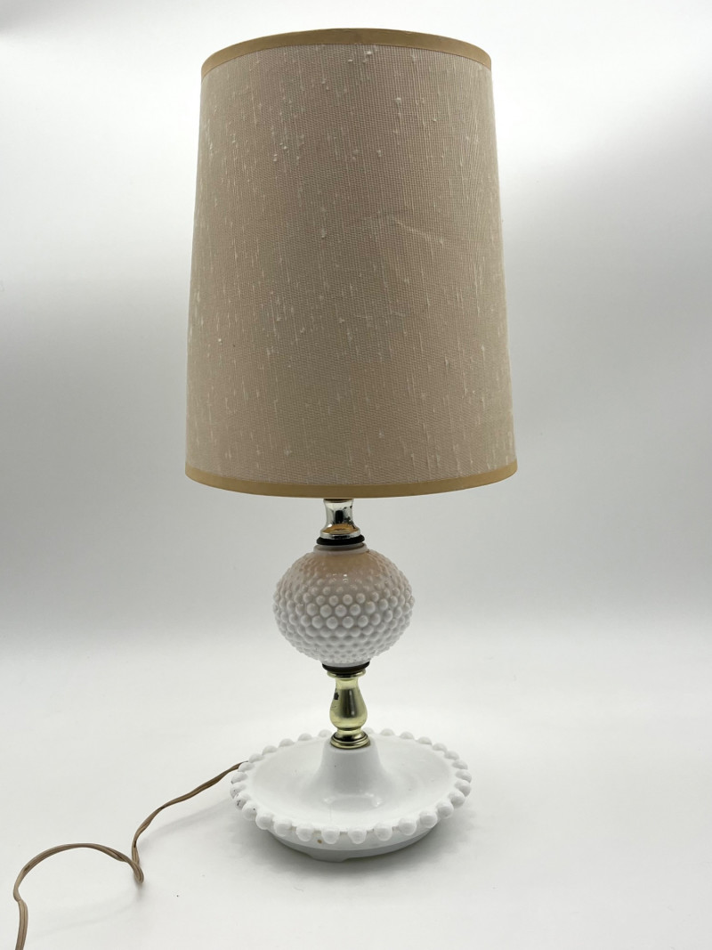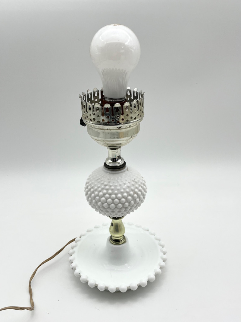 Hobnail Bedside Hobnail Milk Glass Lamp and Beaded Rim Painted Plates The lamp is in good cosmetic and working condition and it measures 18" with the shade, 11" without. Plates are made by Westmoreland, circa mid-1940's. The designs painted on them are original making them safe to use.