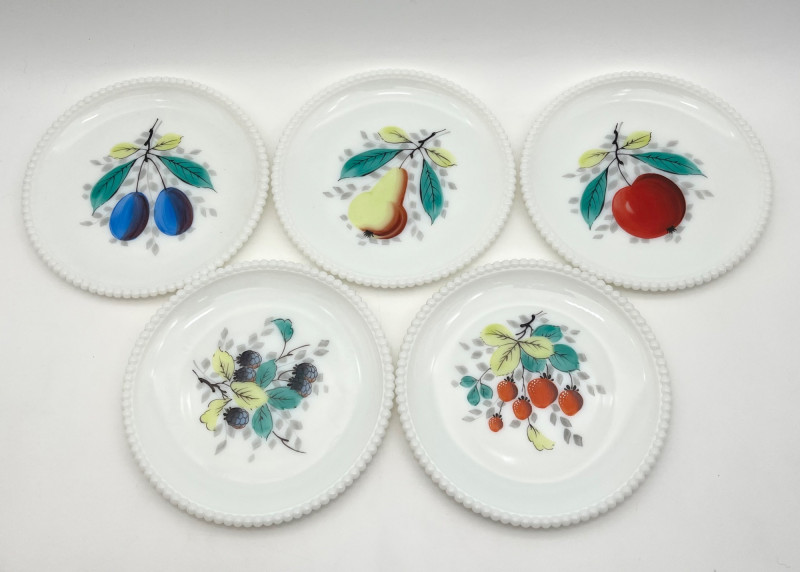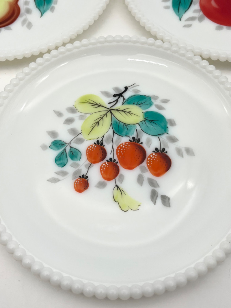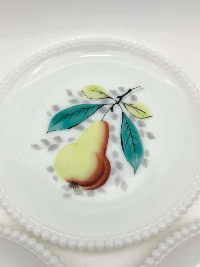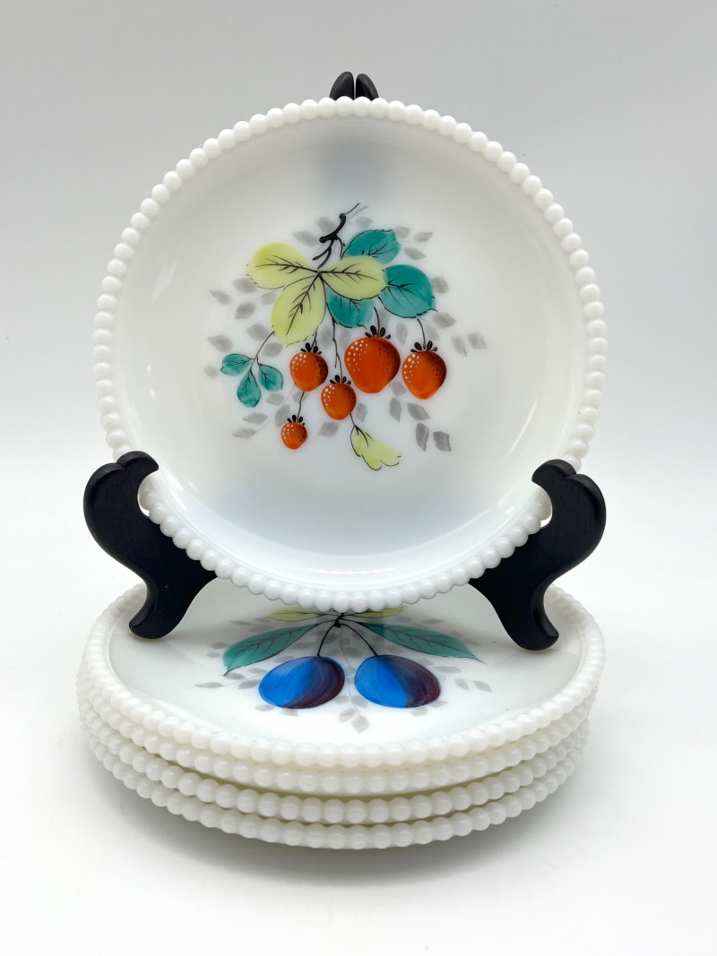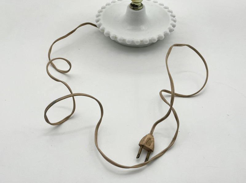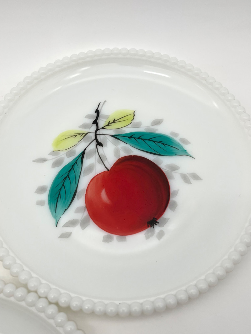 Hobnail Bedside Hobnail Milk Glass Lamp and Beaded Rim Painted Plates The lamp is in good cosmetic and working condition and it measures 18" with the shade, 11" without. Plates are made by Westmoreland, circa mid-1940's. The designs painted on them are original making them safe to use.