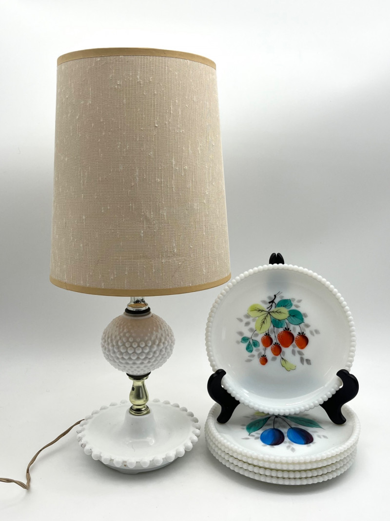 Lot # 119 - Hobnail Bedside Hobnail Milk Glass Lamp and Beaded Rim Painted Plates