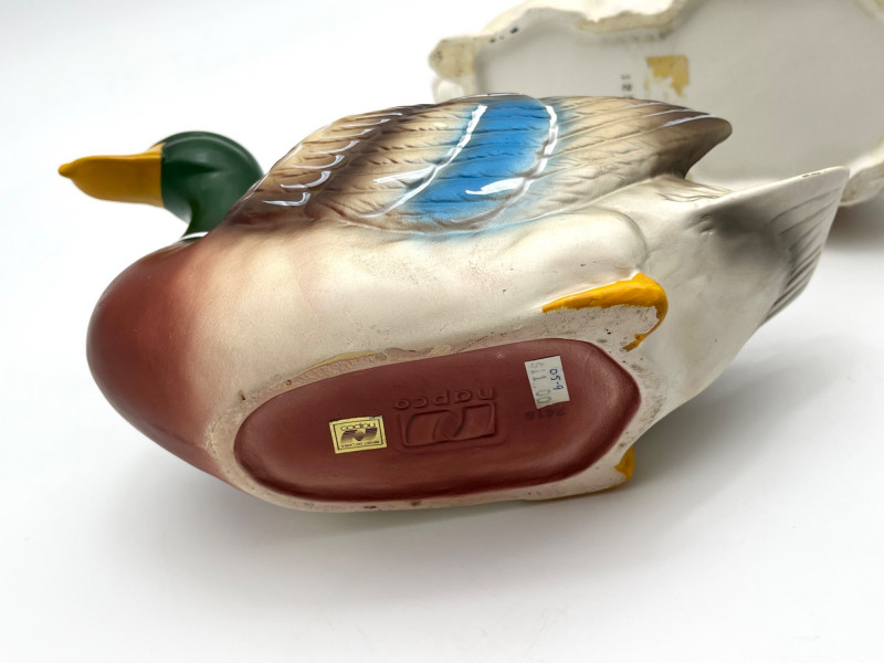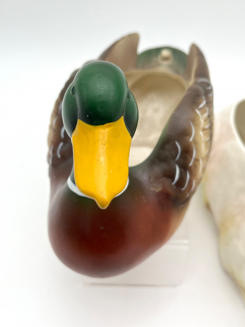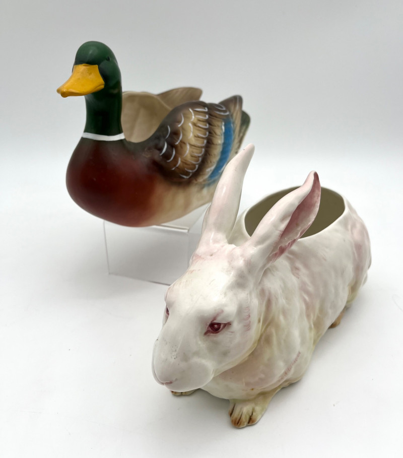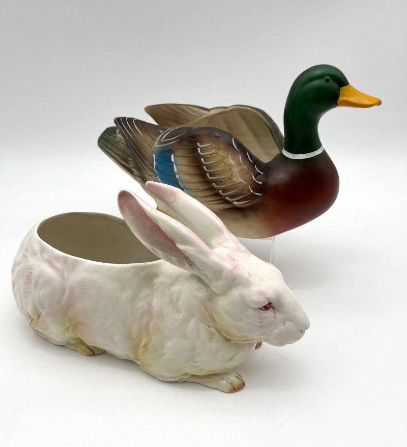 Mallard Duck and Bunny Ceramic Planters These are about 10" long 6" wide. The Mallard was made by Napco and the rabbit looks to be an older European ceramic. Both are in good condition with no cracks, chips, or crazing.
