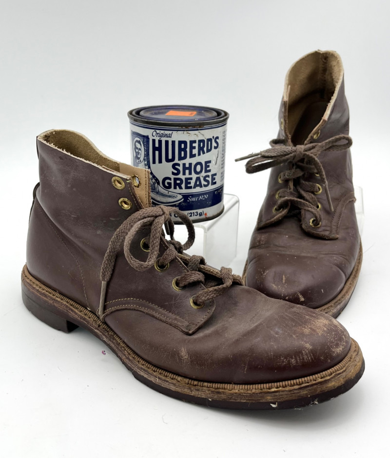 Antique Airtex Shoes and a Tin of Huberd's Shoe Greese Age and size of shoes is unknown.