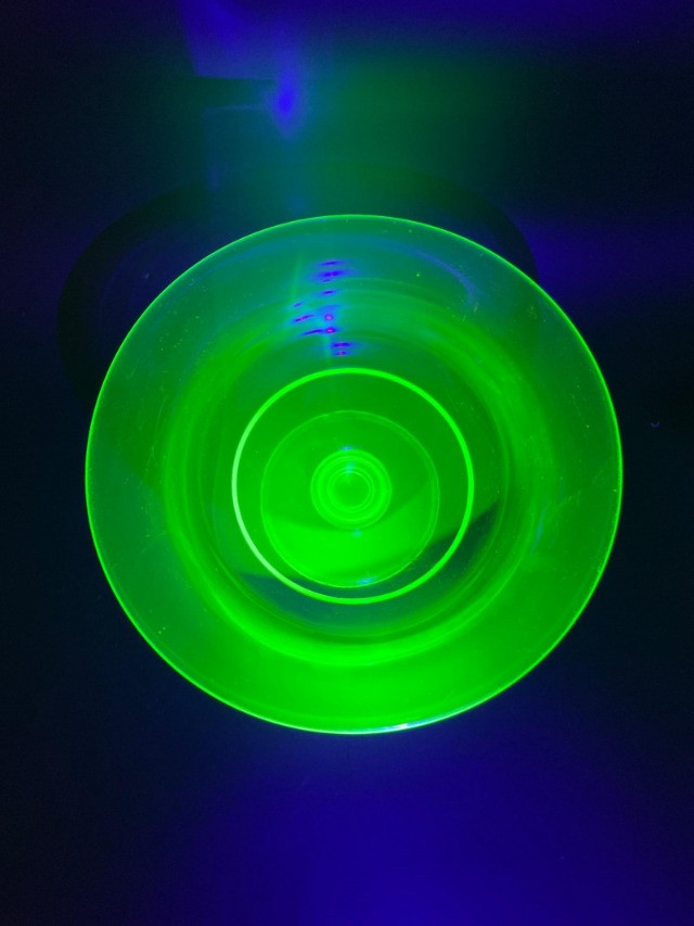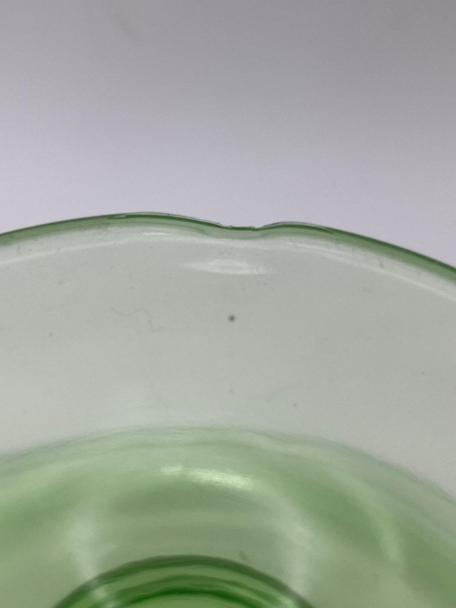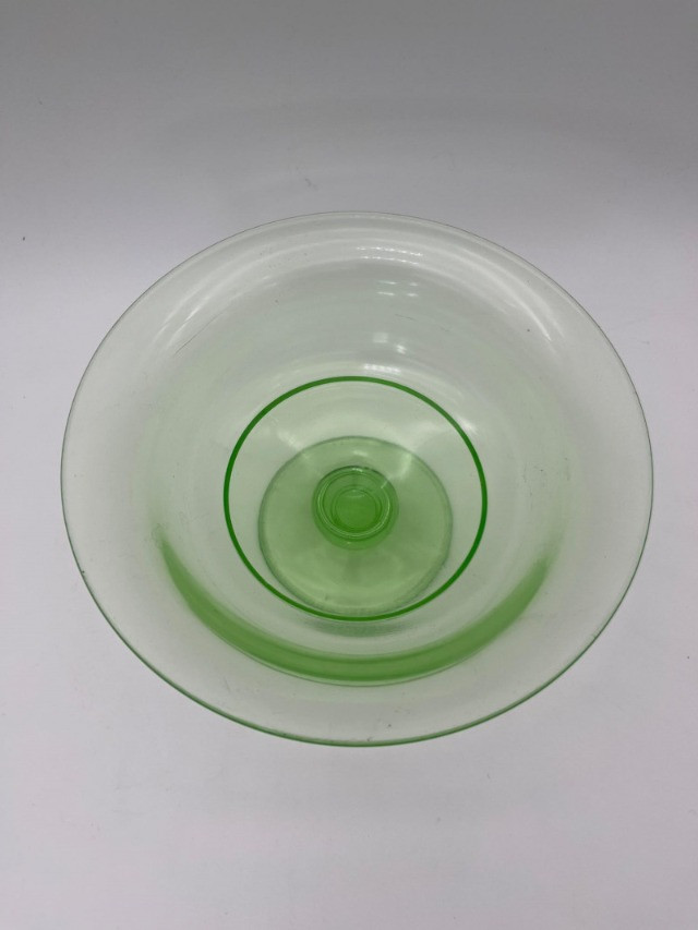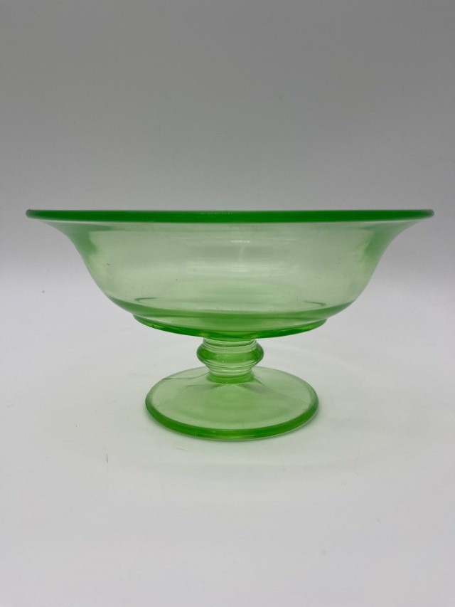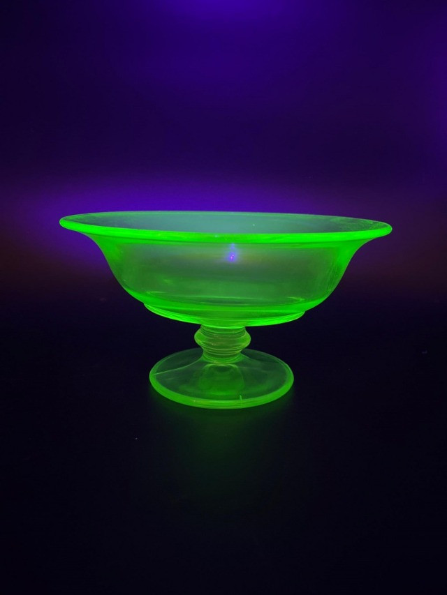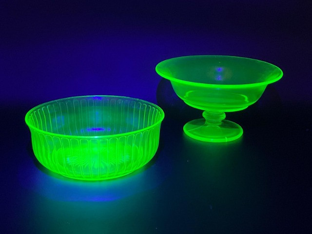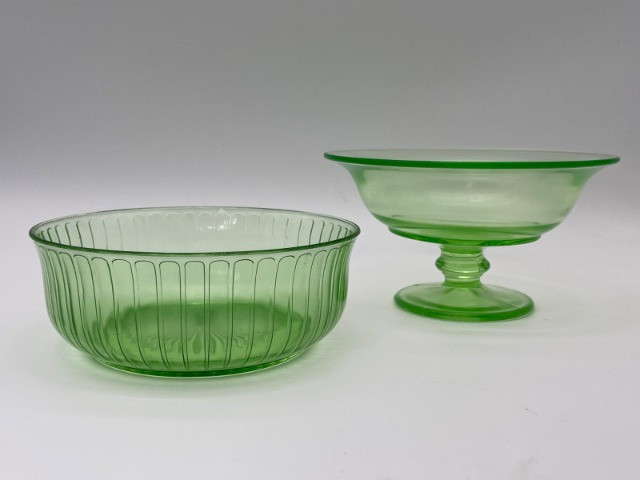 Uranium Glass Serving and Console Bowl Pair This lot includes two large uranium glass bowls, one a Hazel Atlas serving bowl from the 1930's, and the other an elegant console bowl likely from the turn of the 20th century. Both glow brilliantly in black light as can be seen in photos. Also noted in photos, the console bowl has a chip on the bottom of its foot, shown close up in the last photo.