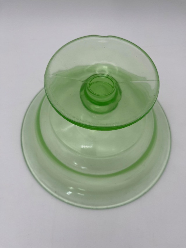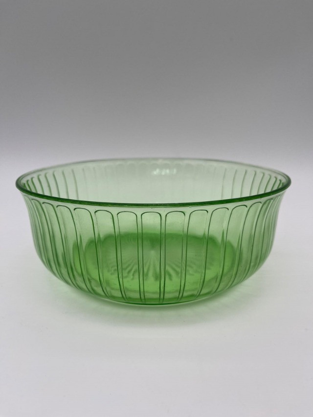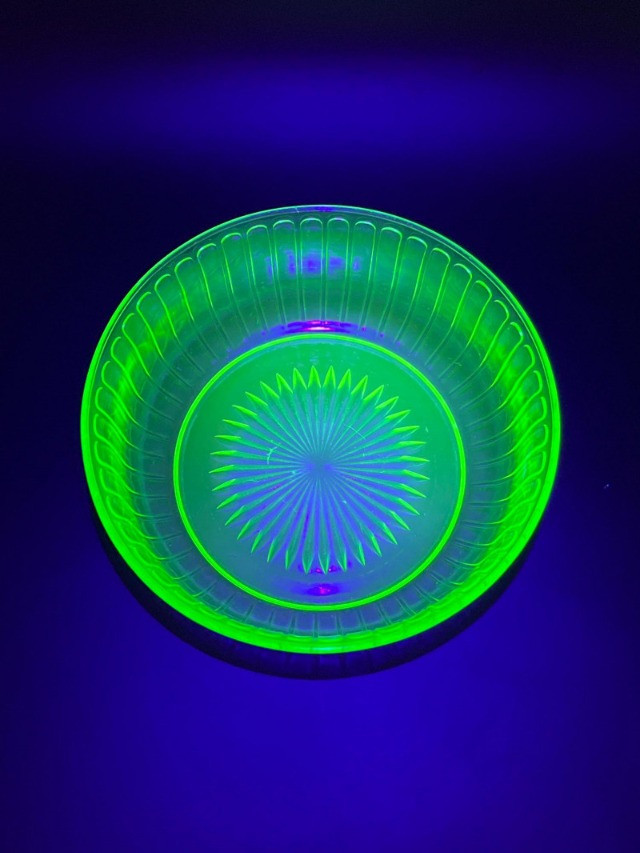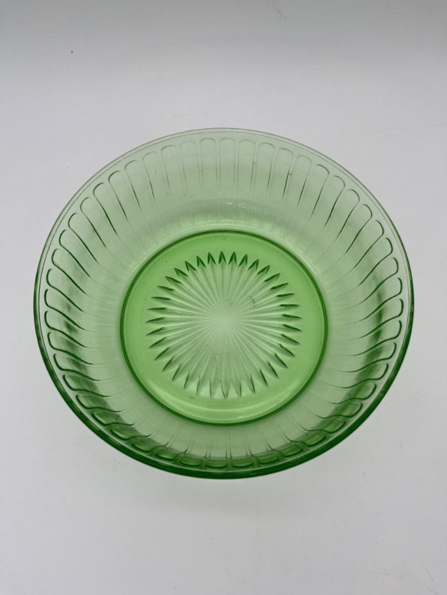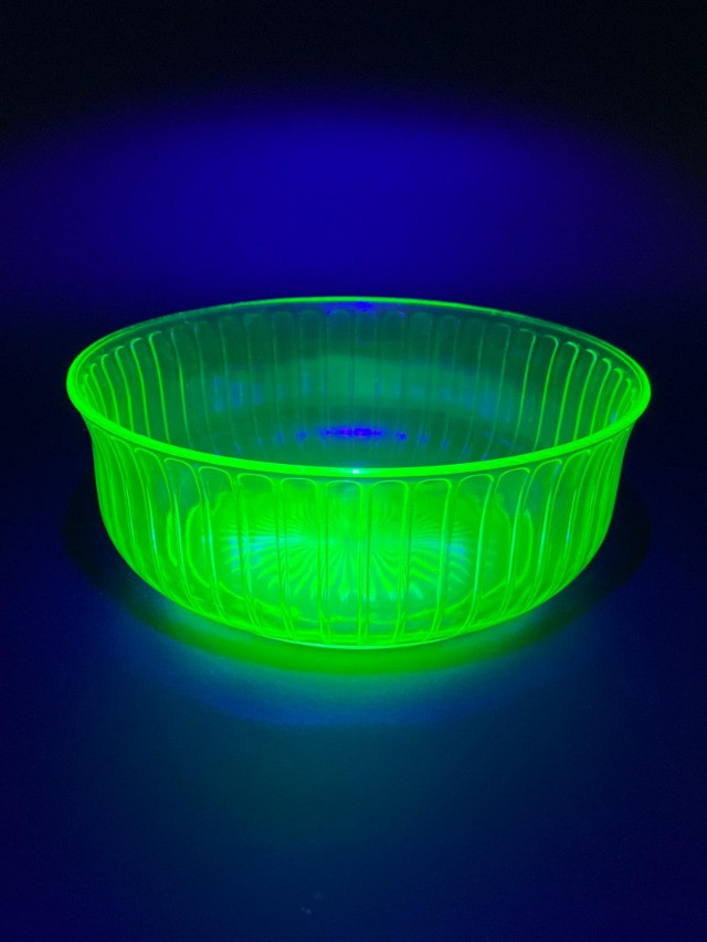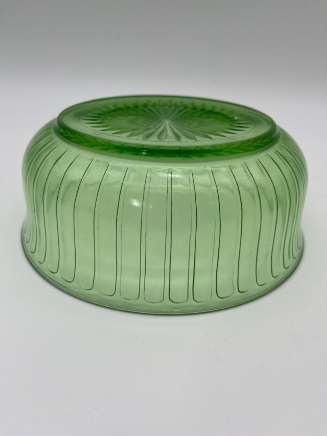 Uranium Glass Serving and Console Bowl Pair This lot includes two large uranium glass bowls, one a Hazel Atlas serving bowl from the 1930's, and the other an elegant console bowl likely from the turn of the 20th century. Both glow brilliantly in black light as can be seen in photos. Also noted in photos, the console bowl has a chip on the bottom of its foot, shown close up in the last photo.
