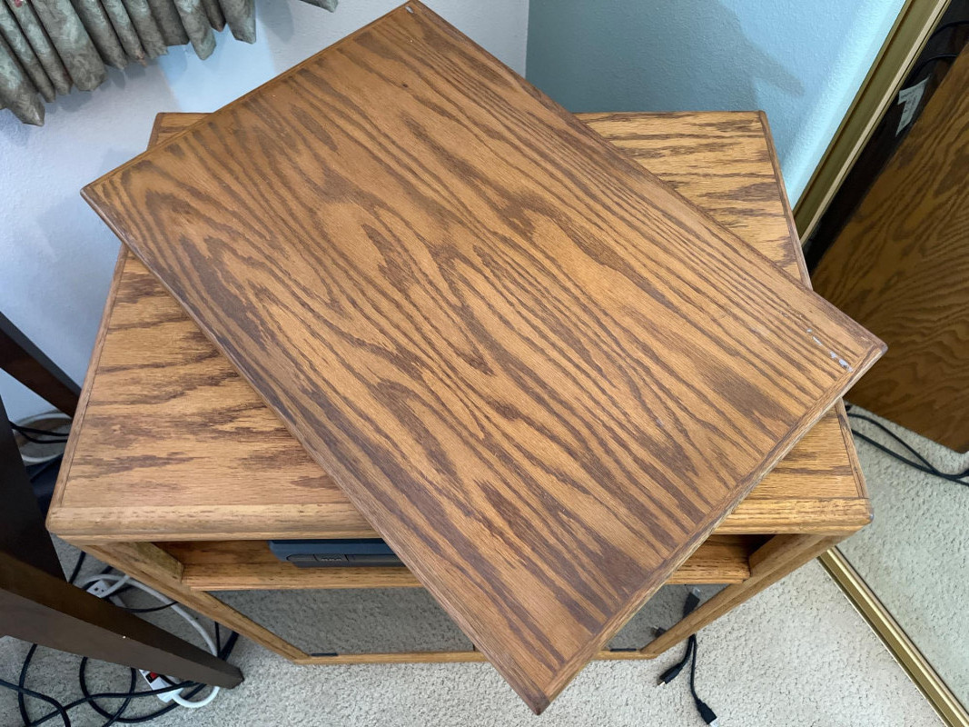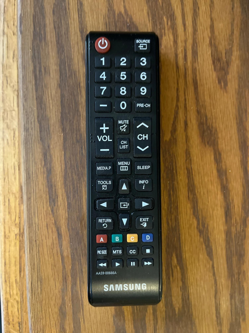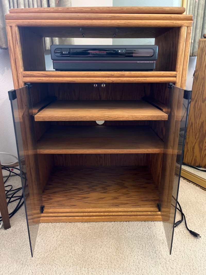 32” Samsung Flatscreen TV with VCR on Cabinet with Swivel Top The construction of the cabinet looks to be solid oak and the glass doors are slightly tinted. There is a remote for the TV but not for the VCR. Both the TV and VCR are tested and in working condition. The TV is a little too big for the top and so it has to be placed at an angle but since the top swivels, this isn't an issue. All power and connecting cords included.