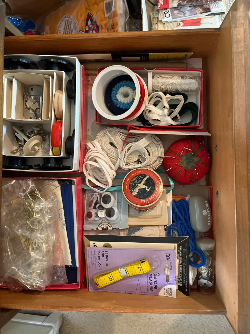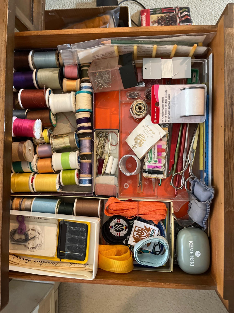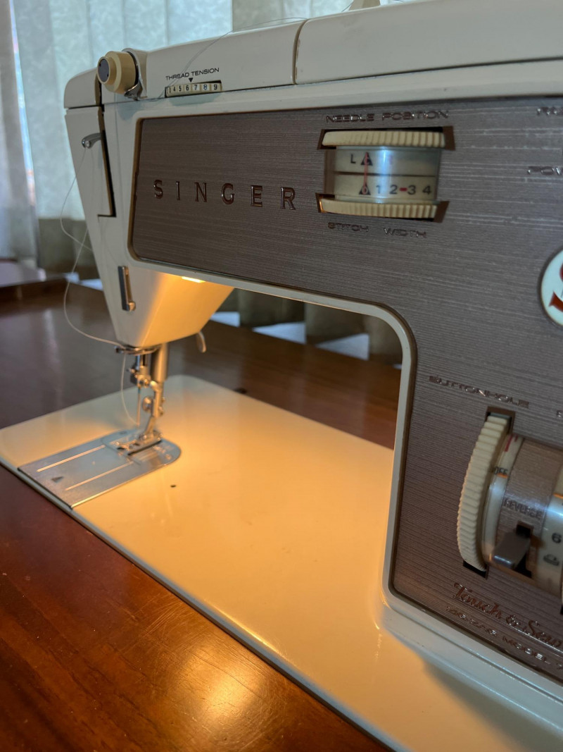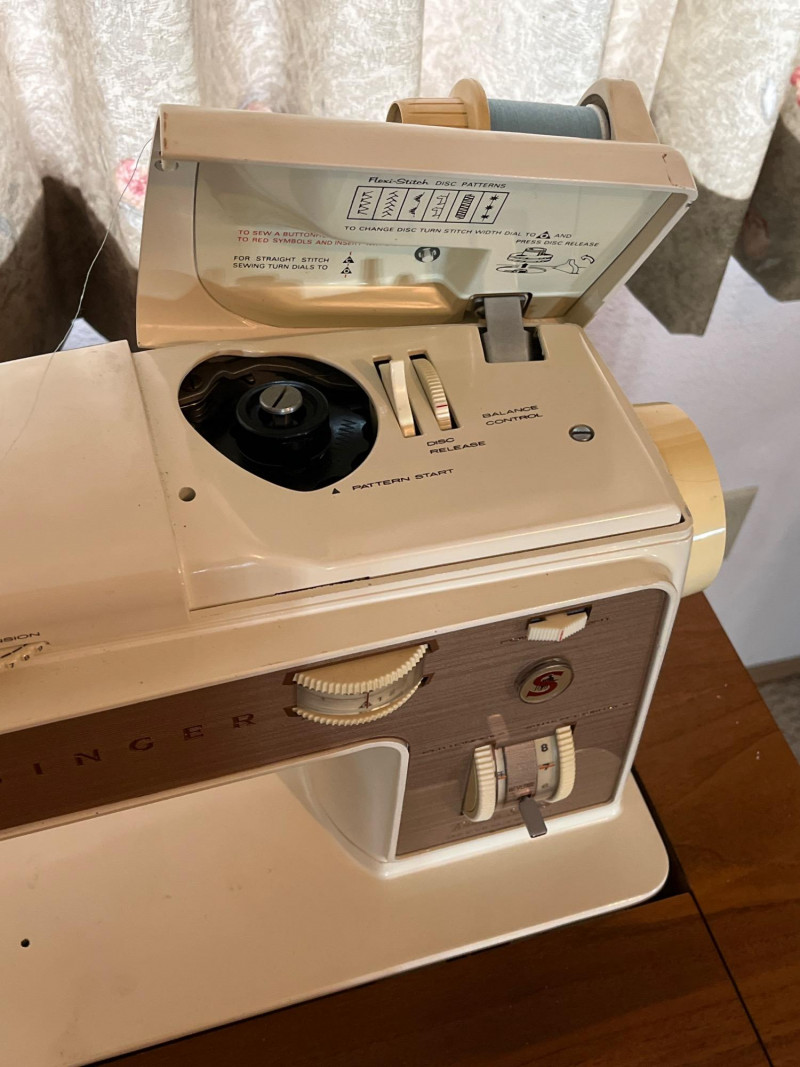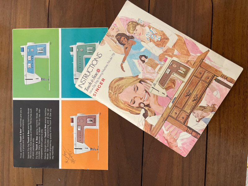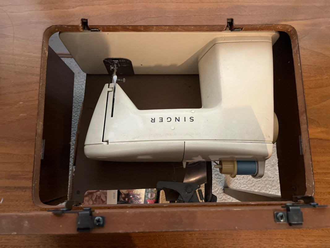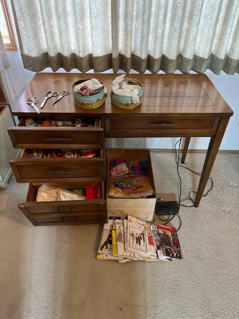 Mid-Century Modern Sewing Desk/Table and Singer Machine with Notions The desk is great because it doubles as an actual writing desk. When I first saw the desk, it didn't even occur to me that it was a sewing table because there was a computer and monitor on it! The table is very sturdy and the sewing machine is in working condition. All notions such as the scissors (right-handed), pinking shears. pins, thread, measuring tape, patterns, and other odds and ends shown here are included. Includes original operation manual!