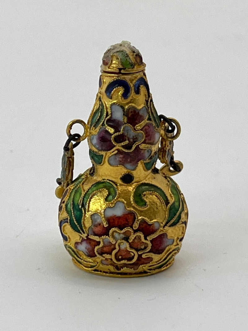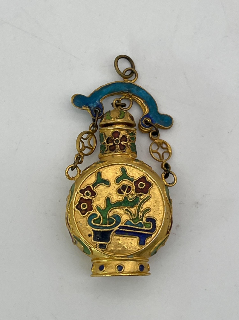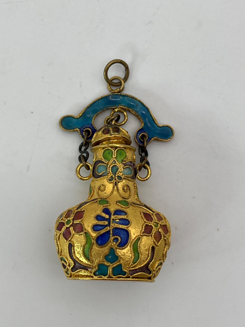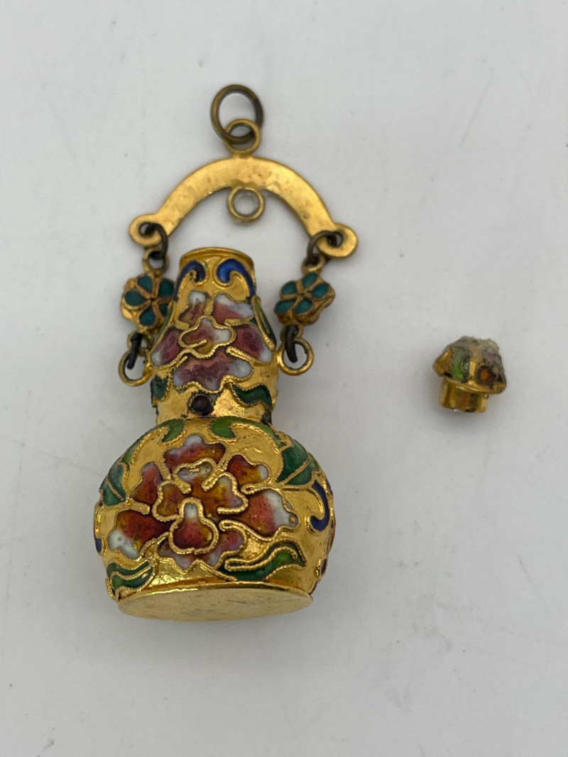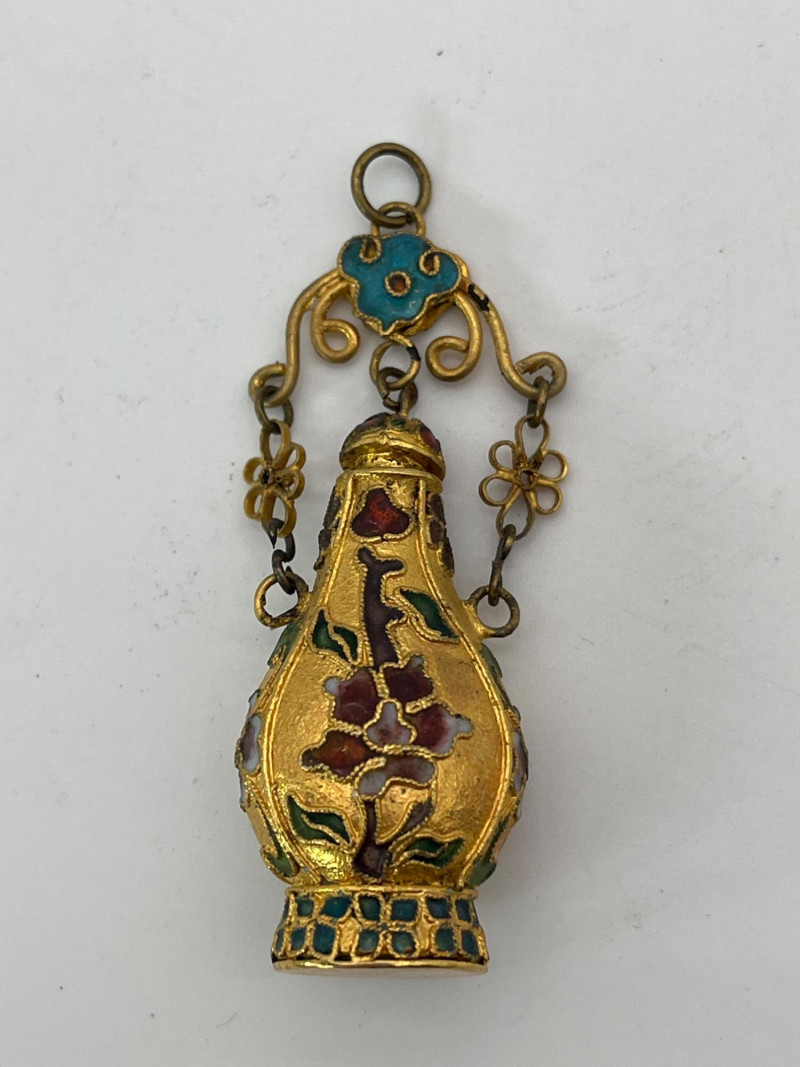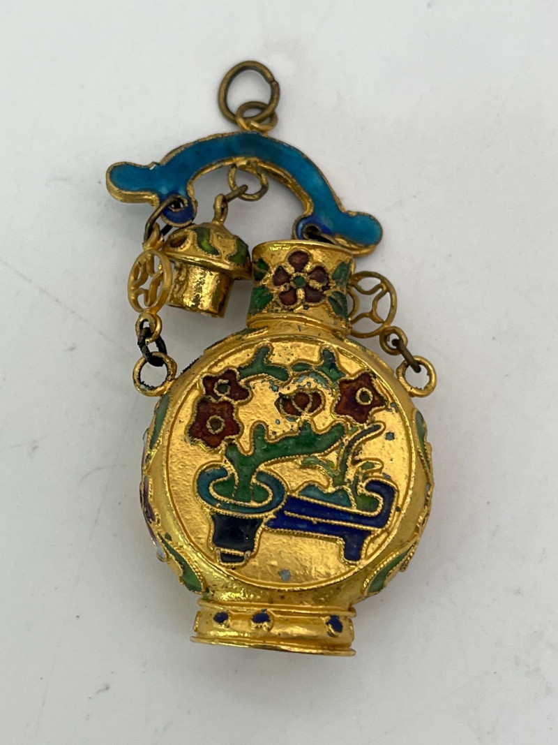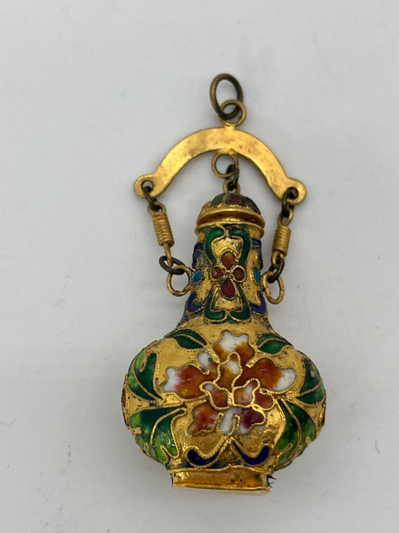 Miniature Cloisonné Snuff Bottle Pendants These are only about 2" tall. All have a fitted lid. On all but one, the lid is attached to the pendant top ring. These look to be brass with enamel paint.